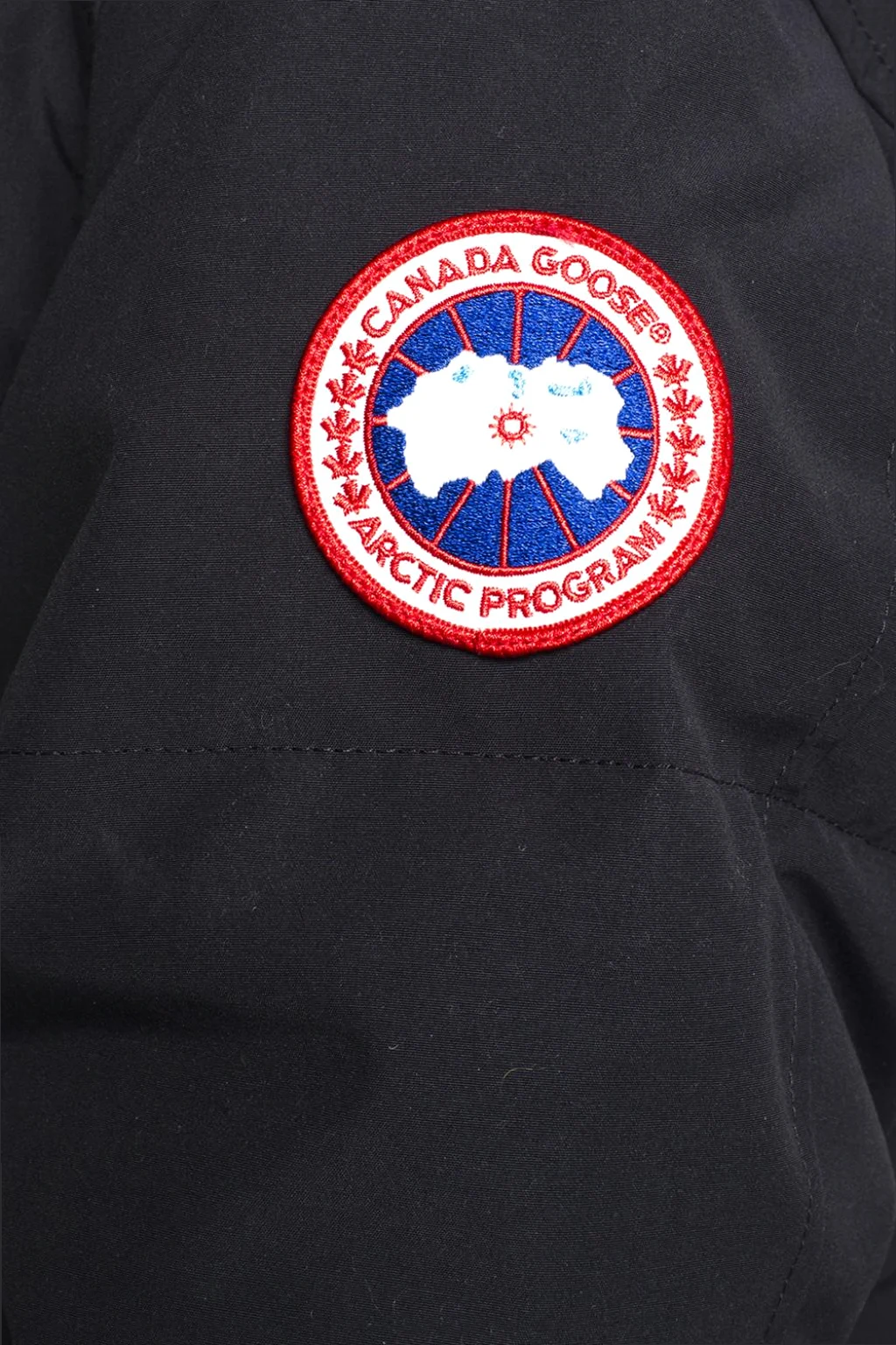 Granatowa, pikowana, puchowa kurtka z kapturem ściąganym trokami, model 'Macmillan' Canada Goose. Zapinana na dwubiegunowy zamek i zatrzaski. Na ramieniu ozdobiona kolorową naszywką z logo. Z przodu dwie kieszenie zapinane na zamek. Długie rękawy zakończone ściągaczami. Metalowe elementy wraz ze ściągaczami w kolorze czarnym. Zakres temperatur -10°C do -20°C.