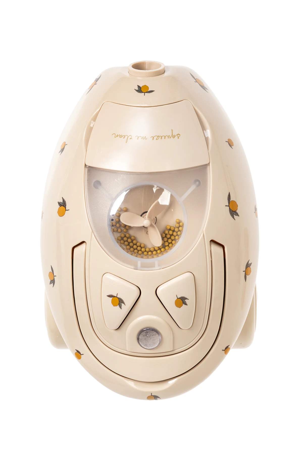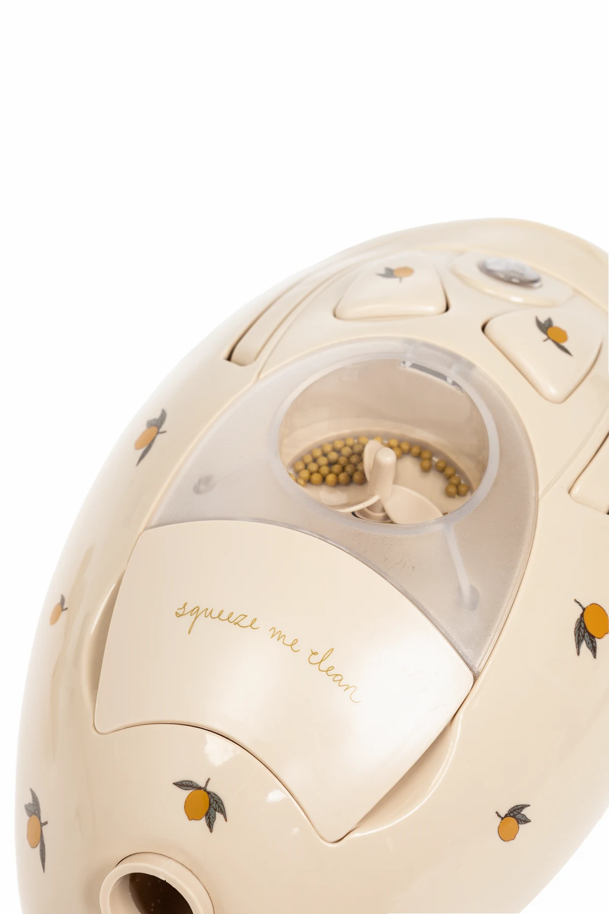 Produkt wyróżnia się opływowym, owalnym kształtem z dwoma trójkątnymi i jednym okrągłym przyciskiem, na których również widnieją cytrynki. Przezroczysta, okrągła część na górze odkurzacza pozwala zobaczyć wewnętrzne elementy, takie jak małe kulki i wiatraczek, co dodatkowo wzbogaca doznania wizualne podczas zabawy.