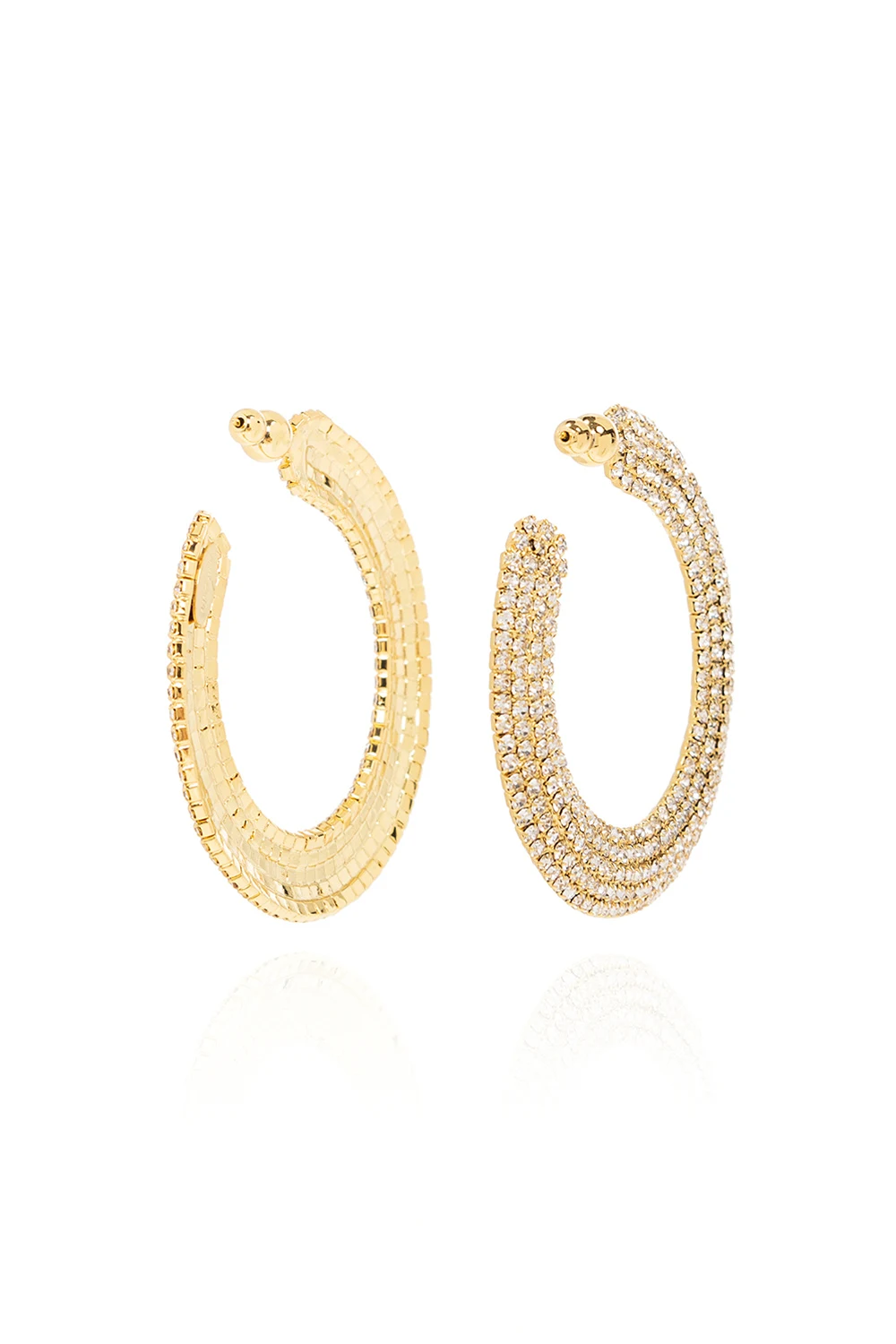 Okrągłe kolczyki w kolorze złotym, model ‘Mira’ Cult Gaia. Wykonane z mosiądzu. Ozdobione połyskującymi kryształami. Zapięcie na sztyft z charakterystyczną, podwójną kulką.