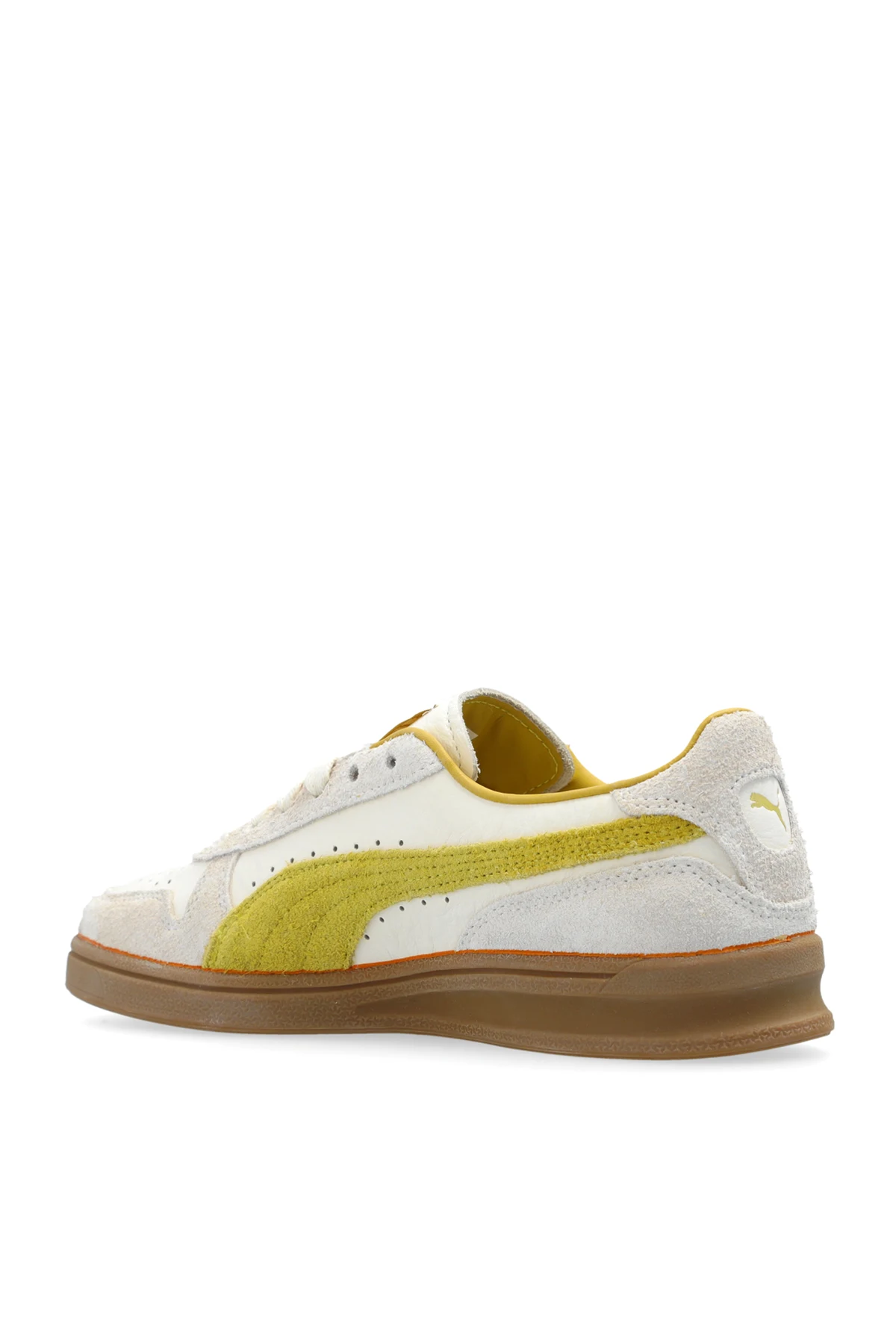 Wierzchnia część buta, wykonana z materiału przypominającego zamsz oraz skórę, wzbogacona jest perforowanymi detalami, które zapewniają znakomitą wentylację. Charakterystyczny żółty pasek na boku oraz duże logo Puma na języku i pięcie podkreślają autentyczność marki.