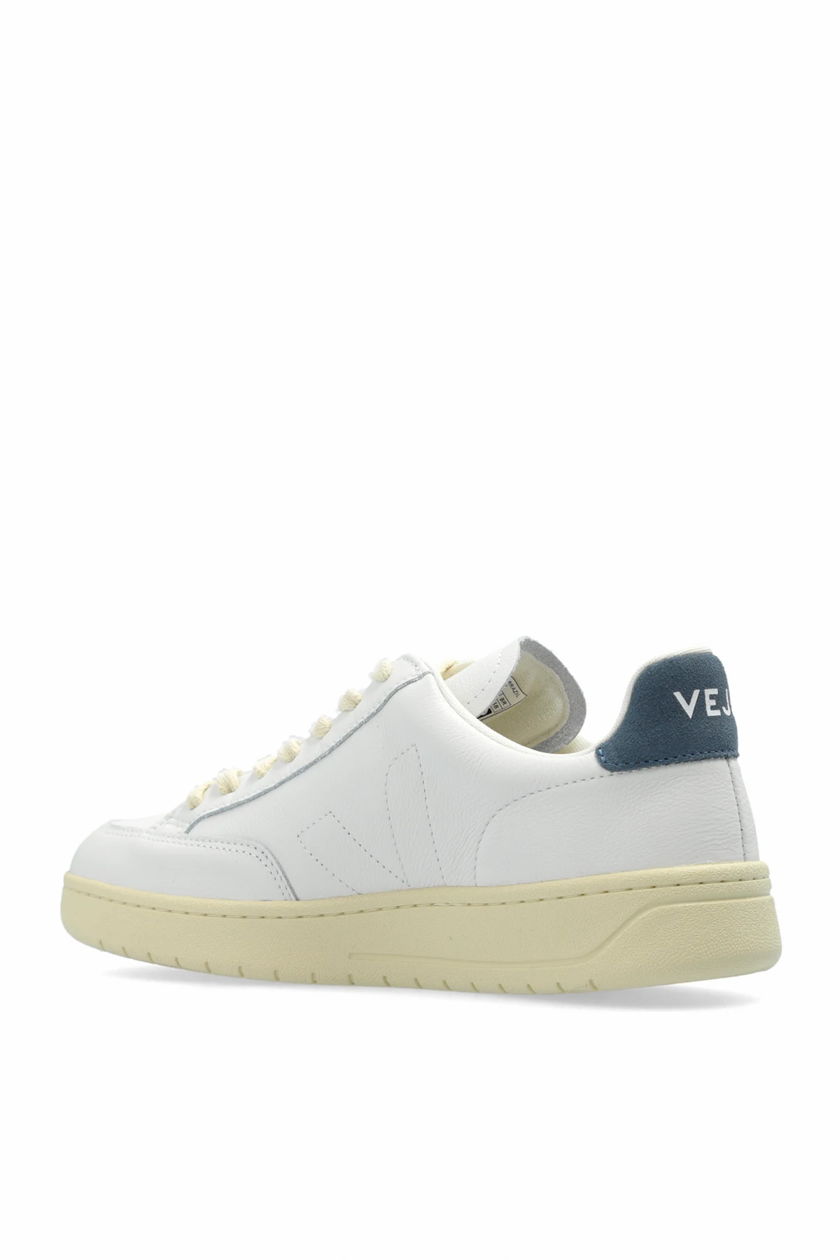 Dominujący kolor butów to biały, z delikatnymi kremowymi akcentami na podeszwie i sznurowadłach. Subtelne logo „V” w kolorze białym, zszyte na zewnętrznej stronie butów, dodaje im elegancji. Na pięcie znajduje się granatowa wstawka z białym logo marki, a na bocznej części butów widnieje złoty napis „V-12”, charakterystyczny dla tego modelu.