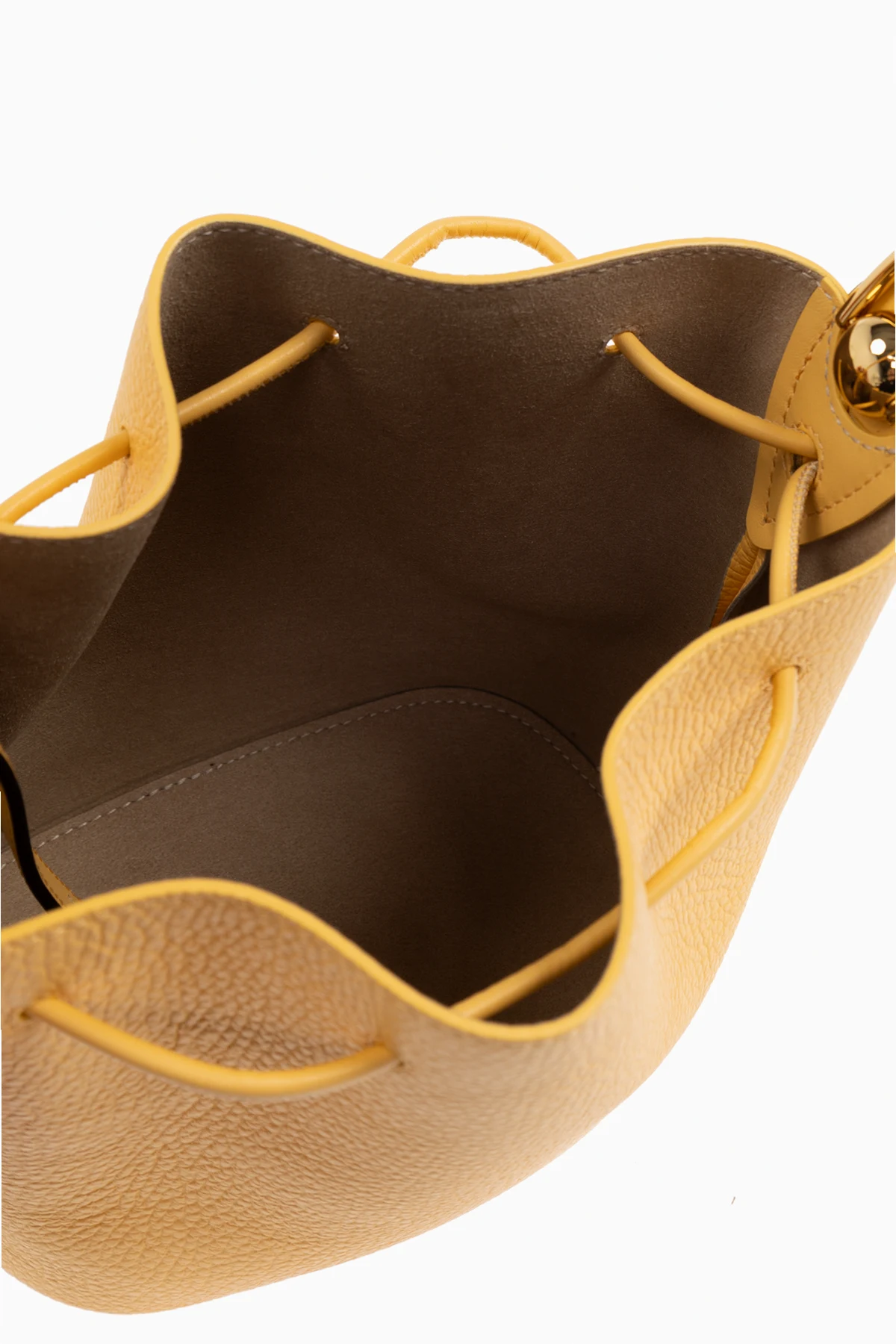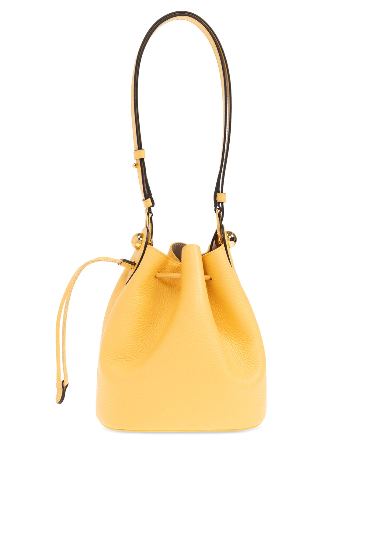 Wykonana z fakturowanej skóry, zewnętrzna powłoka torby emanuje luksusem, podkreślonym delikatnymi marszczeniami. Ściągana trokami, zapewnia wygodę i bezpieczeństwo przechowywania. Metalowe elementy w złotym kolorze dodają jej subtelnego blasku, współgrając z regulowanym paskiem na ramię, co umożliwia personalizację sposobu noszenia.