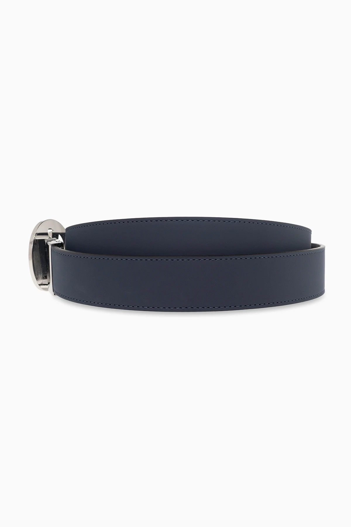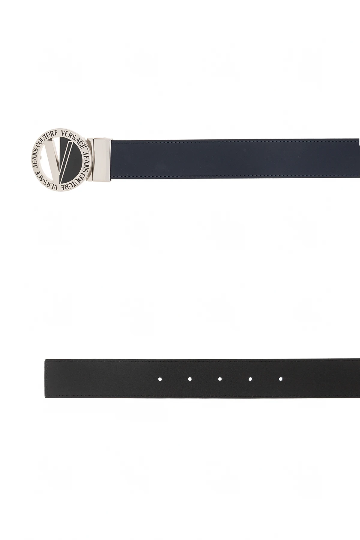 Dwustronny pasek w kolorze czarnym i granatowym Versace Jeans Couture. Wykonany ze skóry i materiału imitującego skórę. Klamra w kolorze srebrnym z wytoczonym logo.