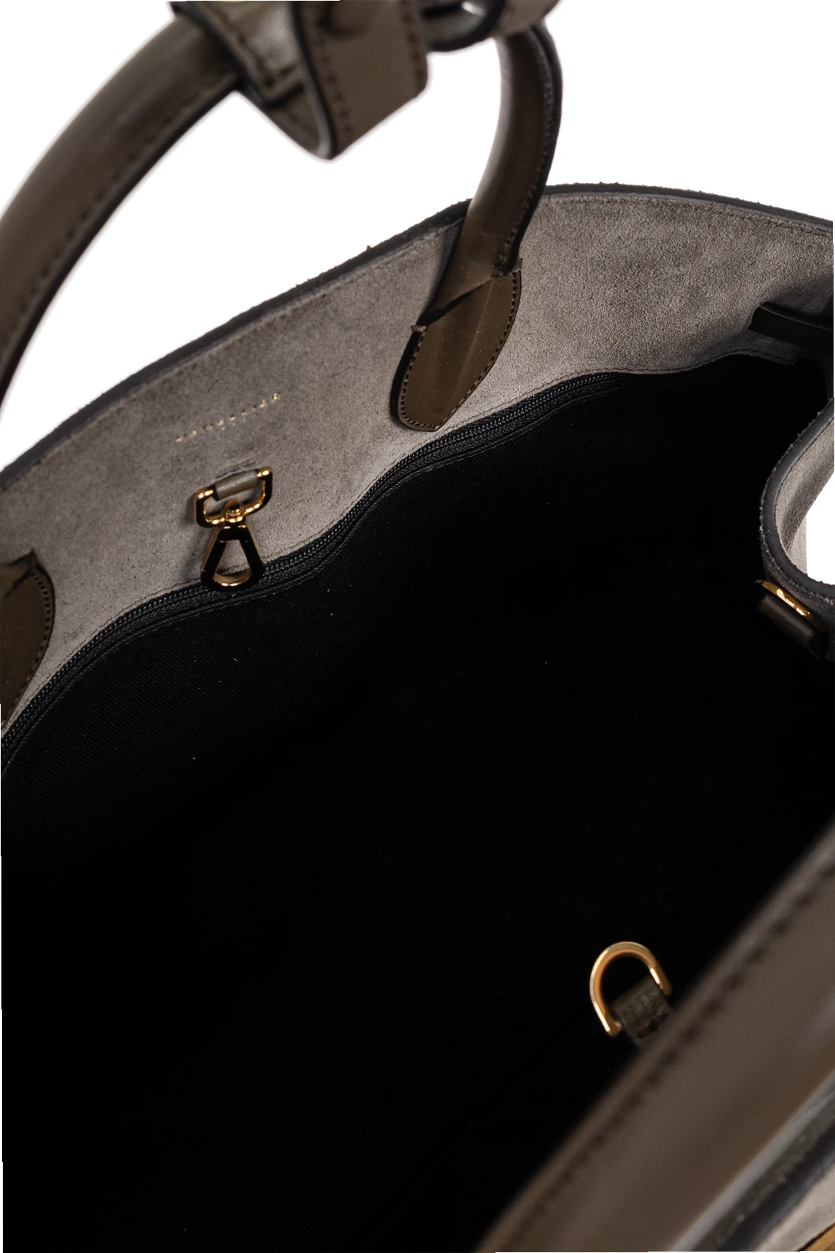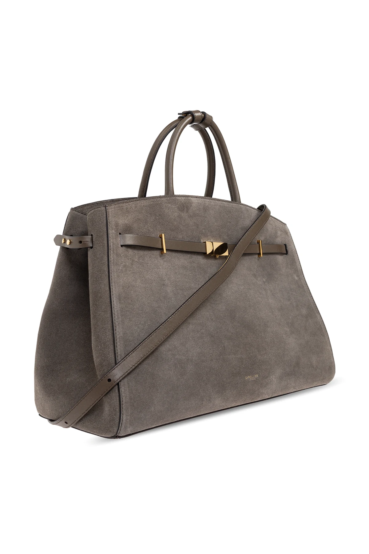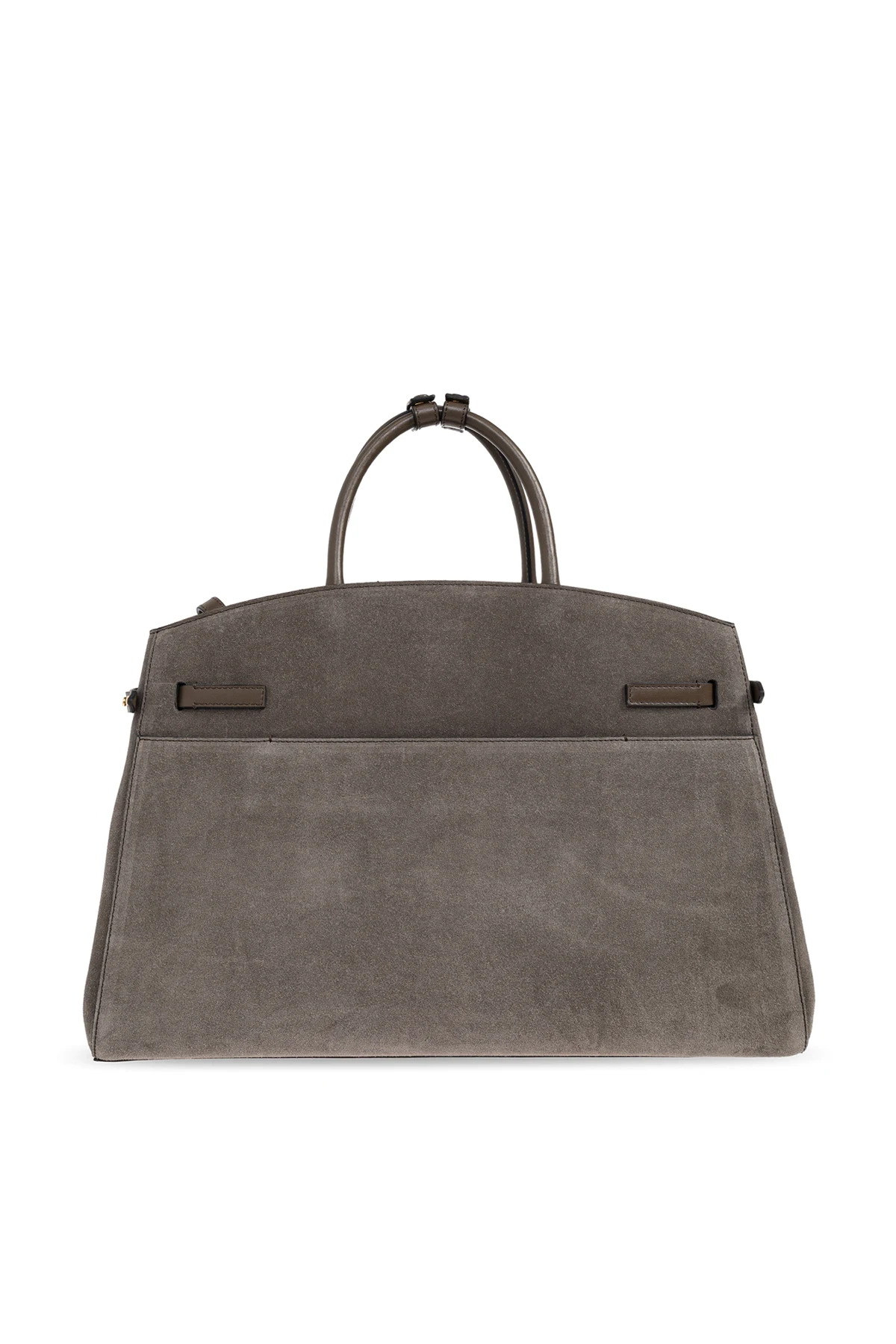 Wysokogatunkowa, matowa skóra zamszowa w stonowanym, szarym odcieniu subtelnie współgra z gładką skórą licową, z której wykonano rączki oraz dekoracyjny pasek. Centrycznie umieszczone, geometryczne zapięcie w kolorze złota przyciąga spojrzenie, będąc finezyjnym akcentem kompozycji.