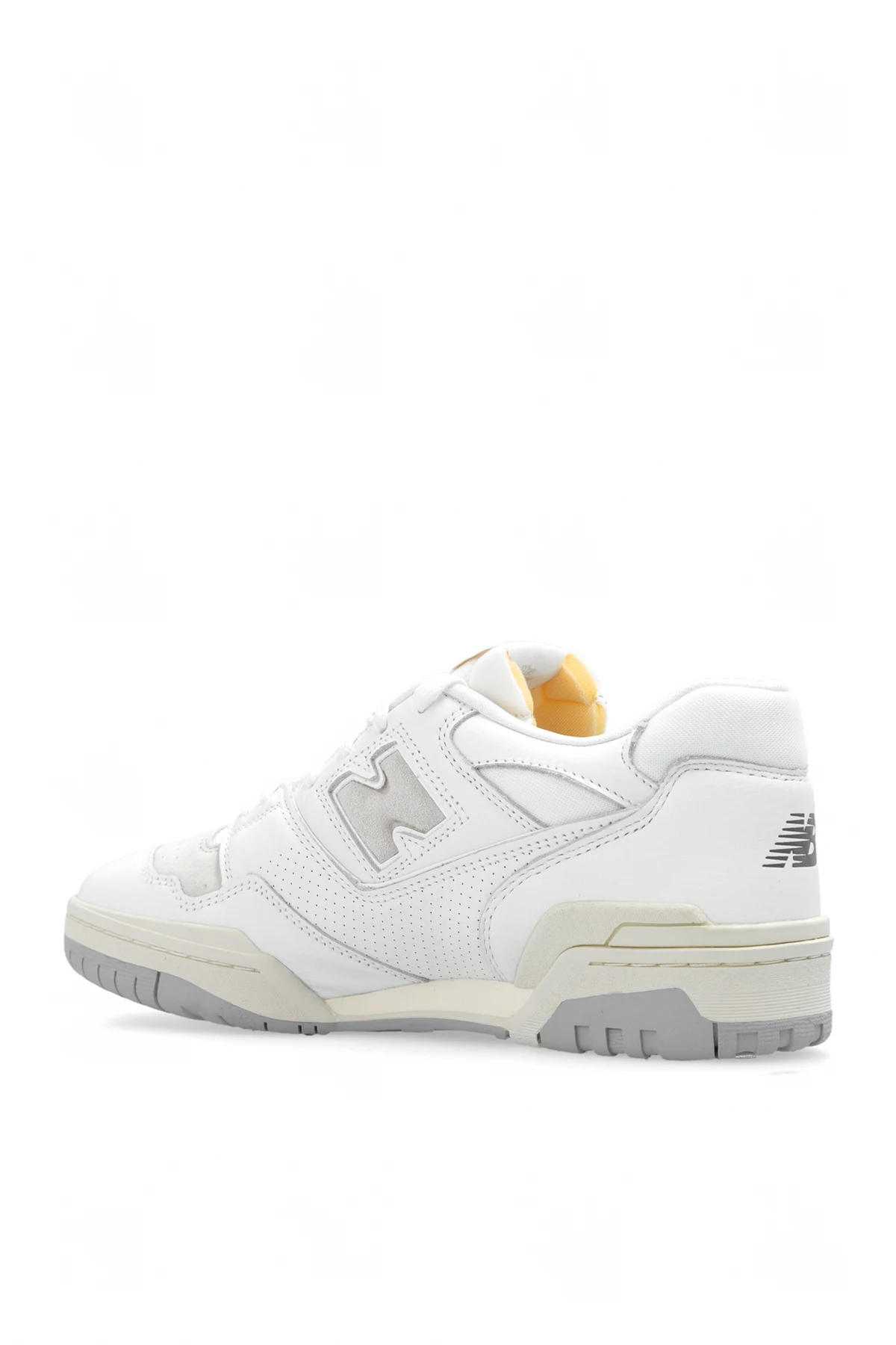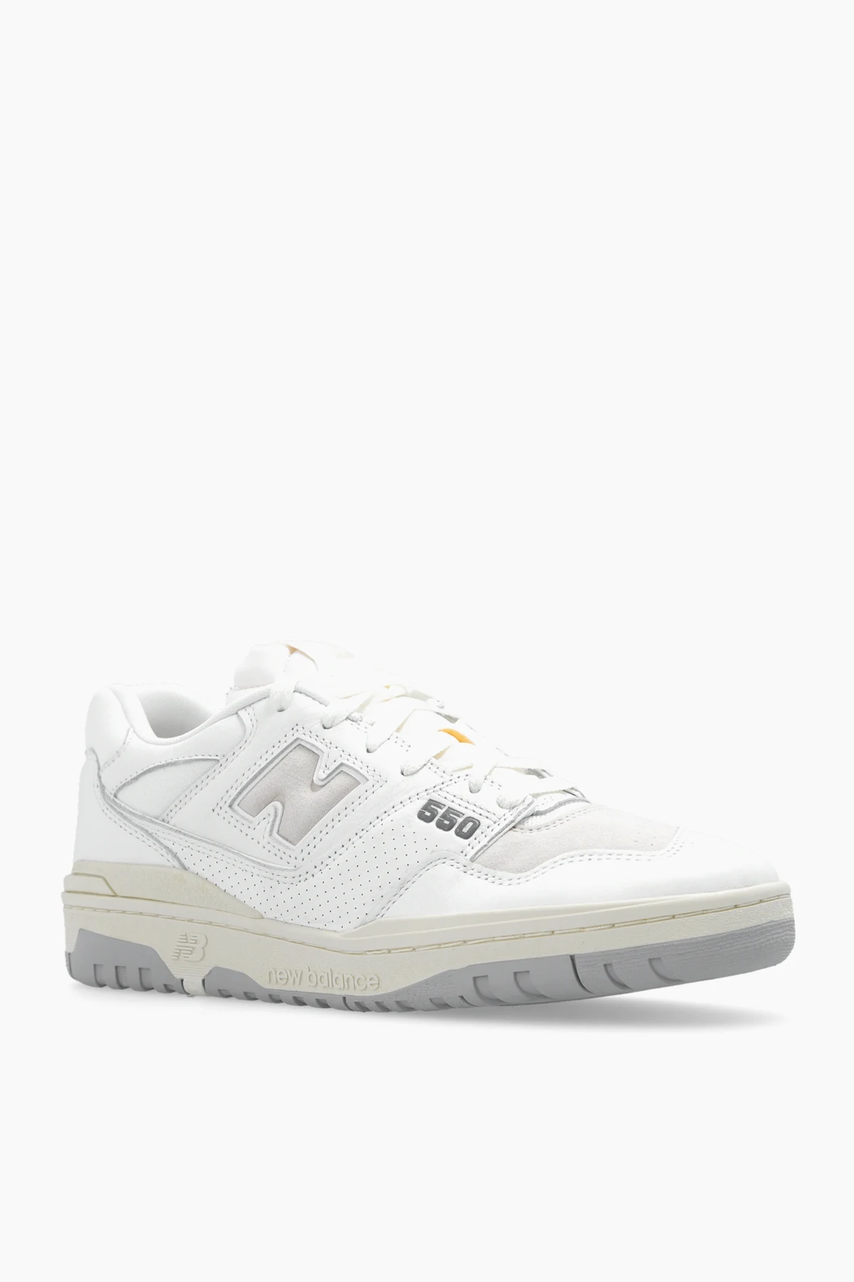 Biało-beżowo-szare, sznurowane buty sportowe, model ‘BB550PWG’ New Balance. Wykonane ze skóry. Ozdobione aplikacją z logo oraz oznaczeniem serii modelu. Beżowo-szara, gumowa podeszwa.