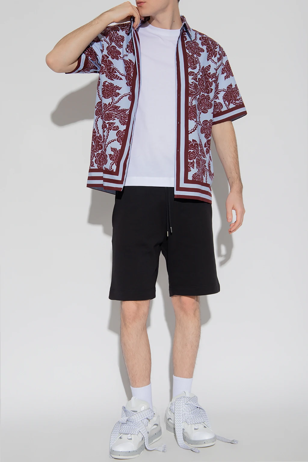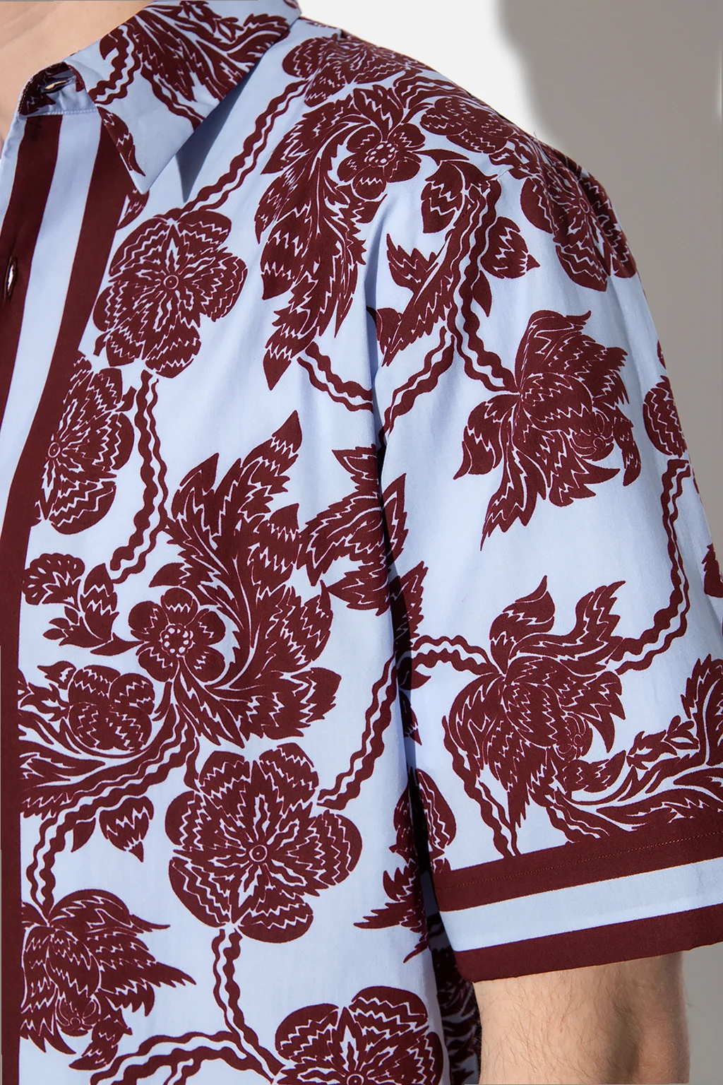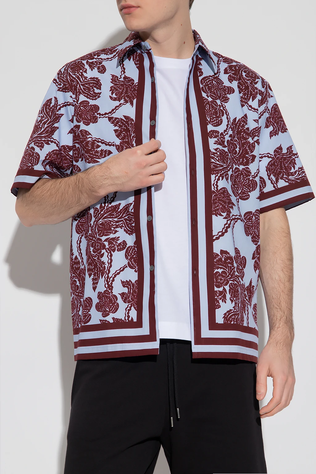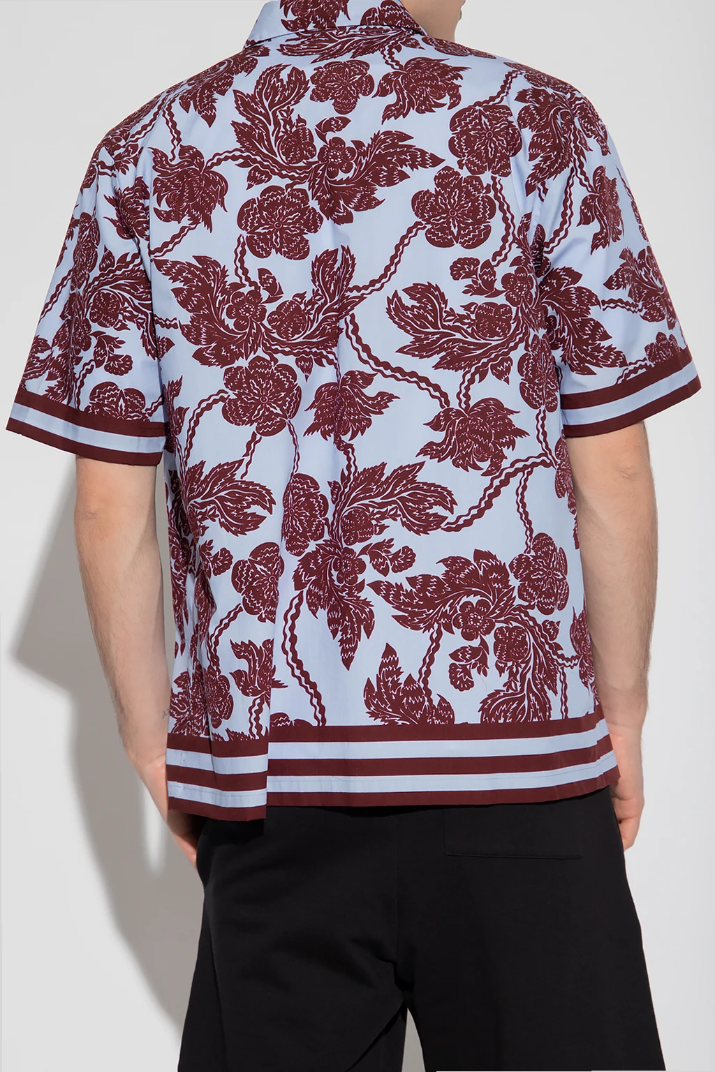 Niebiesko-bordowa koszula Dries Van Noten. Wykonana z bawełny. Zapinana na guziki. Ozdobiona wzorem z motywem kwiatowym. Krótkie rękawy.