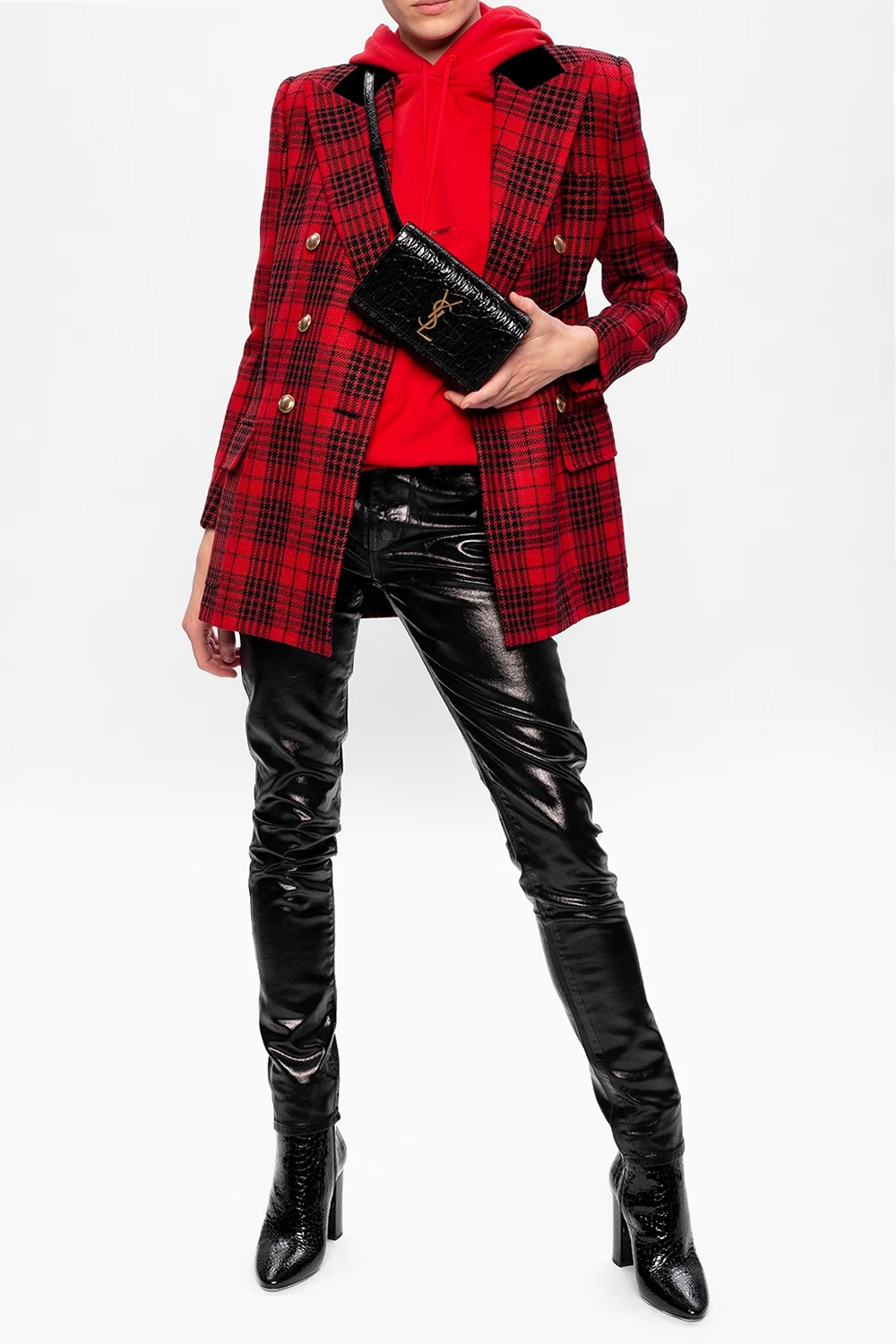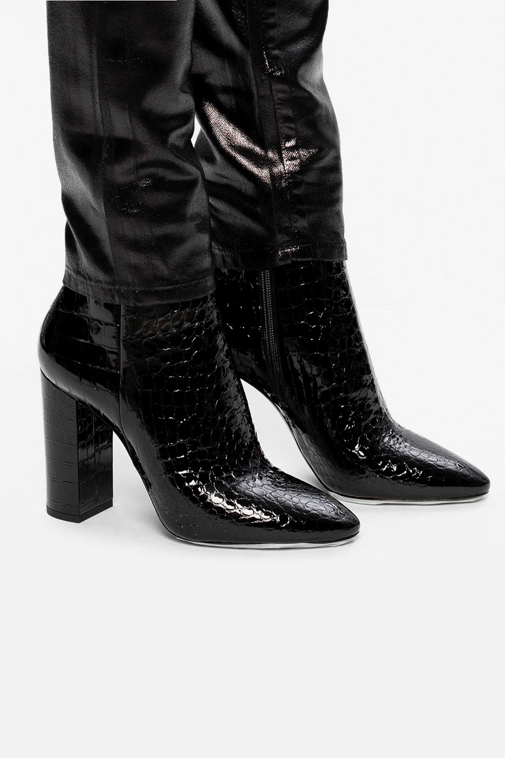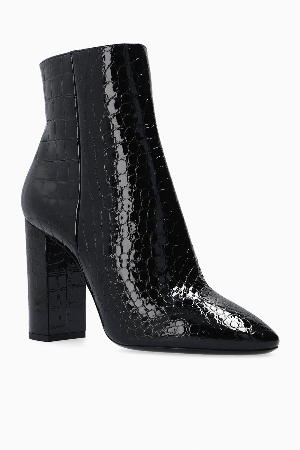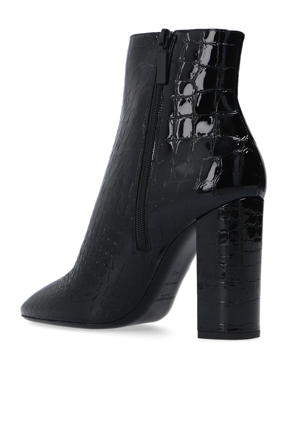 Czarne botki na obcasie, model ‘Lou’ Saint Laurent. Wykonane z lakierowanej skóry imitującej skórę krokodyla. Zapinane z boku na zamek. Czarna, skórzana podeszwa.
