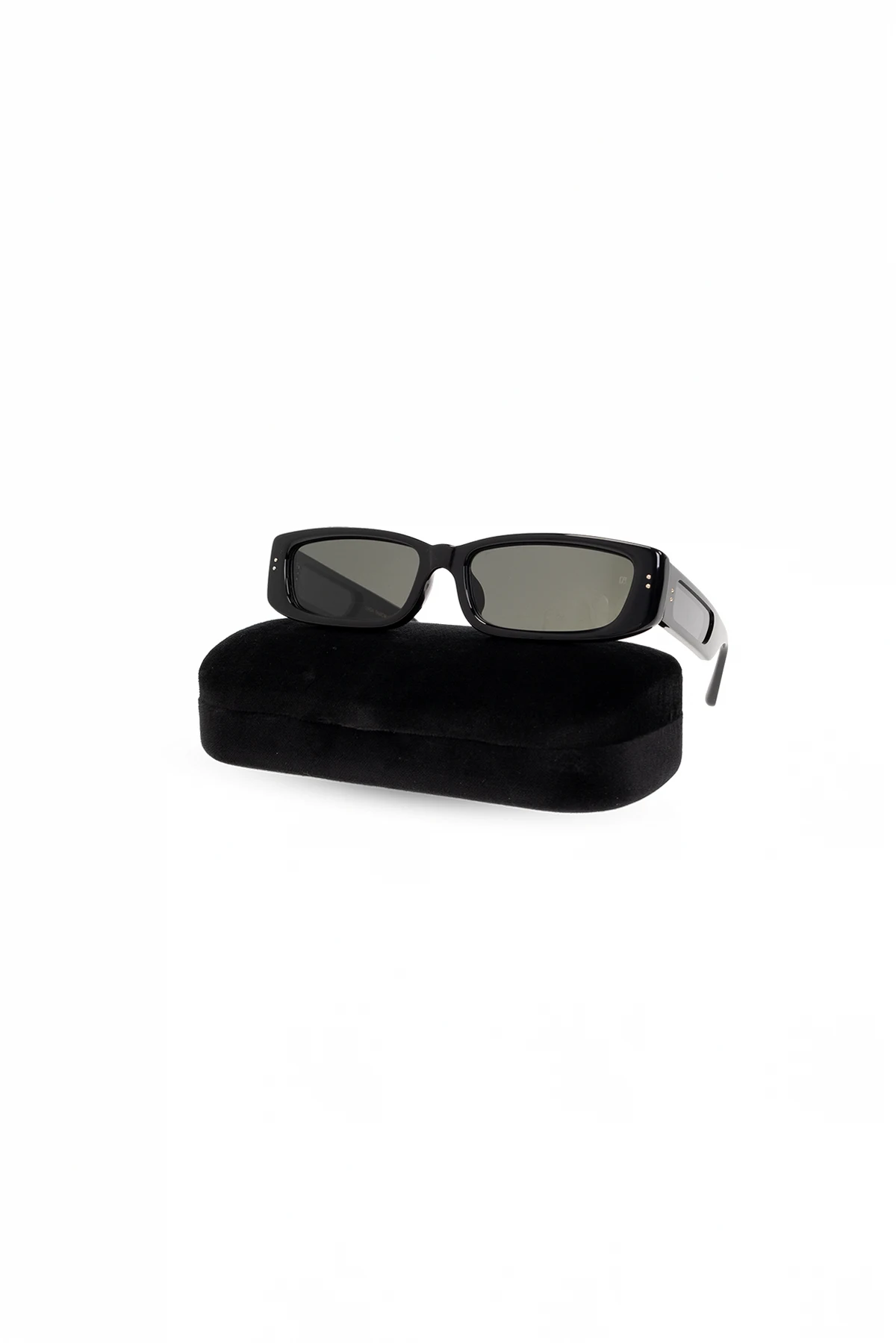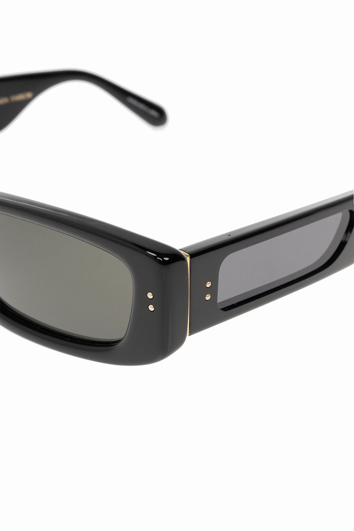 Czarne okulary przeciwsłoneczne, model ‘Talita’ Linda Farrow. Wykonane z ręcznie polerowanego acetatu. Prostokątne oprawki. Zauszniki ze szkłami. Szare soczewki z ochroną przed promieniowaniem UV. Dołączone etui.