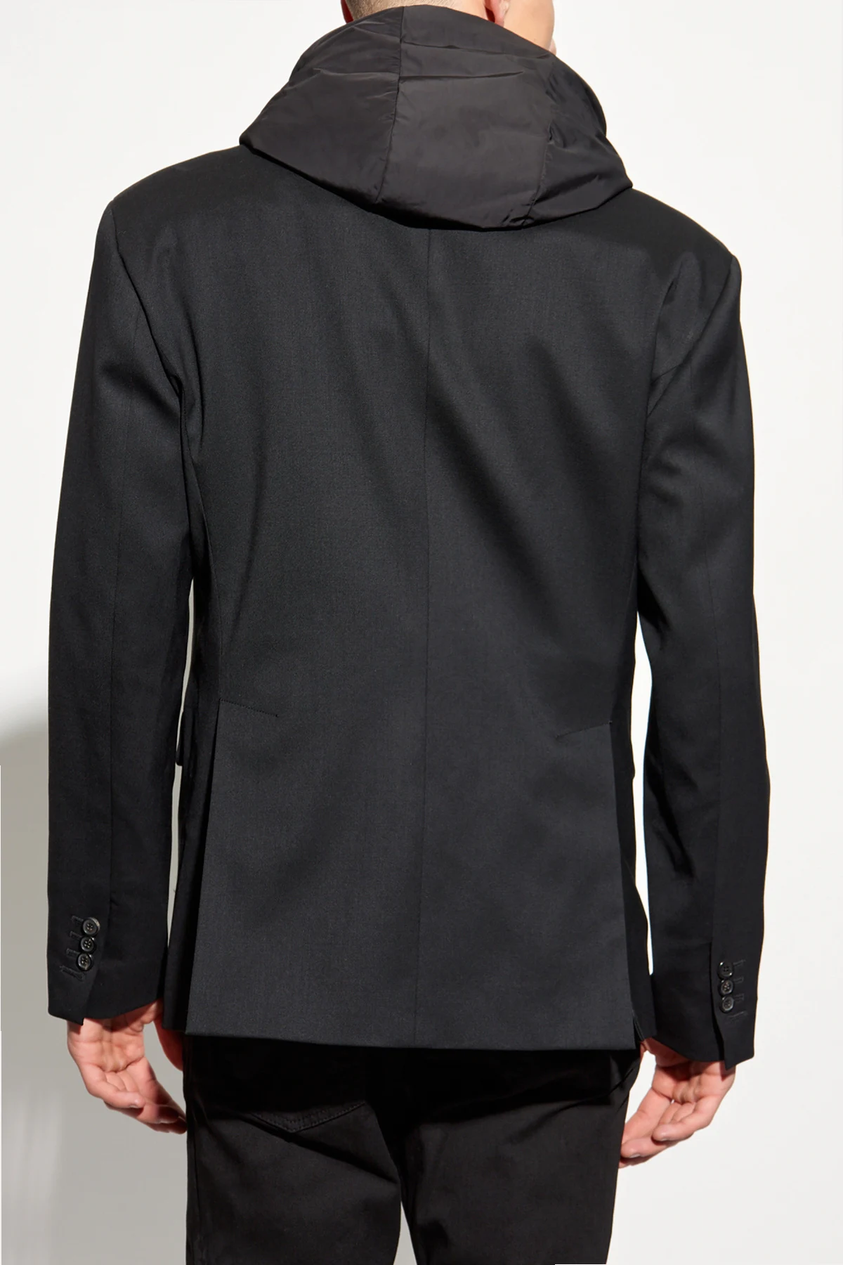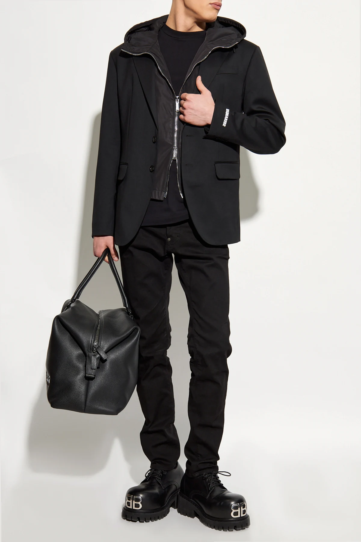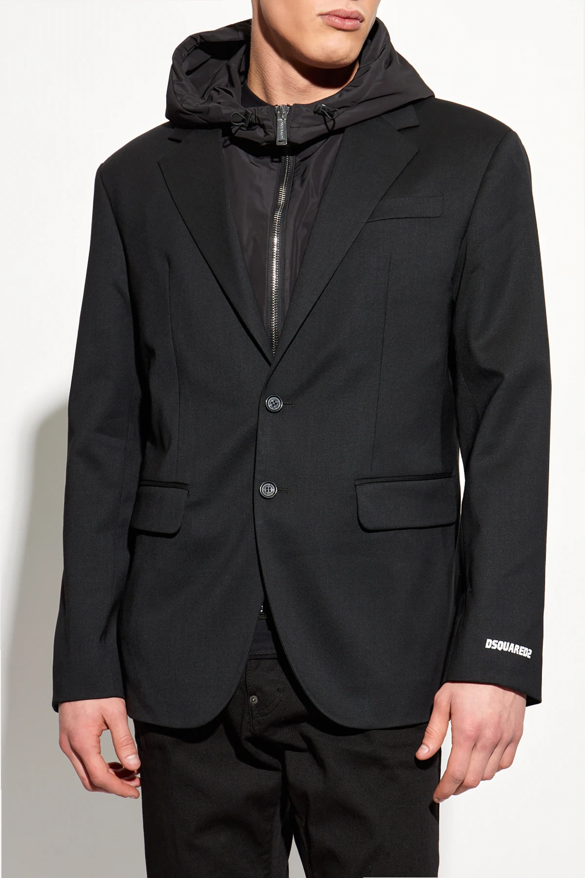 Model ten charakteryzuje się klasycznym krojem z dwoma guzikami oraz klapami, a także wszytą kurtką z kapturem, dodającą mu sportowego akcentu. Kurtka zapinana na dwubiegunowy zamek błyskawiczny wykonana jest z lekko połyskującego materiału, co podkreśla jej wyjątkowość. Dodatkowym detalem jest napis na mankiecie, prawdopodobnie logo projektanta, który dodaje charakteru.