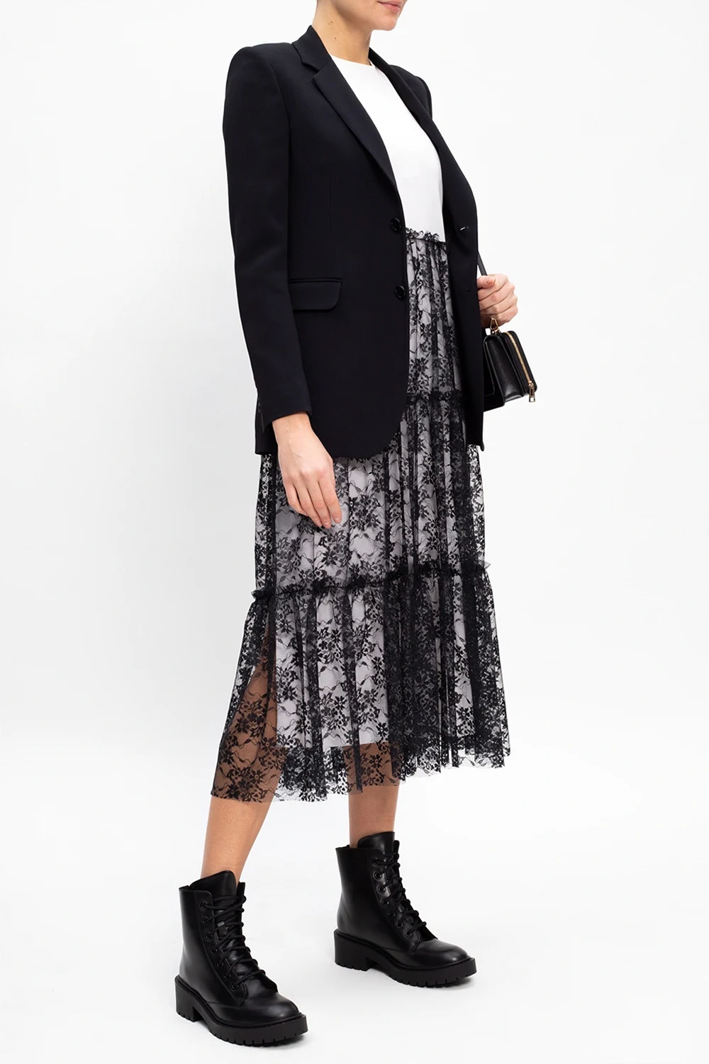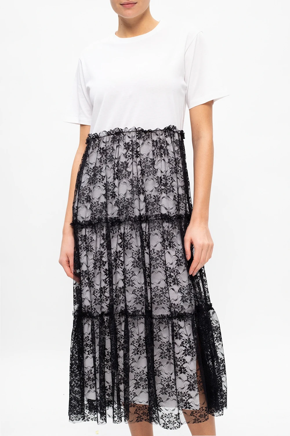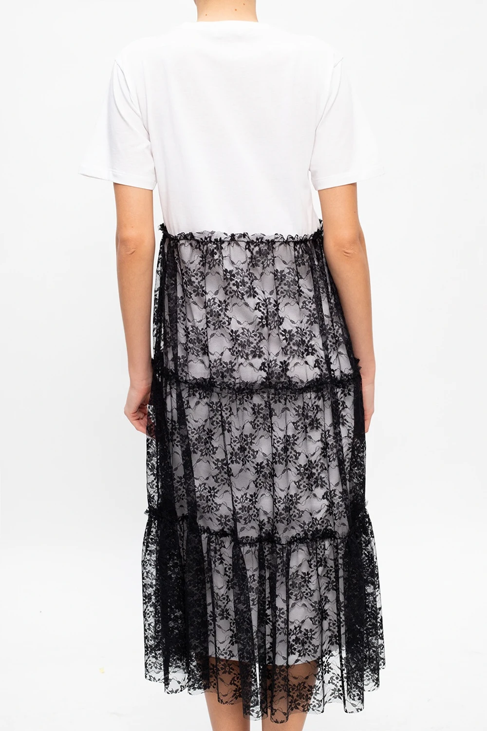 Biała sukienka Red Valentino. Wykonana z bawełny. Wykończona czarną koronką. Na dole rozcięcia. Okrągły dekolt. Krótki rękaw.