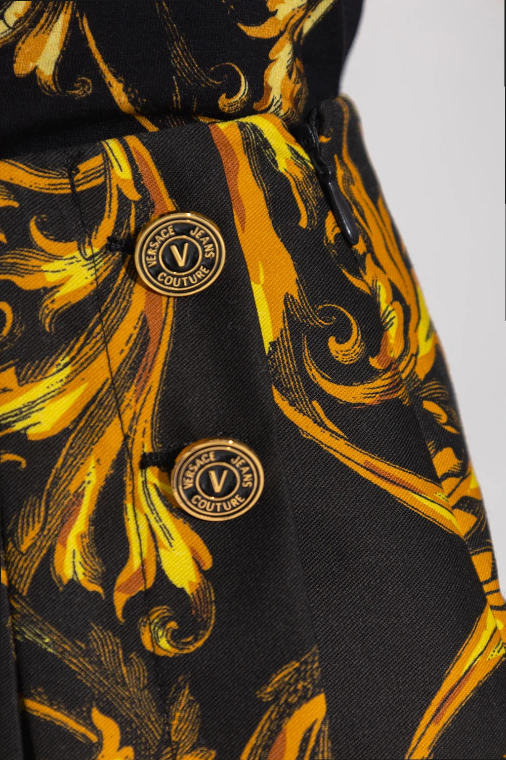 Czarne szorty Versace Jeans Couture. Z boku zapinane na zamek oraz haftki. Ozdobione wzorem w kolorze żółto-czarnym. Plisowana zakładka.