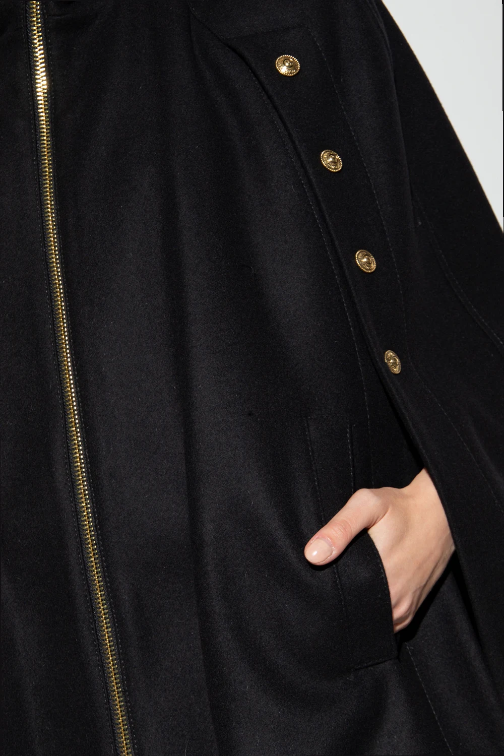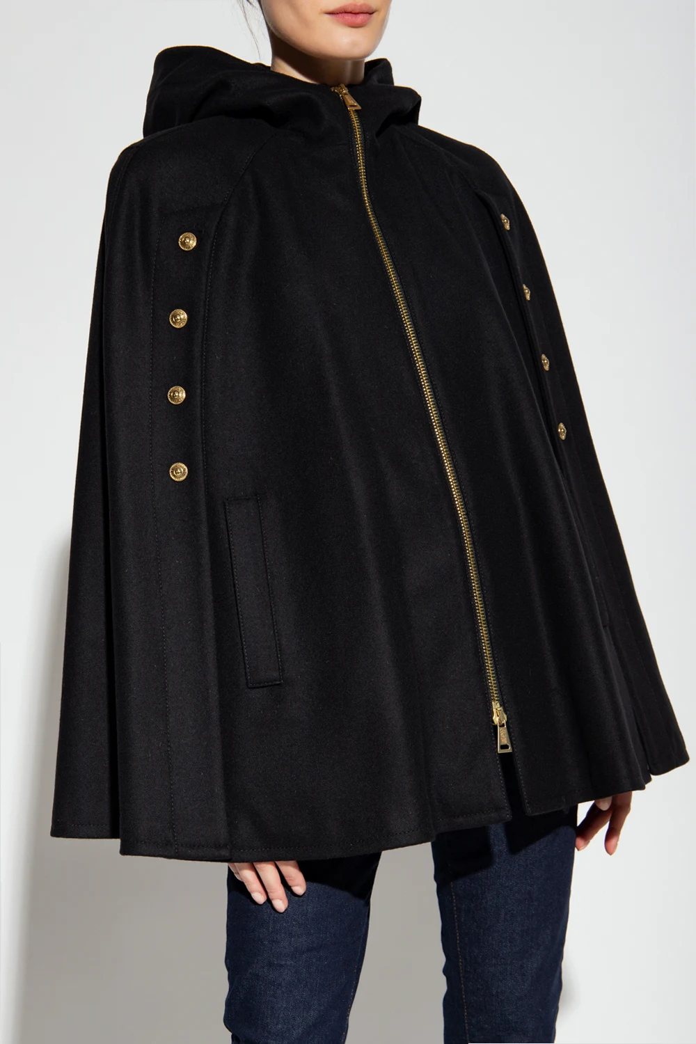 Czarny, krótki płaszcz z kapturem Versace Jeans Couture. Wykonany z wełny. Zapinany na zamek. Ozdobiony dekoracyjnymi guzikami z wytłoczonym logo. Dwie wsuwane kieszenie.