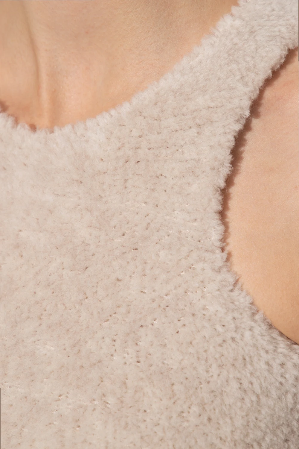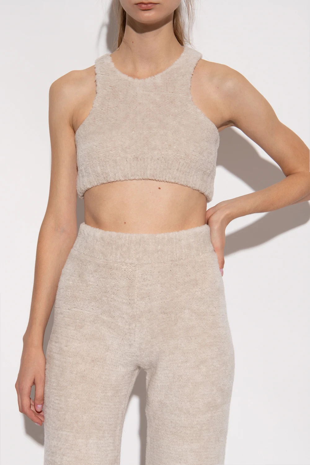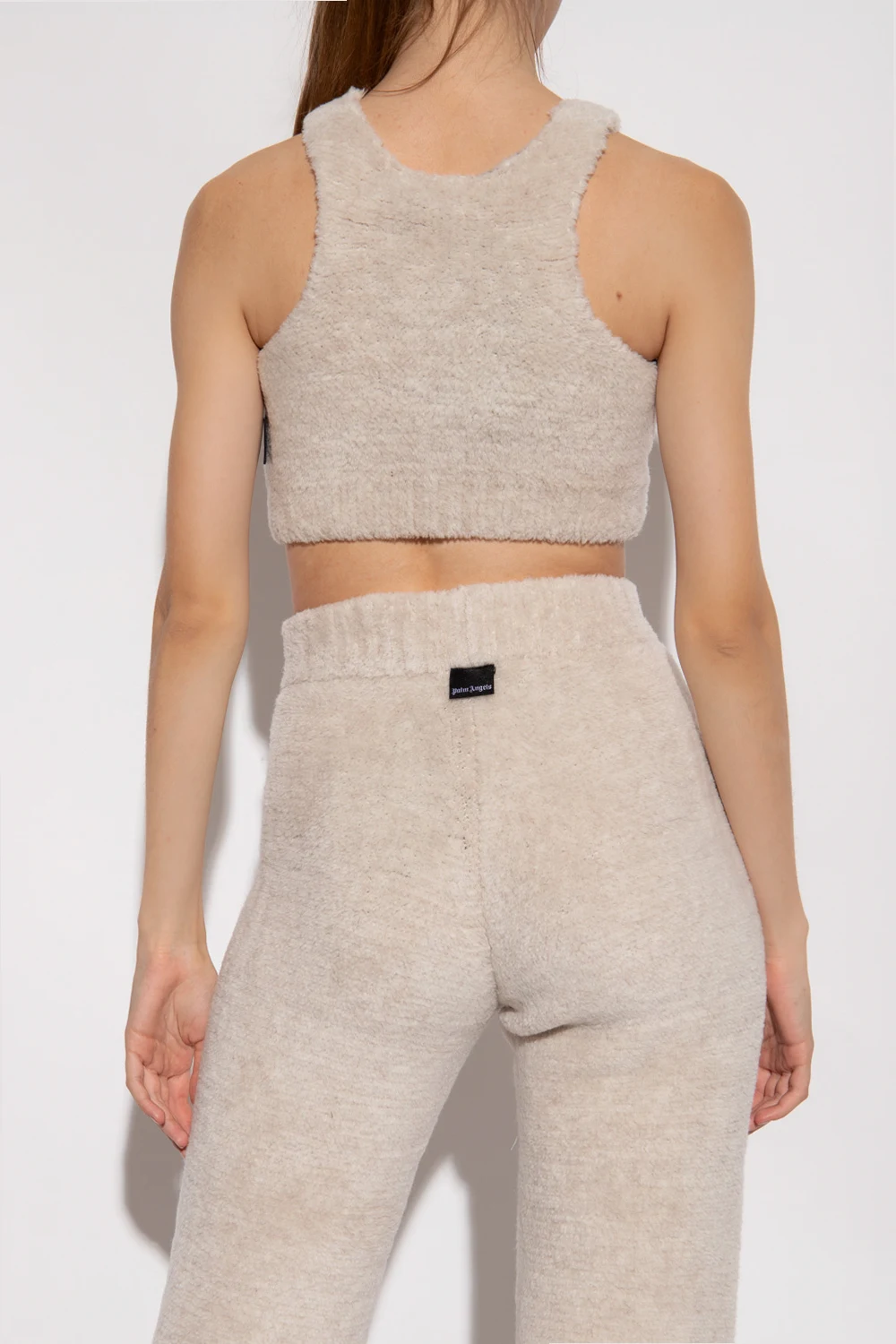 Kremowo-szary, futrzany top Palm Angels. Wykonany z wełny. Ozdobiony naszywką z logo w kolorze czarno-białym. Na dole wykończony ściągaczem.