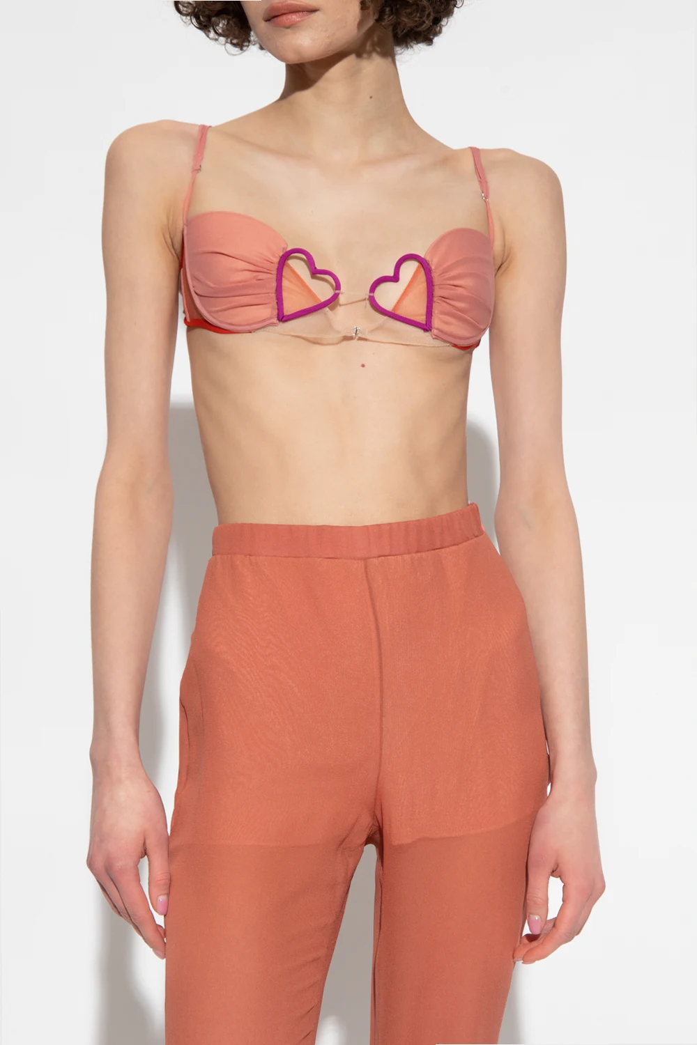 Różowo-czerwony biustonosz Nensi Dojaka. Z tyłu zapinany na haftkę. Ozdobiony aplikacją z sercem. Regulowane ramiączka.