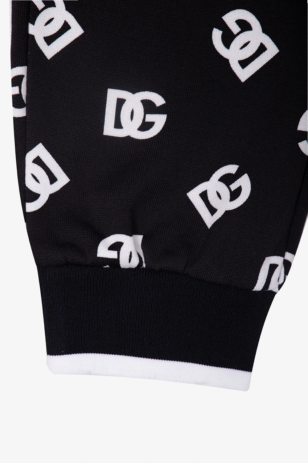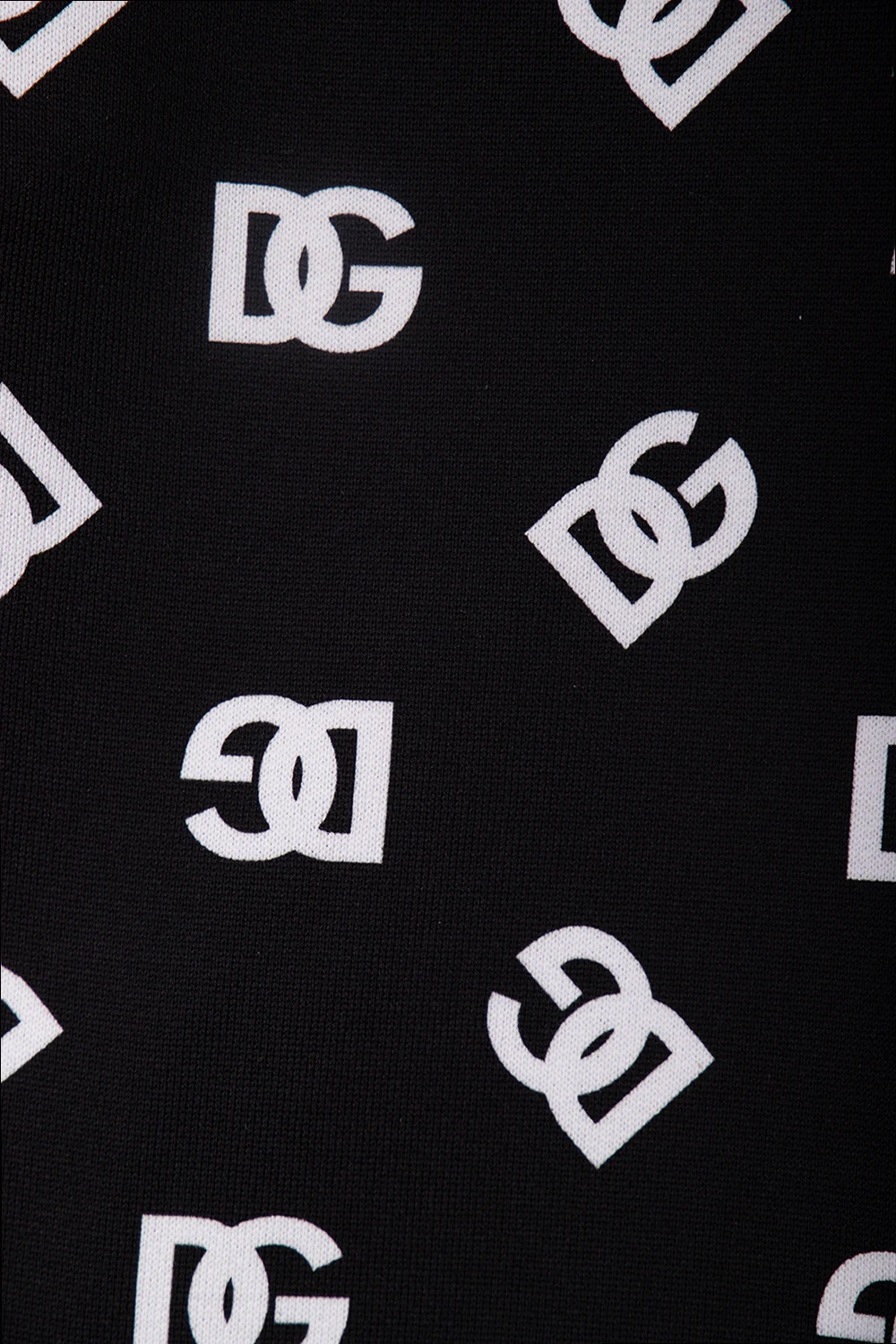 Czarne spodnie dresowe Dolce & Gabbana Kids. Wykonane z bawełny. W pasie wszyta guma ściągana trokami. Ozdobione białym wzorem z monogramem. Trzy wsuwane kieszenie: dwie z przodu i z tyłu. Długie nogawki zakończone ściągaczem.