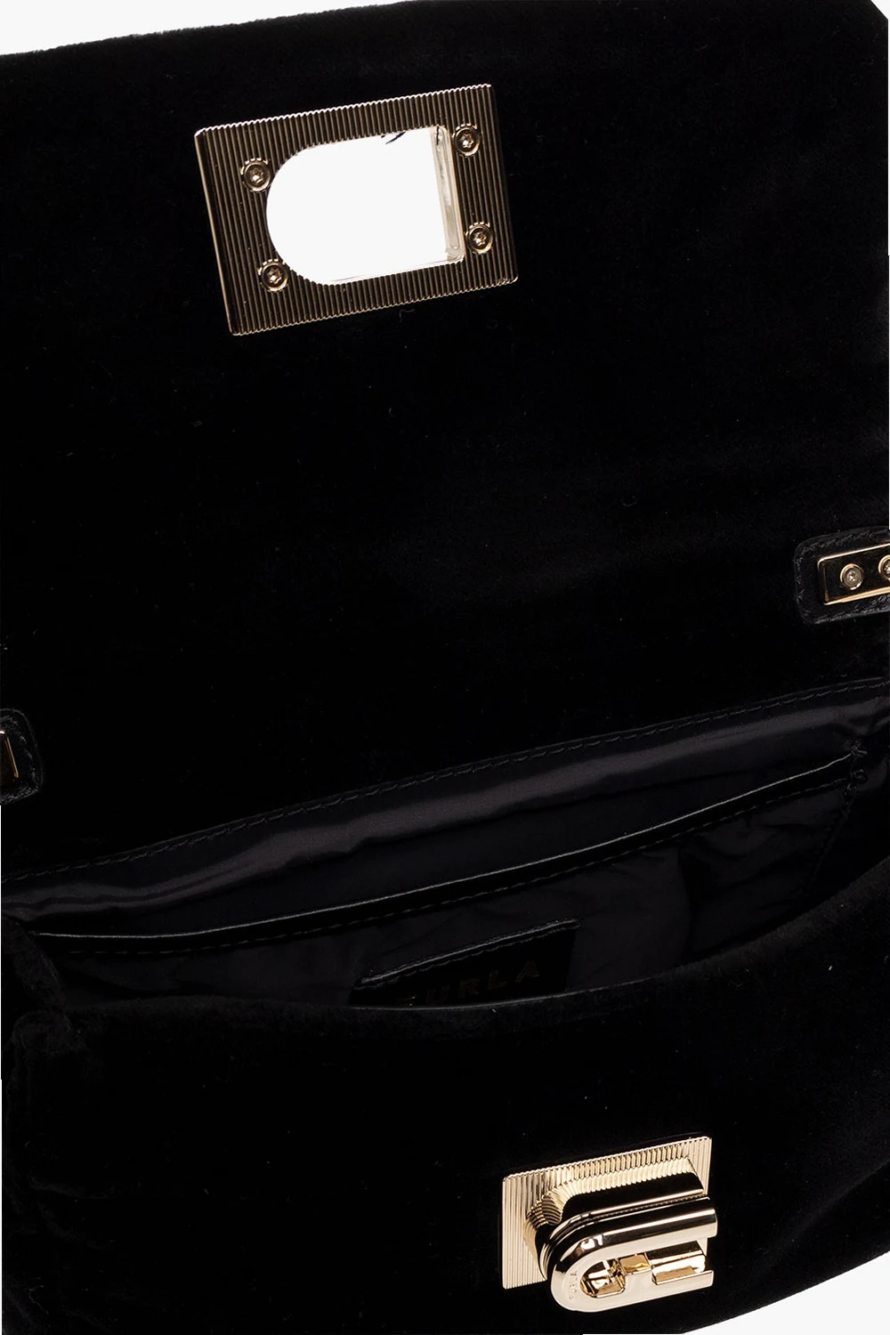 Czarna, aksamitna torba na ramię, model ‘1927 Mini’ Furla. Dekoracyjne zamknięcie typu ‘twist’ w kształcie logo. Z tyłu wsuwana kieszeń. Łańcuch na ramię wykończony paskiem. Wewnątrz komora z wsuwaną kieszenią. Metalowe wykończenie w kolorze złotym.