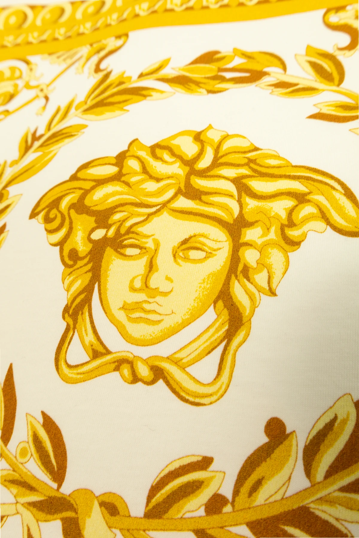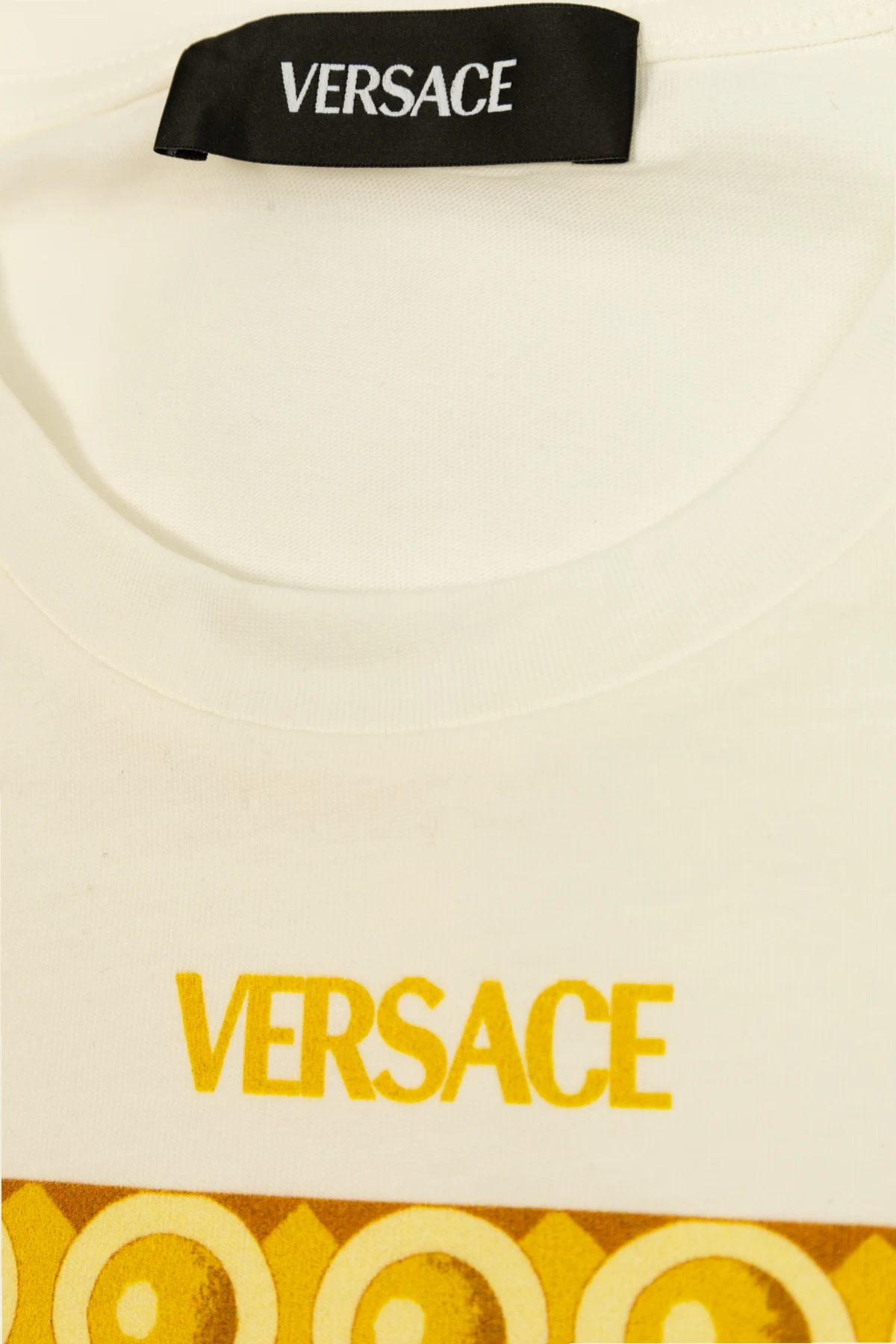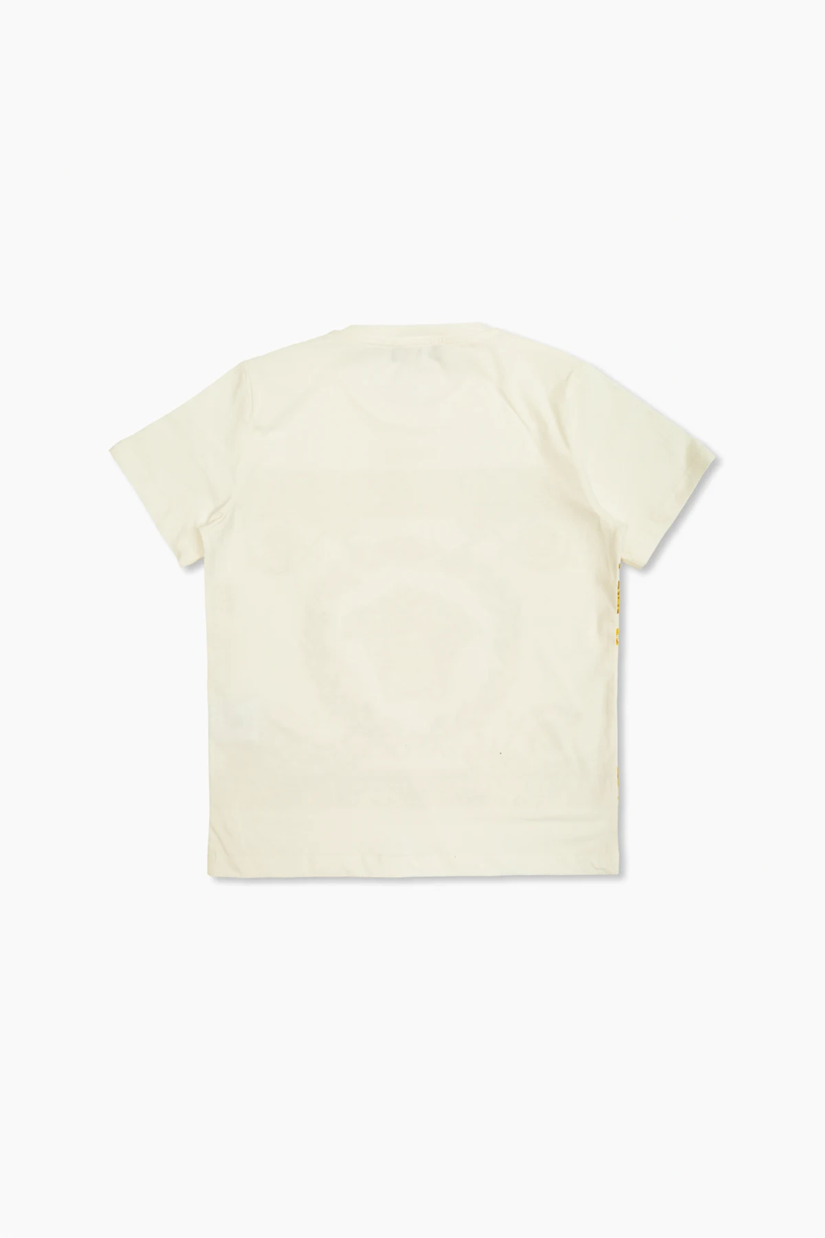 Oto T-shirt z nadrukiem od renomowanej marki Versace Kids , który jest kwintesencją elegancji i wyrafinowanego stylu. Biel koszulki doskonale kontrastuje z złotym wzorem Meduzy otoczonym dekoracyjnymi liśćmi i ornamentami na przodzie, a napis "VERSACE" w górnej części dodaje jej majestatycznego uroku.