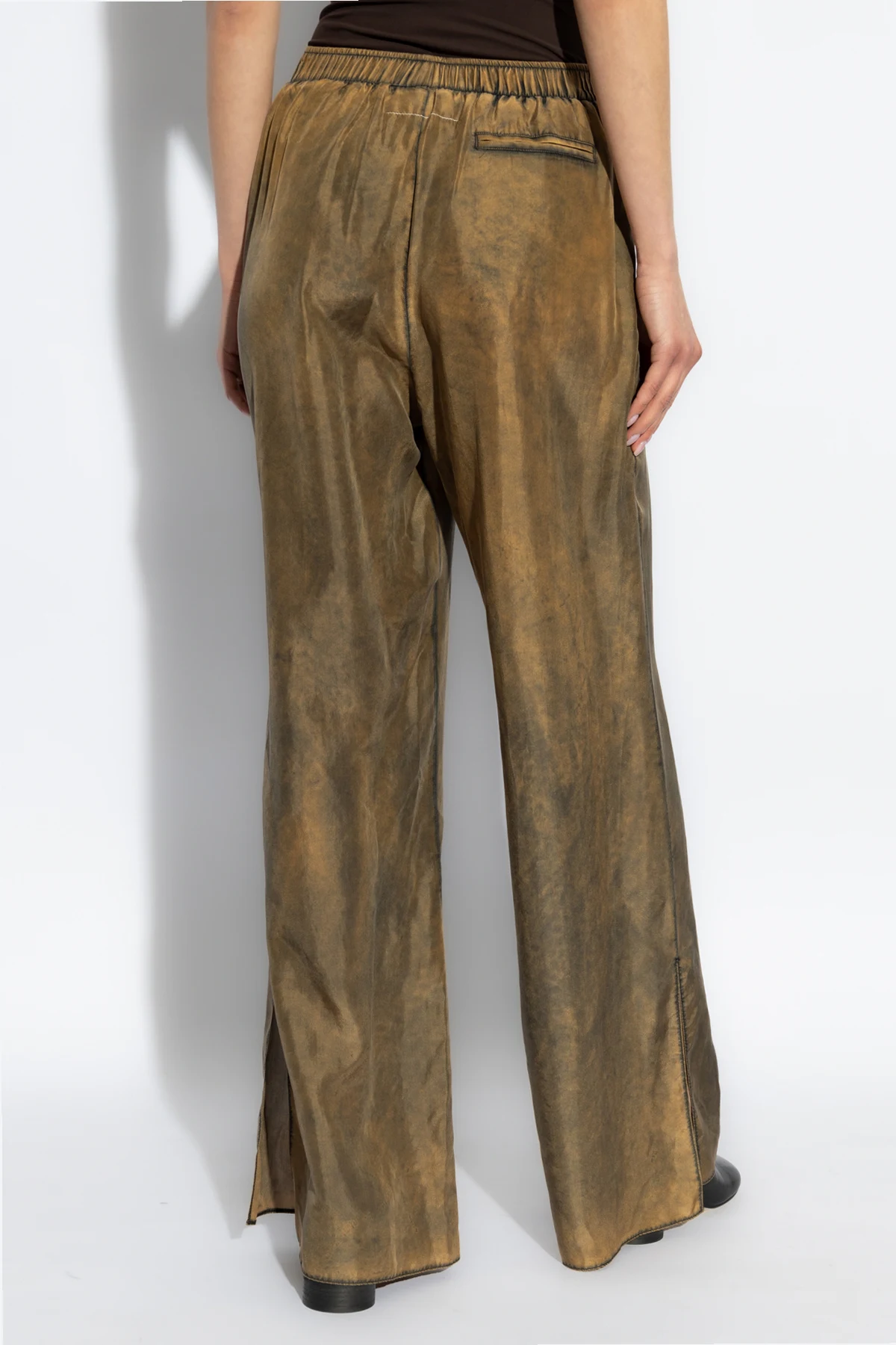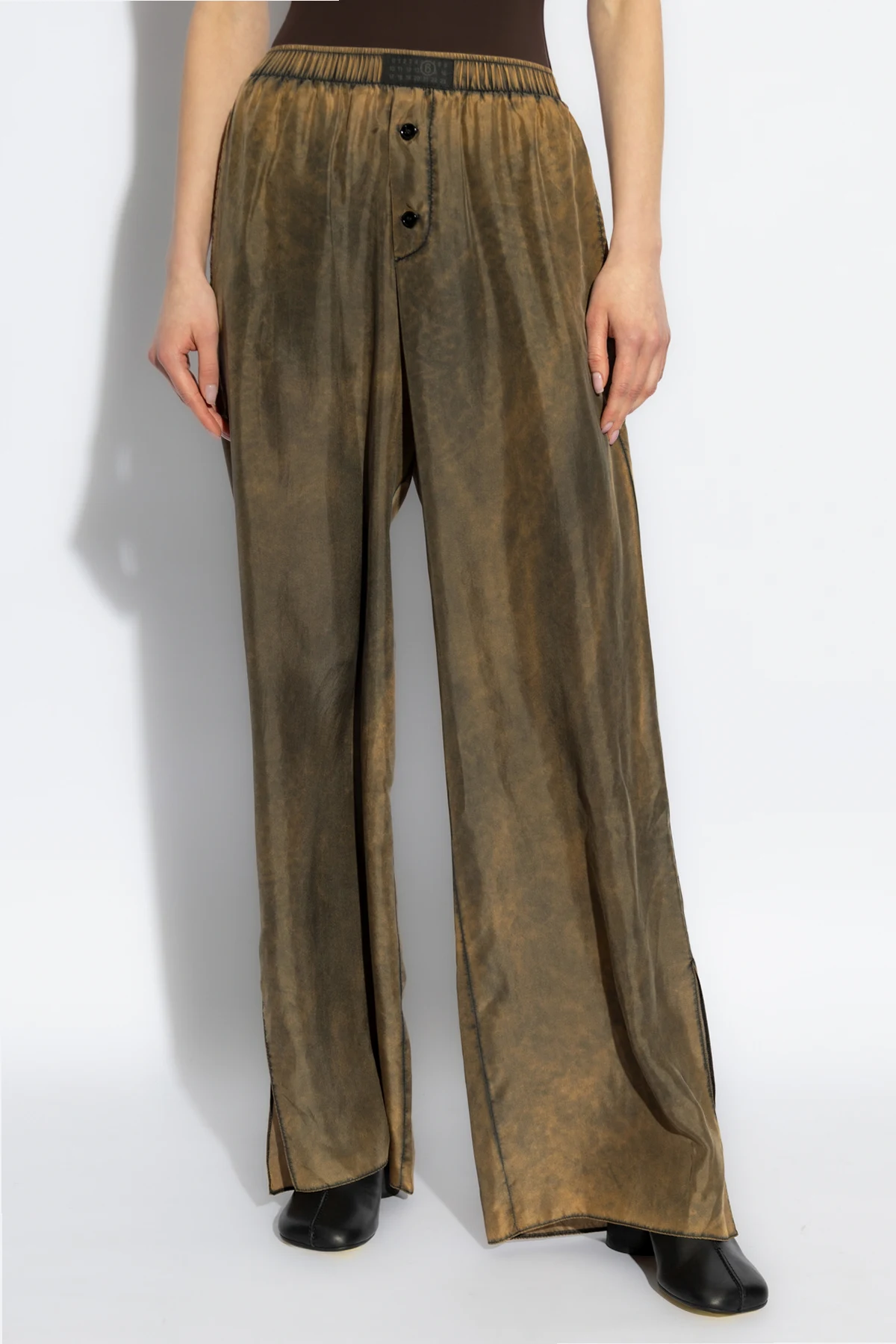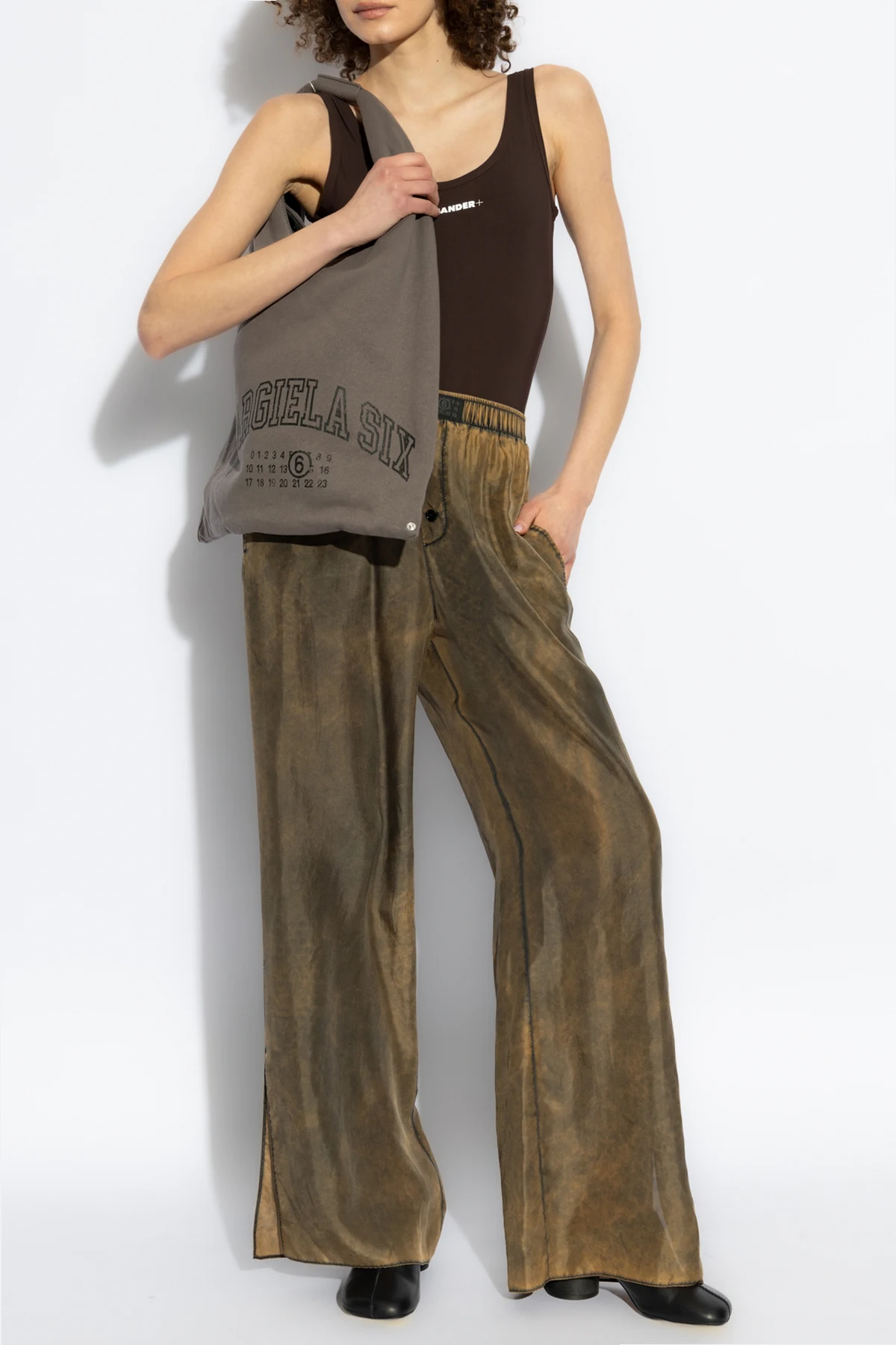 Przedstawiamy jedwabne spodnie o luźnym kroju z kolekcji MM6 Maison Margiela - wyjątkowy przykład konceptualnej mody, która harmonijnie łączy elegancję z ponadczasowym komfortem. Wykonane z najwyższej jakości jedwabiu, spodnie te charakteryzują się delikatną fakturą oraz subtelnymi cieniowaniami w odcieniach brązu, które dodają im niepowtarzalnej głębi i wyrazistości.