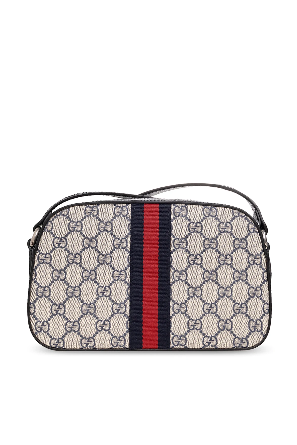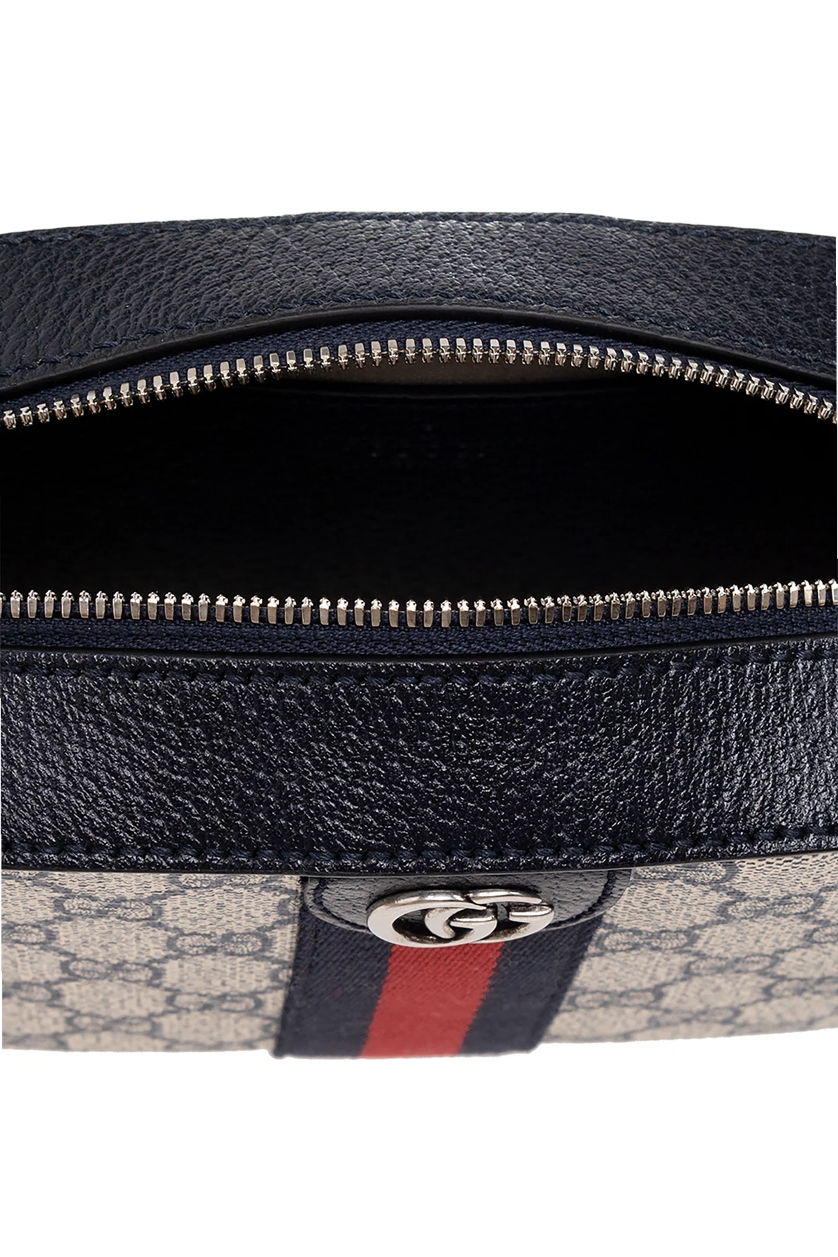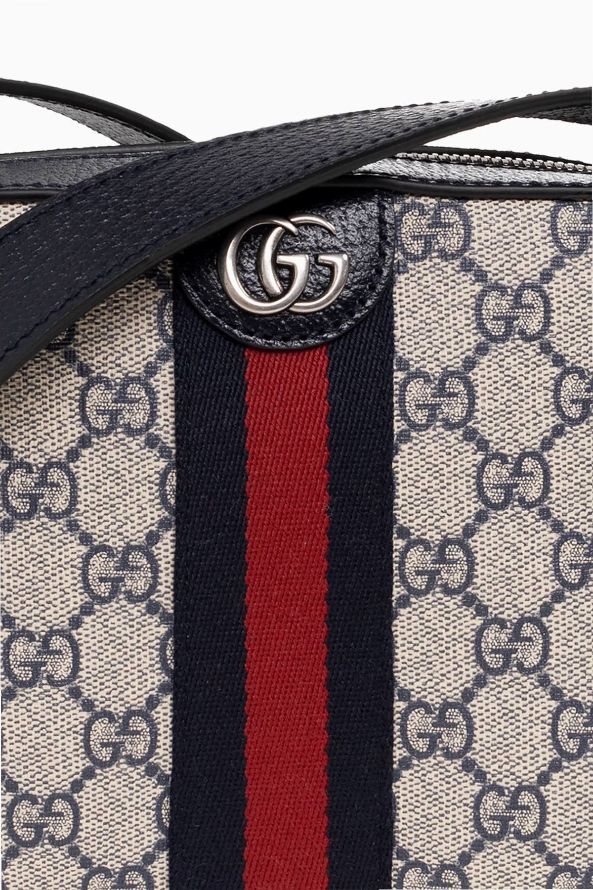 Kremowo-granatowa torba na ramię, model ‘Ophidia’ Gucci. Wykonana z charakterystycznego dla marki płótna ‘GG Supreme’ i wykończona skórą. Zamykana na zamek. Ozdobiona metalową aplikacją z logo ‘Double G’. Naszyty pas z motywem ‘Web’ w kolorze granatowo-czerwono-granatowym. Pas z możliwością regulacji długości. Wewnątrz komora z wsuwaną kieszenią. Metalowe wykończenie w kolorze postarzanego srebra.