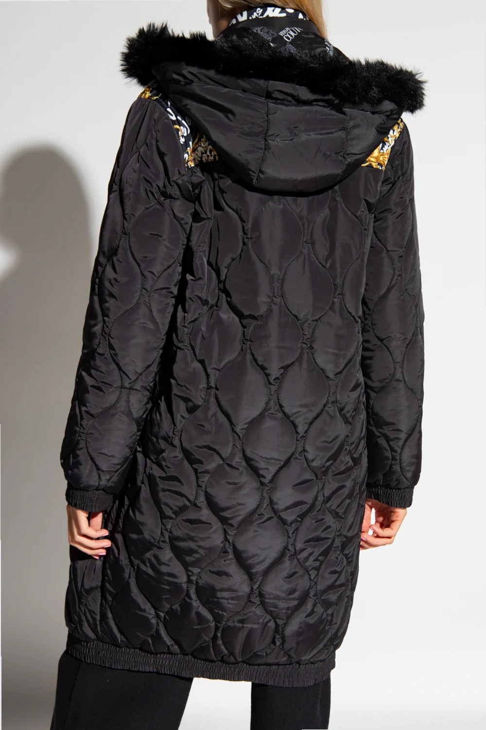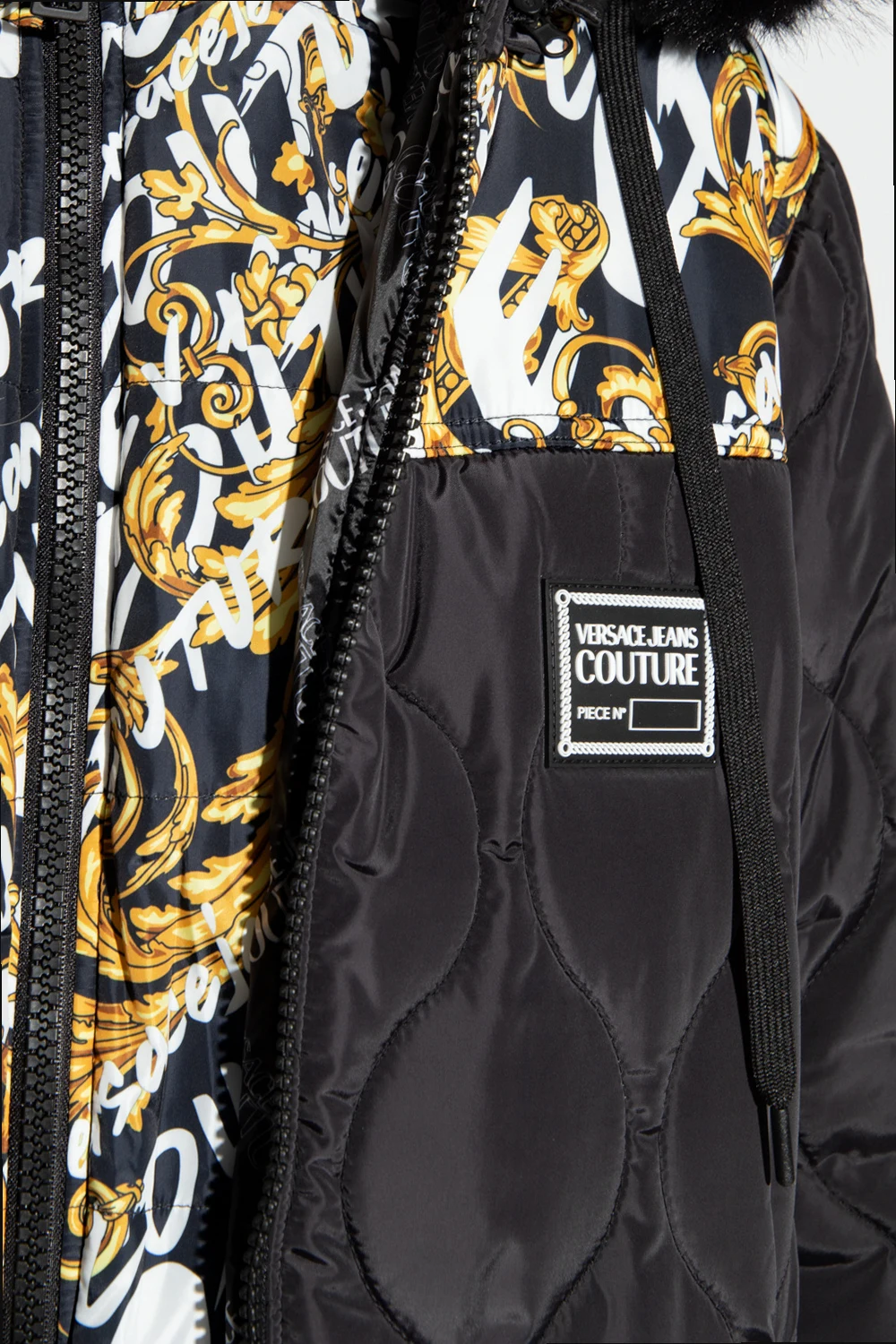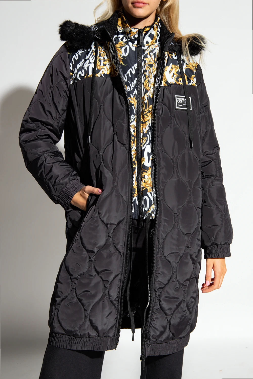 Czarna, długa kurtka z kamizelką Versace Jeans Couture. Zapinana na dwubiegunowy zamek. Na ramionach ozdobiona wzorem ‘Logo Brush Couture’ oraz wykończona pikowaniem. Z przodu gumowa aplikacja z logo ‘Piece Number’ i dwie kieszenie zamykane na zamki. Odpinany kaptur ściągany trokami wykończony sztucznym futrem. Dół oraz długie rękawy zakończone ściągaczami. Wewnątrz wszyta wzorzysta kamizelka zapinana na zamek.
