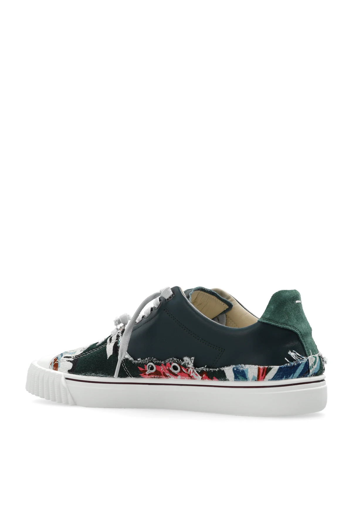 Kolorowe, sznurowane buty Maison Margiela. Wykonane ze skóry i materiału. Ozdobione naszywką oraz efektem znoszenia. Biała, gumowa podeszwa.