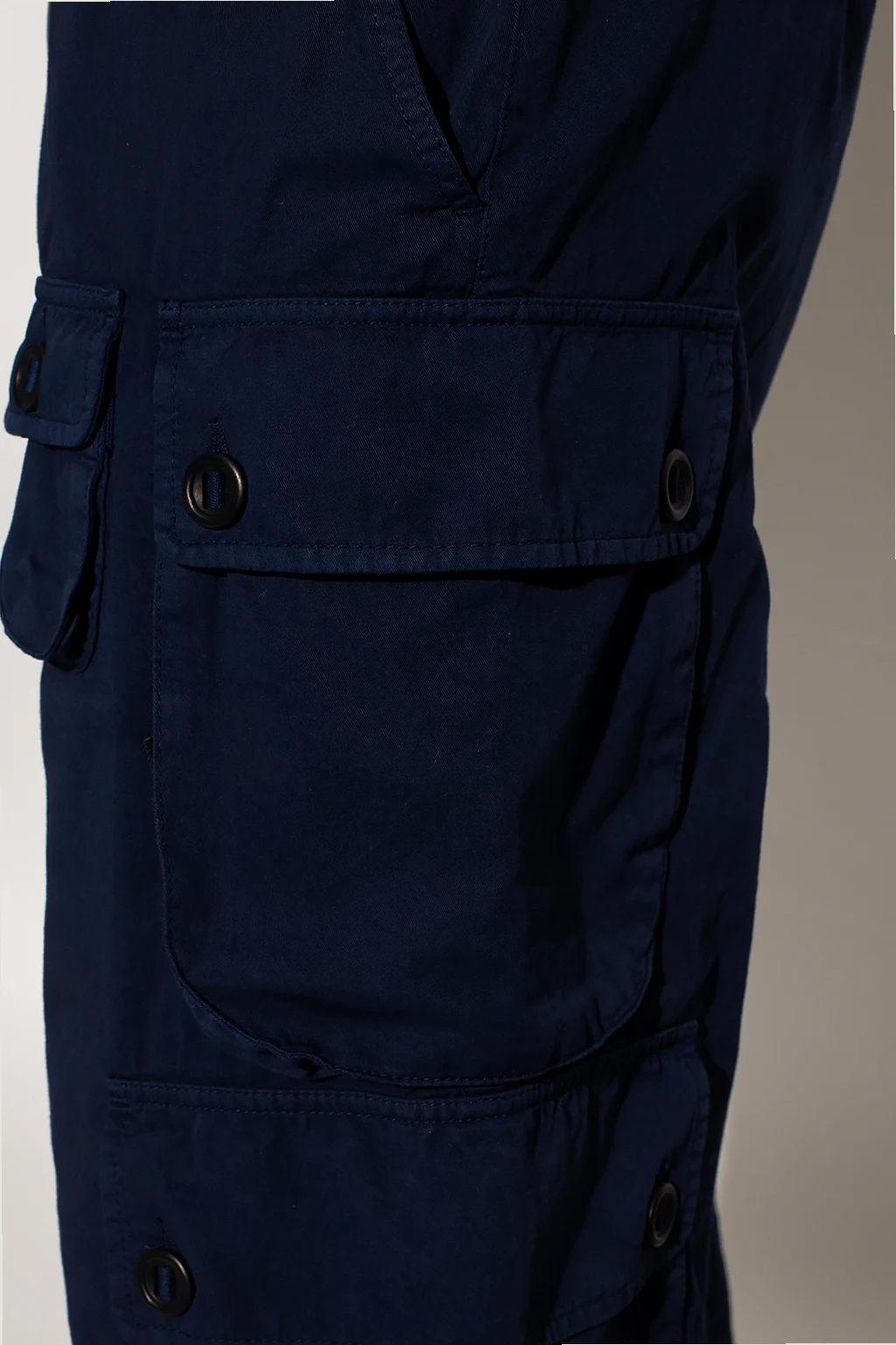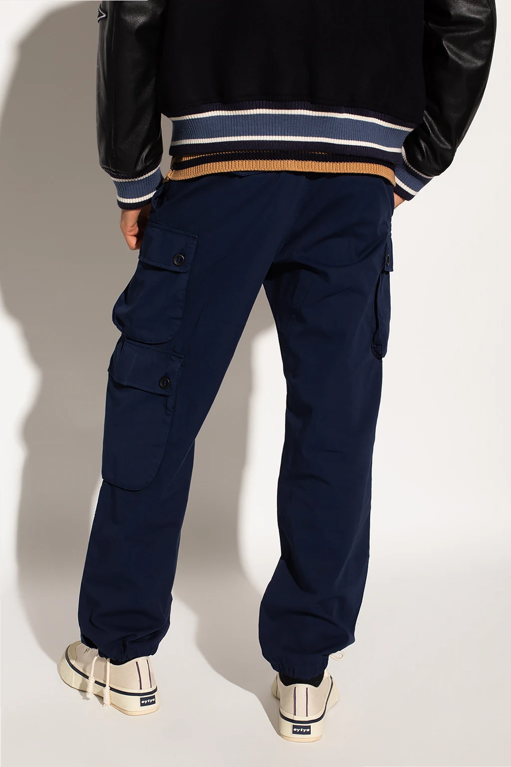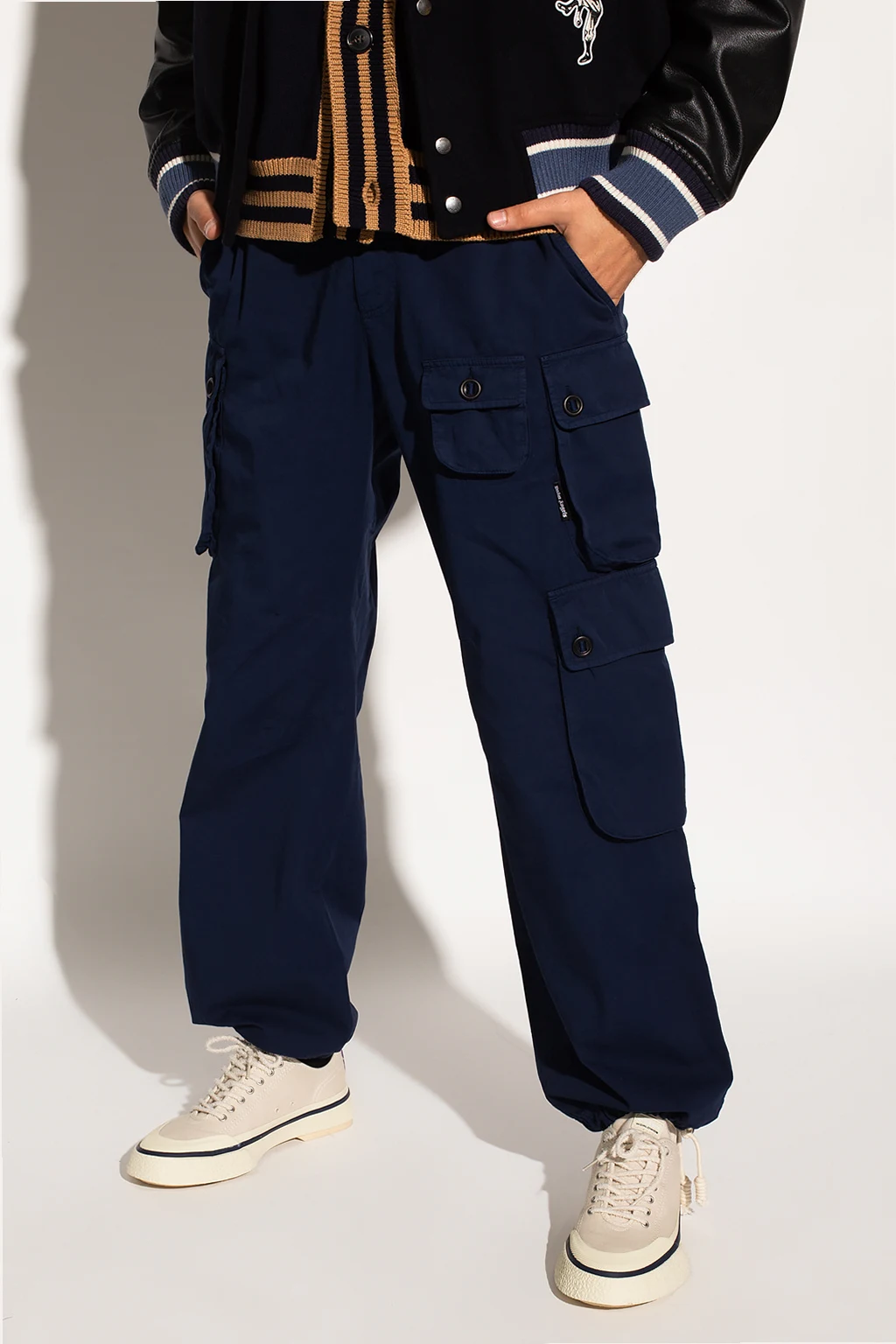 Granatowe spodnie Palm Angels. Wykonane z bawełny. Zapinane na zamek oraz guzik. Osiem kieszeni: dwie wsuwane oraz sześć z patkami. Długie nogawki zakończone trokami.
