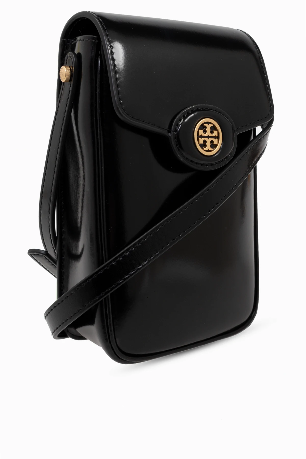 Ekskluzywne etui na telefon na pasku 'Robinson' , zaprojektowane przez renomowaną Tory Burch , jest kwintesencją luksusu i funkcjonalności. Wykonane z najwyższej jakości skóry, prezentuje się w ponadczasowym, głębokim odcieniu czerni, którego połyskliwa faktura elegancko odbija światło. Jego unikatowy kształt z zaokrąglonymi krawędziami oraz precyzyjne szycie świadczą o mistrzowskim rzemiośle.