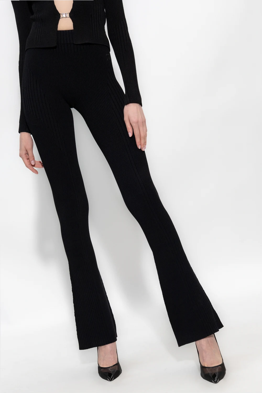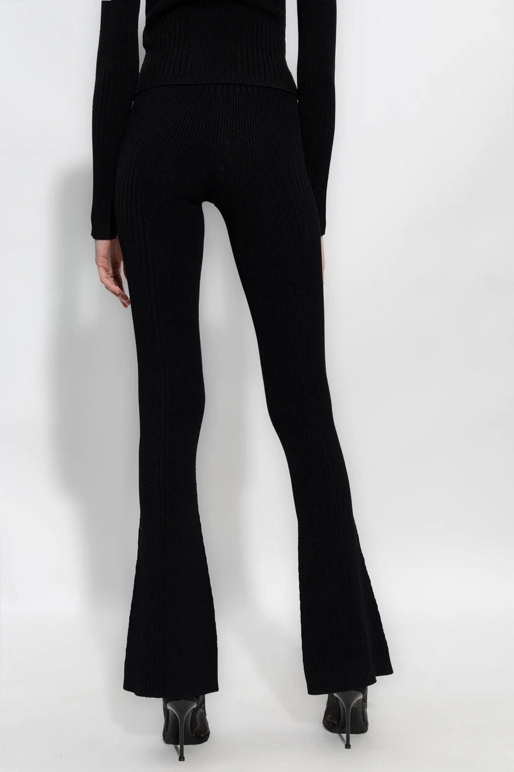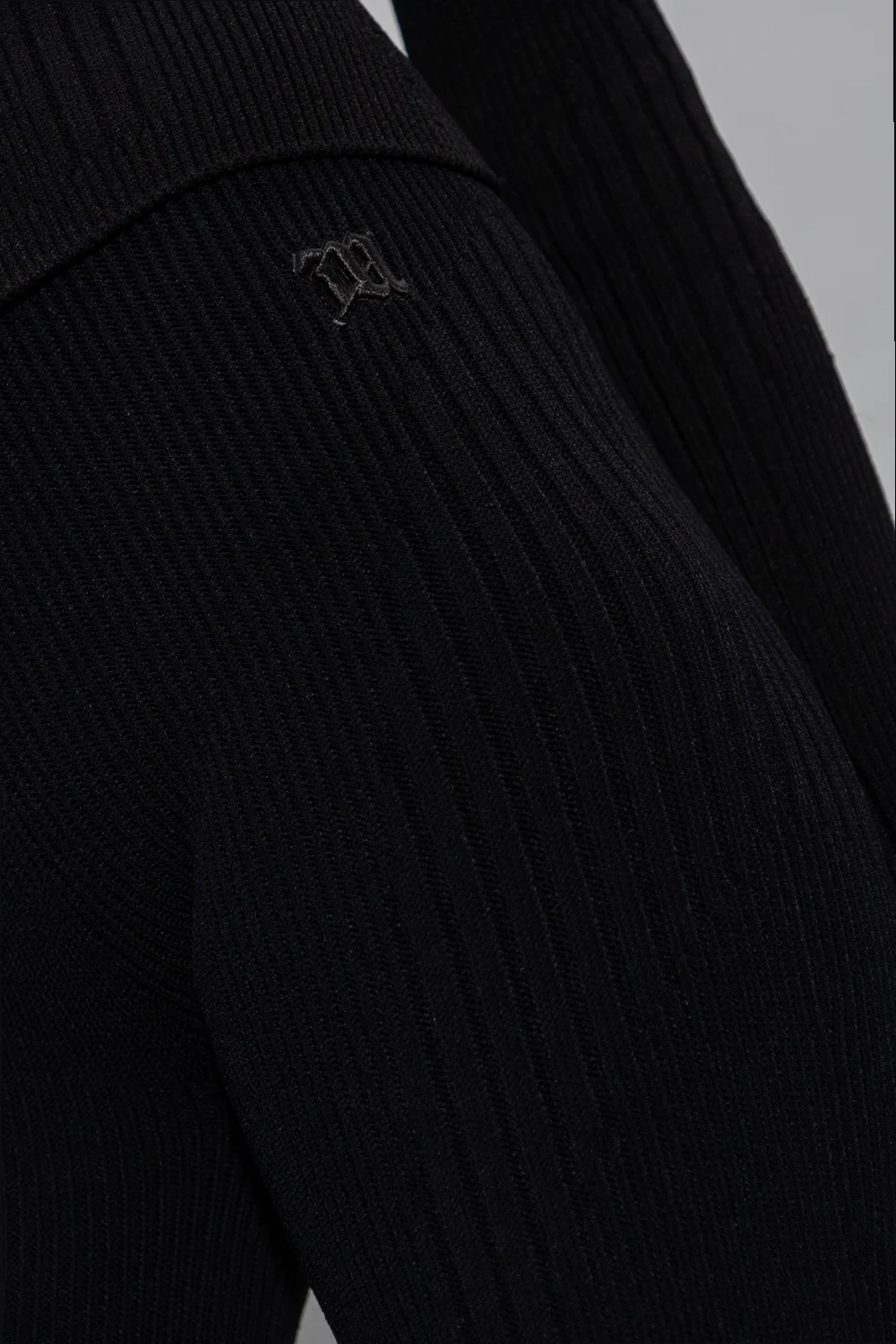 Czarne, rozszerzane spodnie z wysokim stanem MISBHV, z kolekcji ‘Garden Of Dreams’. Wykonane z prążkowanego materiału. W pasie wszyta guma. Z przodu wyszyte logo.