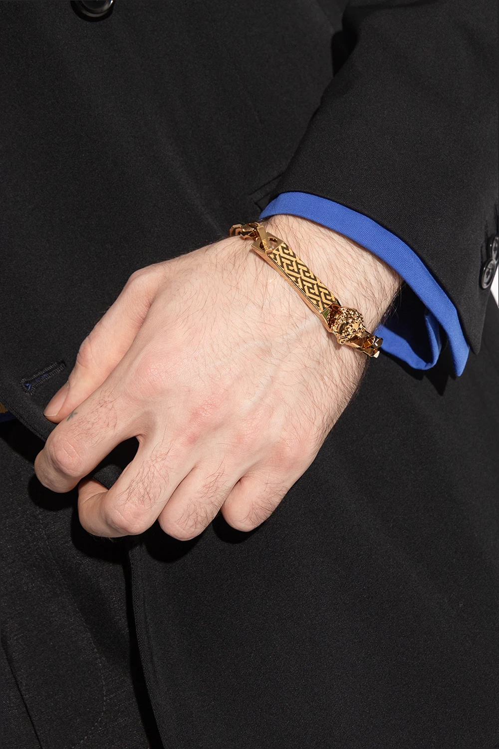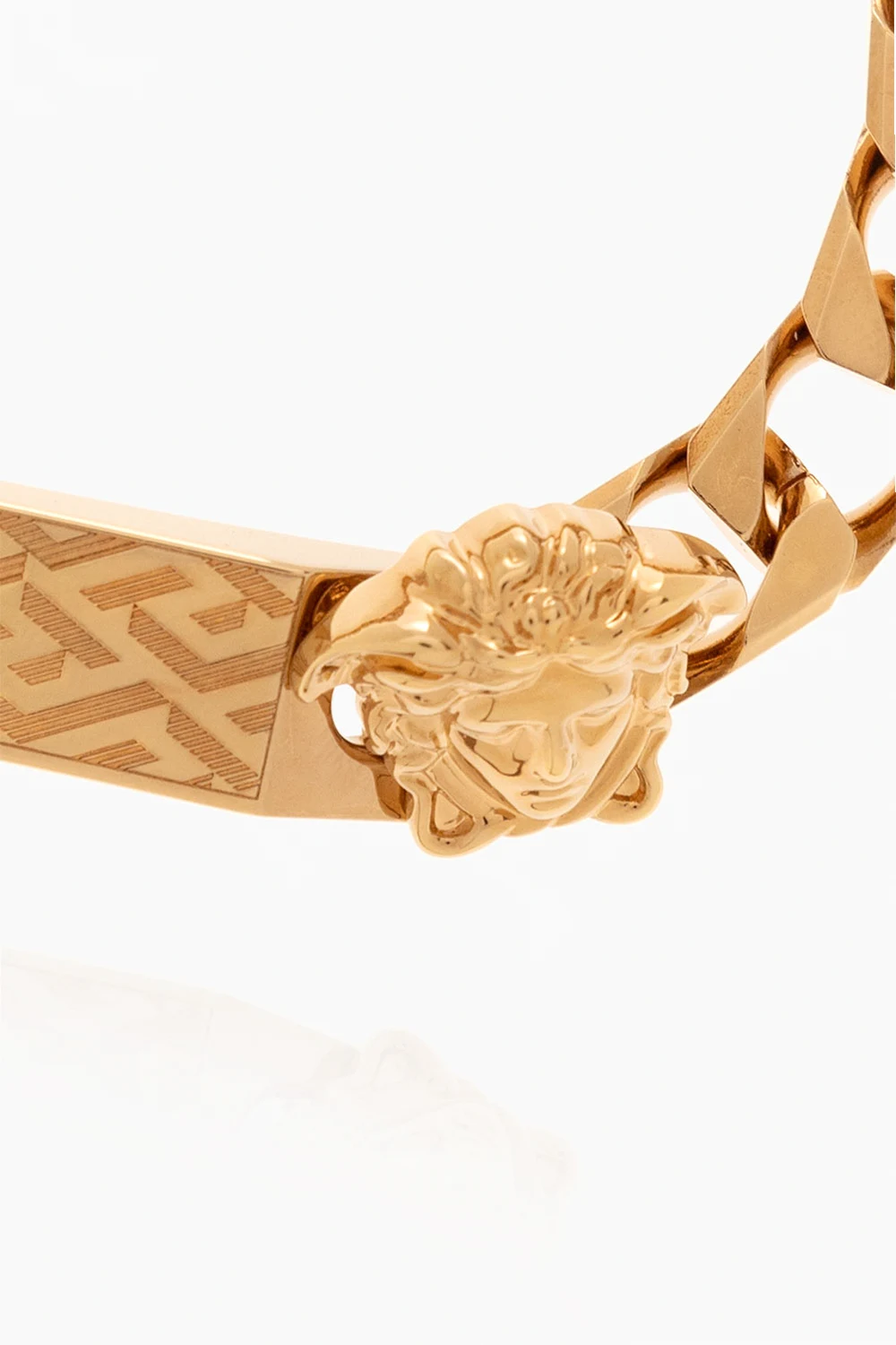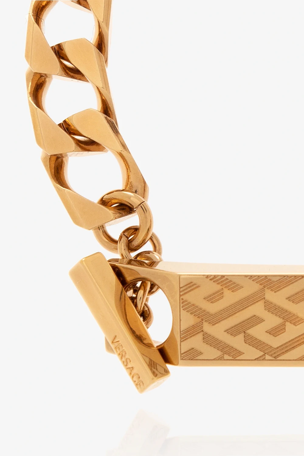 Bransoleta w kolorze złotym Versace. Zapięcie typu ‘toggle’. Dekoracyjna aplikacja z wygrawerowanym, charakterystycznym dla marki wzorem ‘La Greca’ oraz detalem w kształcie głowy Meduzy.