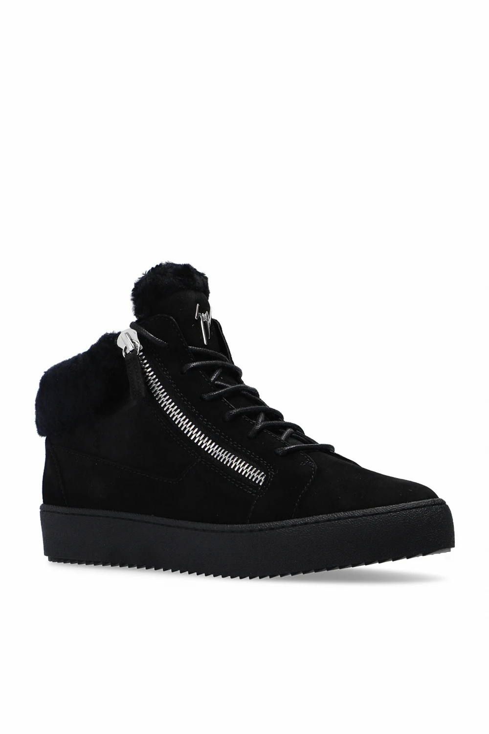 Czarne, sznurowane buty sportowe, model ‘Cole’ Giuseppe Zanotti. Wykonane z zamszu. Po bokach zapinane na zamek. Z przodu metalowe logo. Warstwa wewnętrzna wykończona futrem. Czarna, gumowa podeszwa.