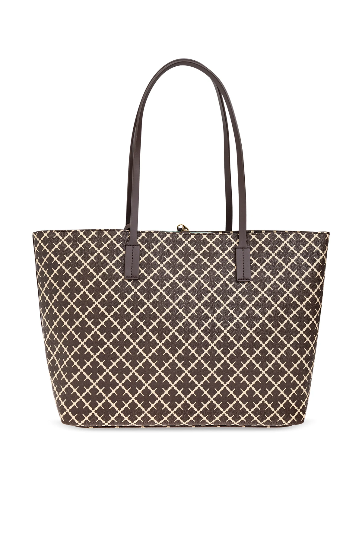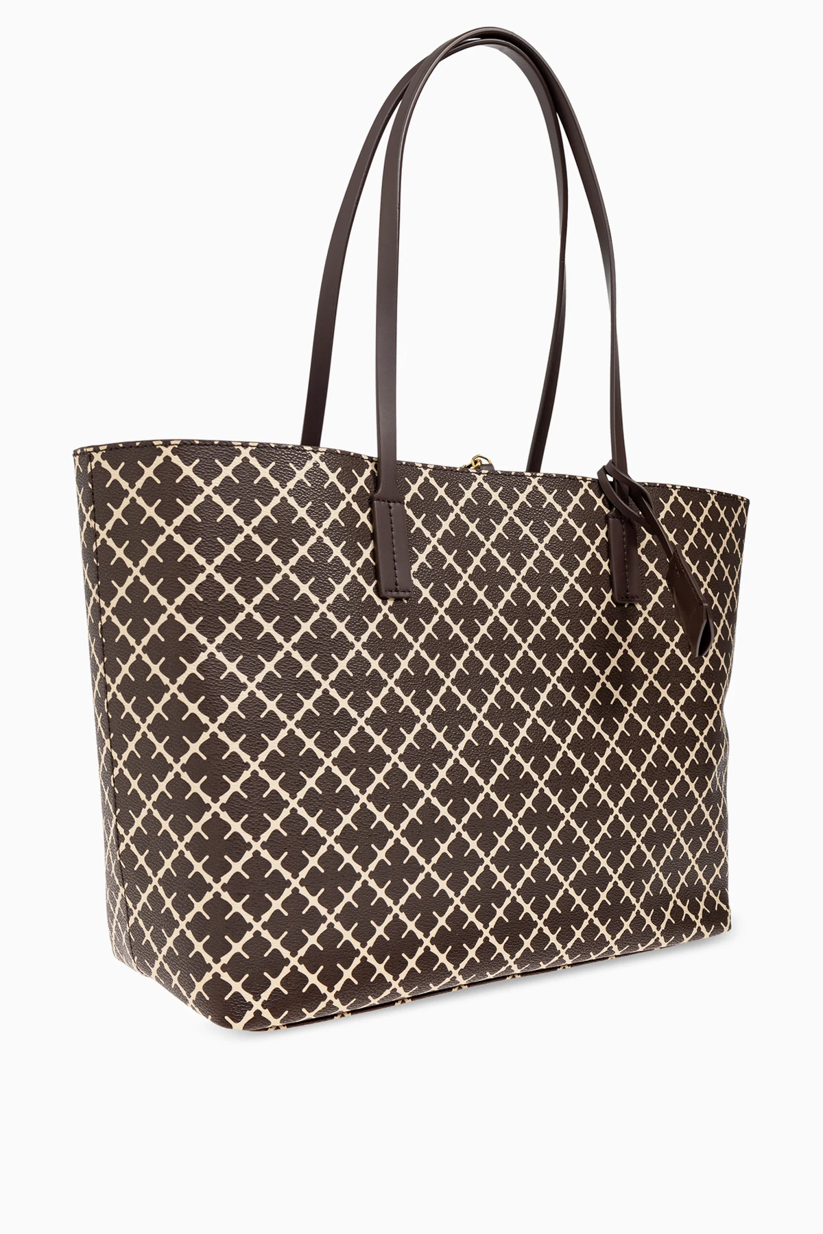 Torba wyróżnia się regularnym, geometrycznym wzorem w jasny, krzyżujący się motyw na brązowym tle, co nadaje jej wysublimowanego charakteru. Wykonana z wysokiej jakości materiału, przypominającego skórę, zachwyca trwałością oraz elegancją.