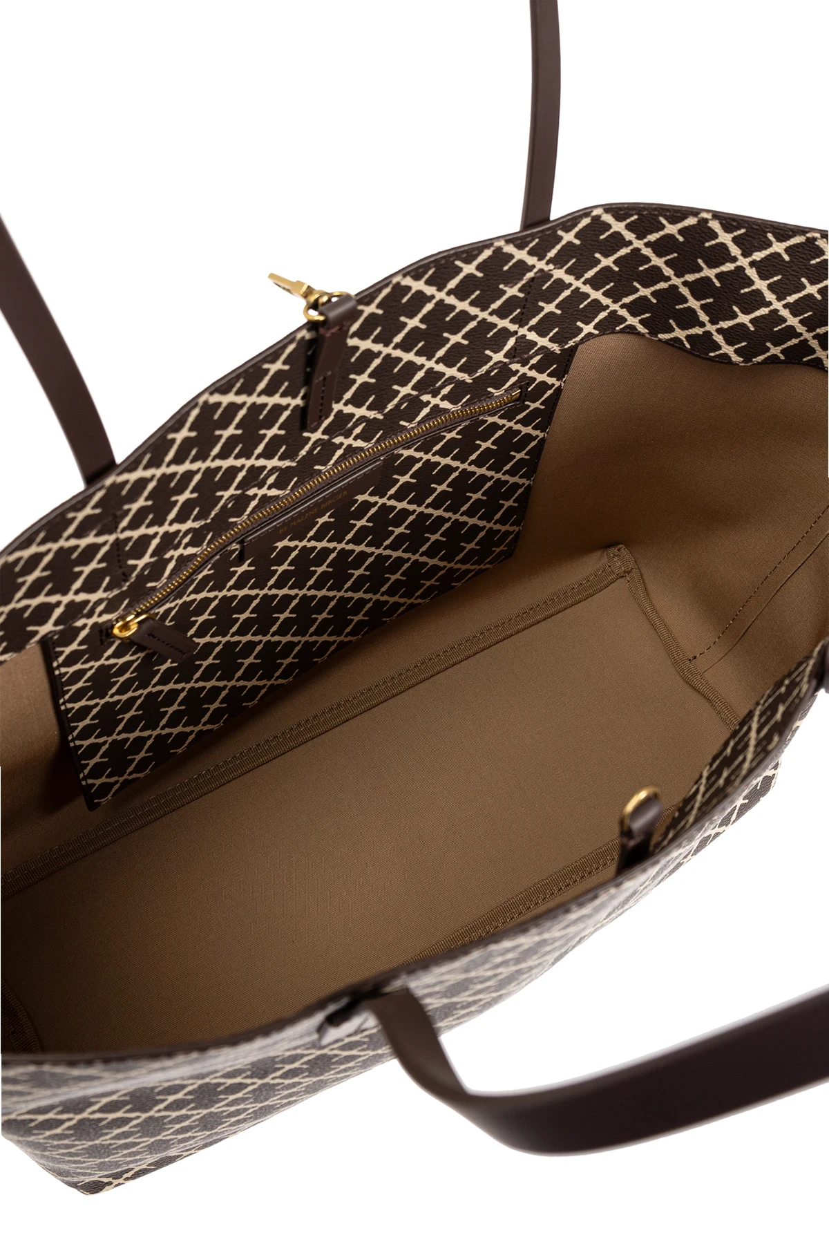 Wyposażona w długie, wąskie rączki, idealnie komponujące się z brązową kolorystyką, oraz przywieszkę z logo projektanta, torba jest kwintesencją stylu i funkcjonalności. Jej jasne wnętrze, z praktyczną kieszenią na zamek, ułatwia organizację przestrzeni.
