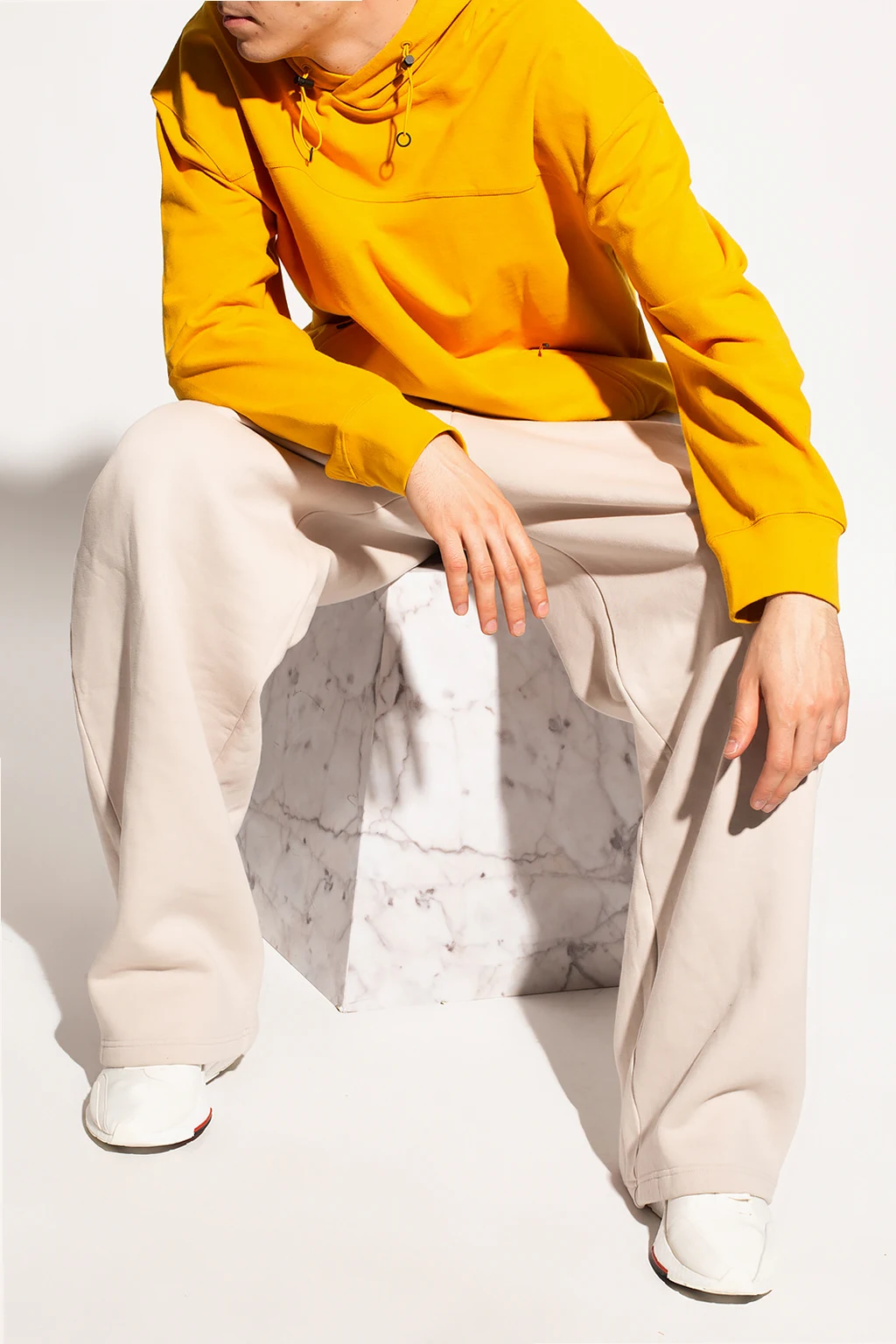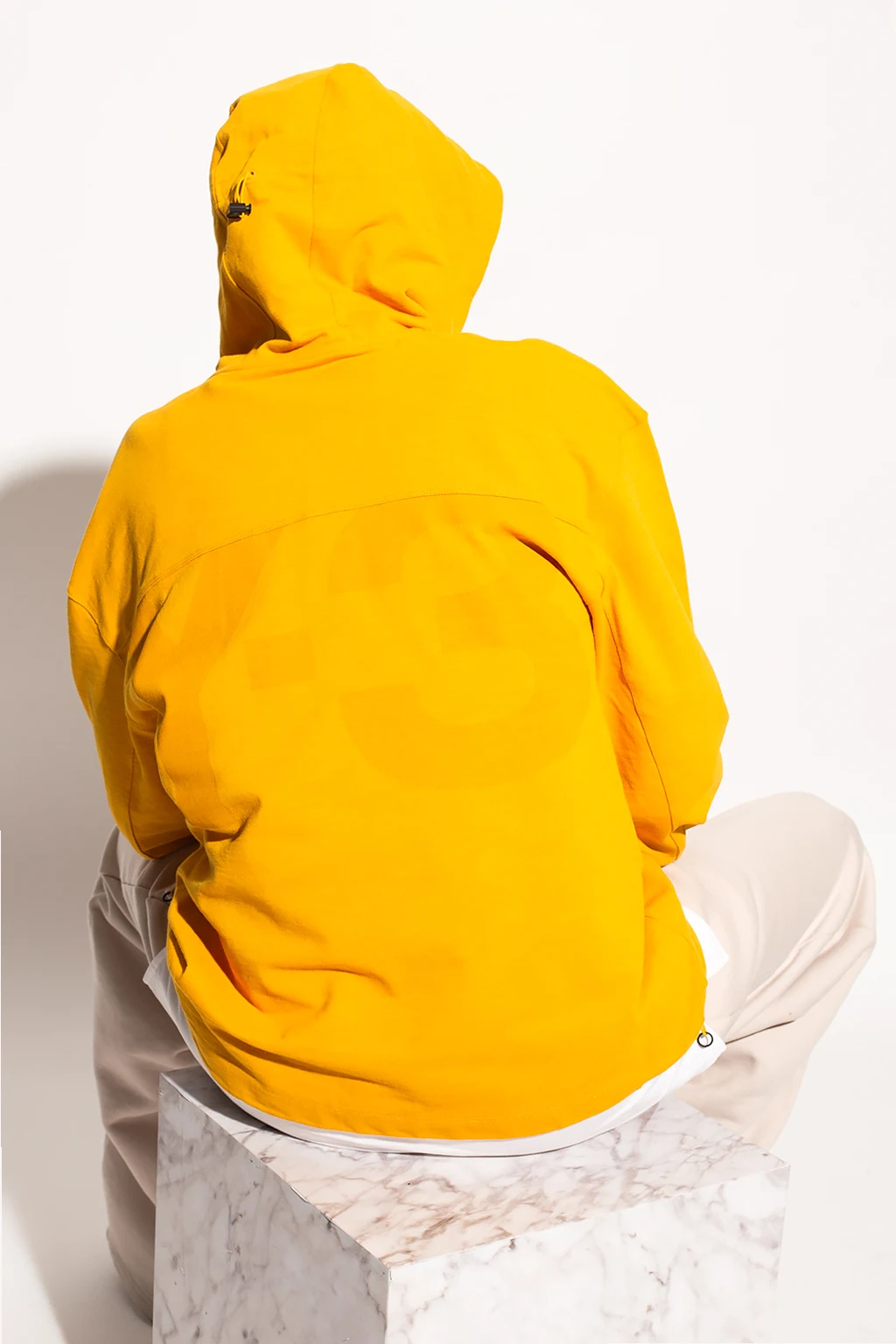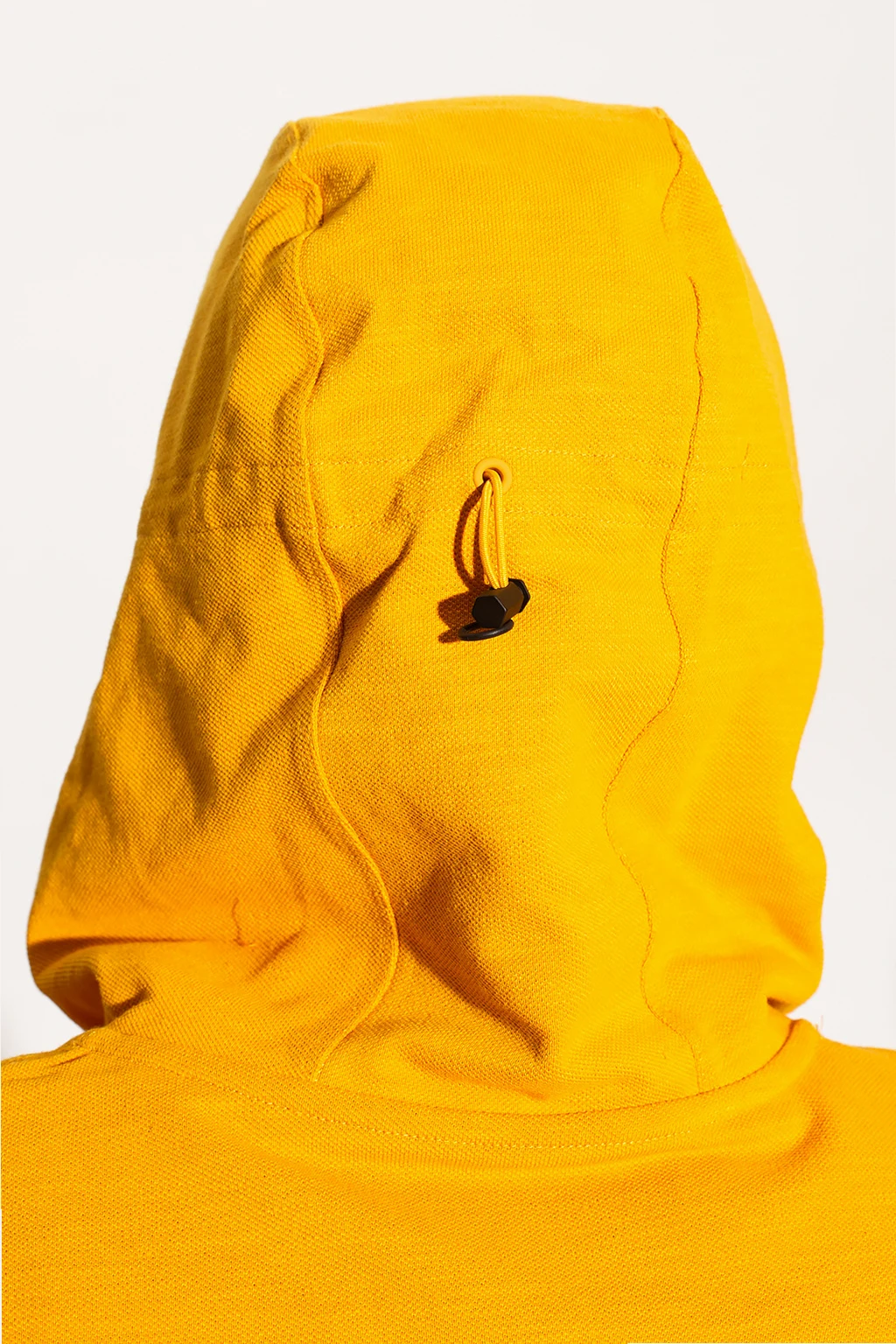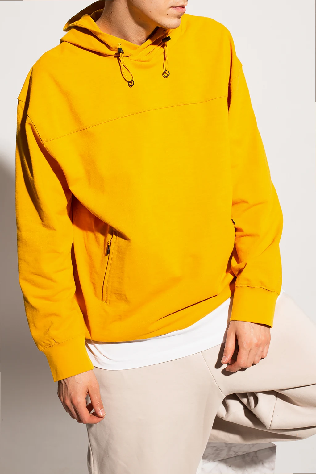 Żółta, bawełniana bluza z kapturem Y-3 Yohji Yamamoto. Wykończona lnem. Kaptur ściągany trokami. Z przodu dwie kieszenie zapinane na zamek. Po bokach ściągana trokami. Rękawy zakończone ściągaczami.