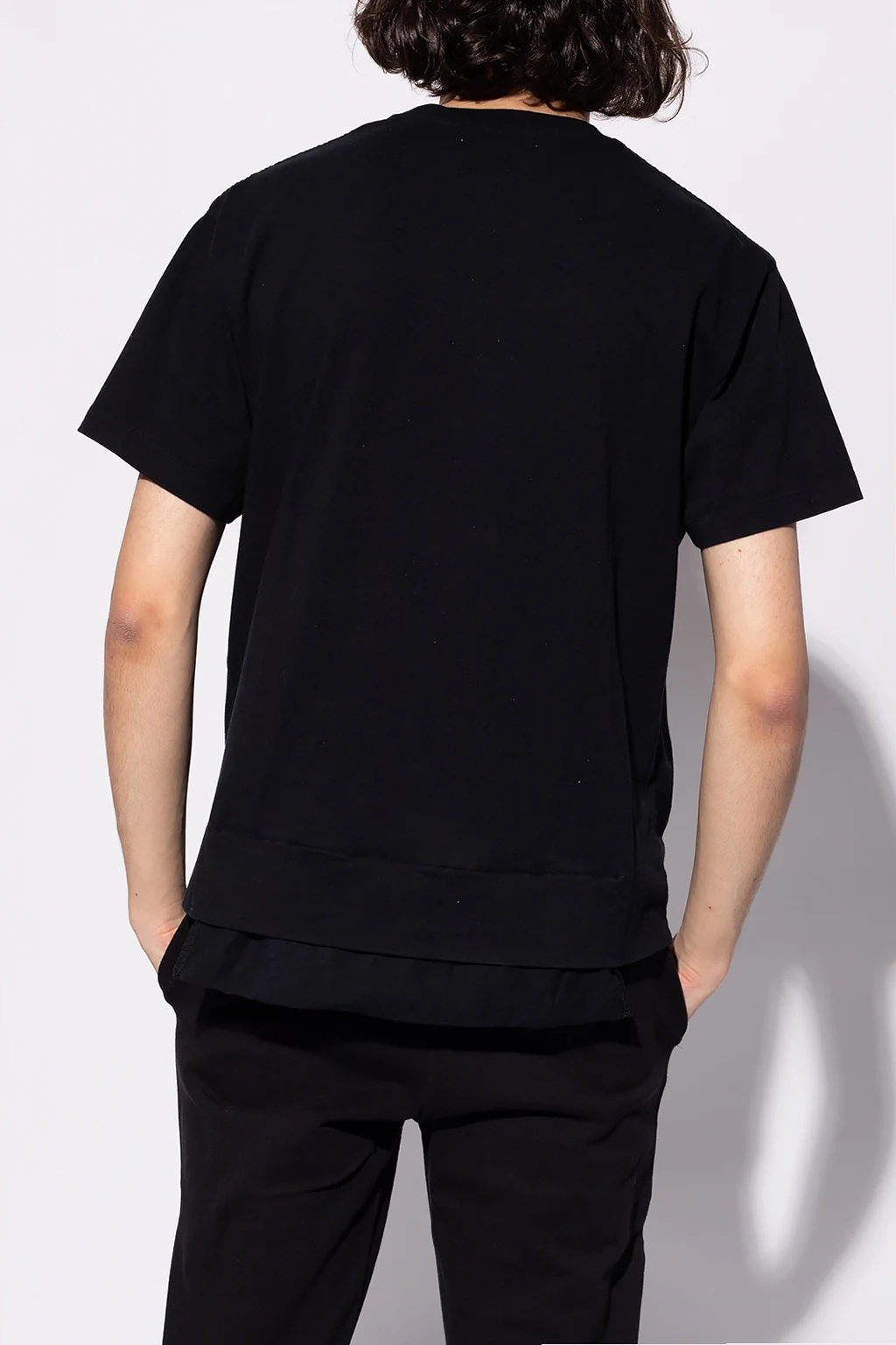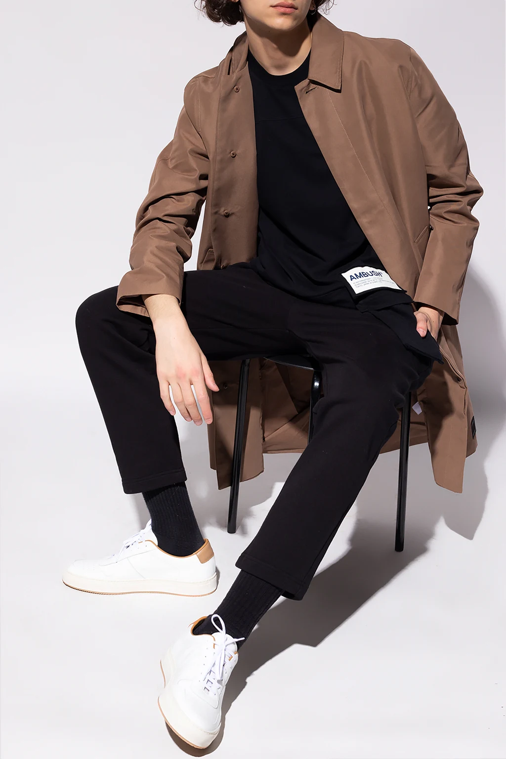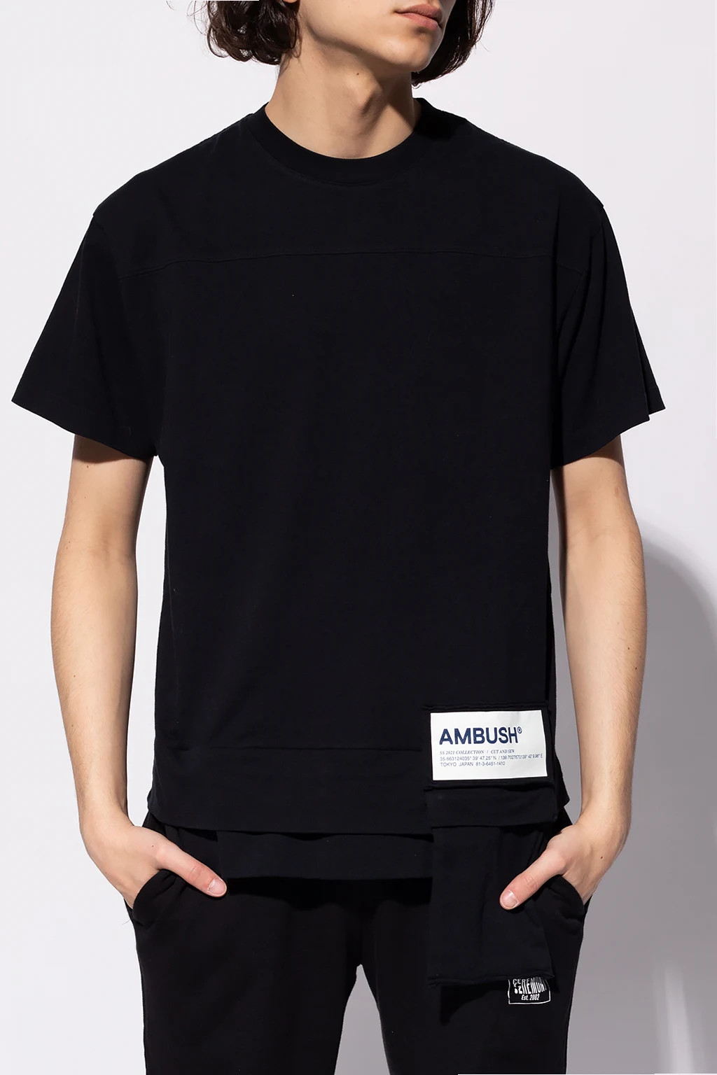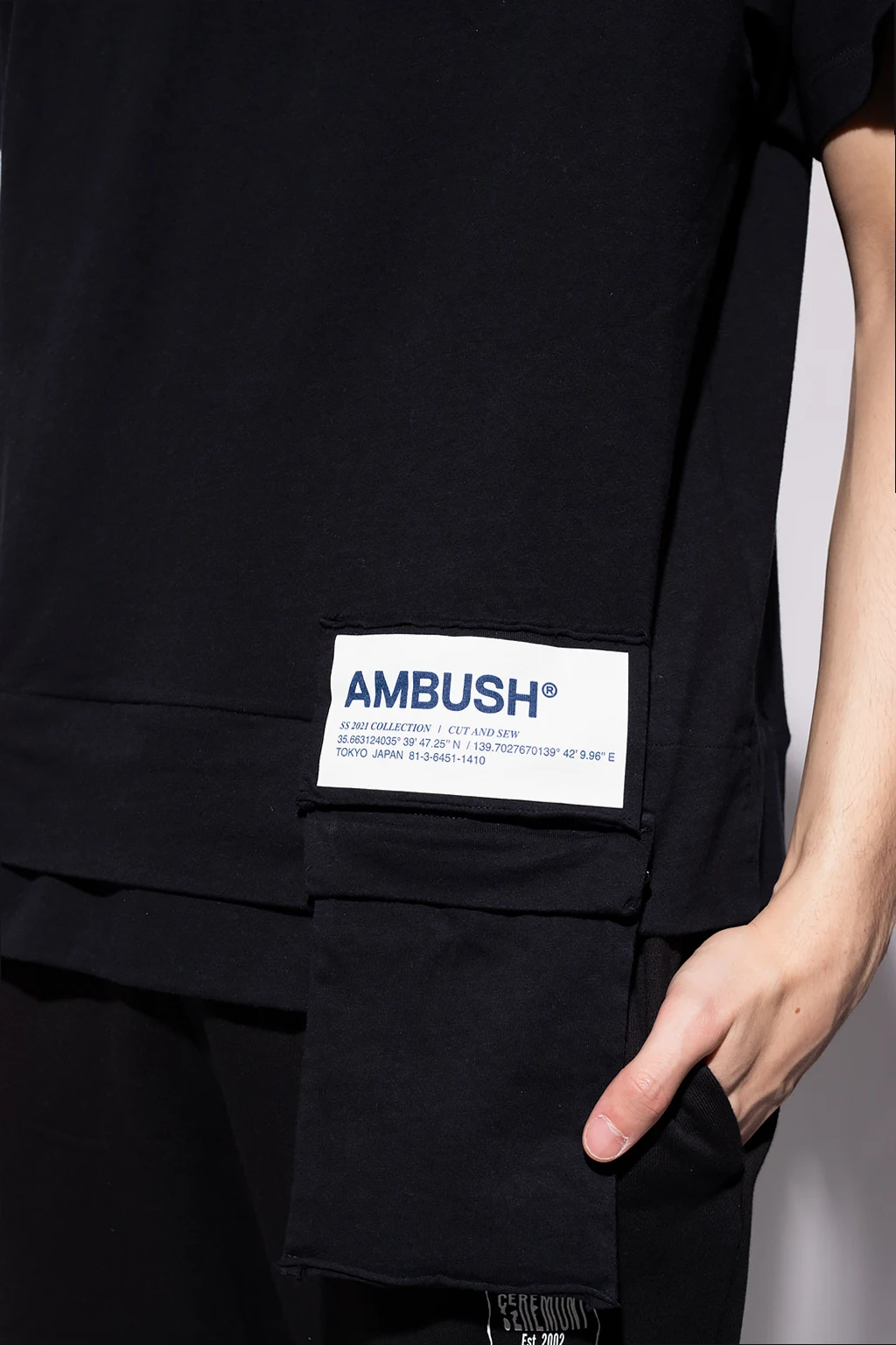 Czarny t-shirt Ambush. Wykonany z bawełny. Ozdobiony naszywką z logo w kolorze biało-granatowym. Kieszeń zamykana na zamek. Okrągły dekolt wykończony ściągaczem. Krótkie rękawy.