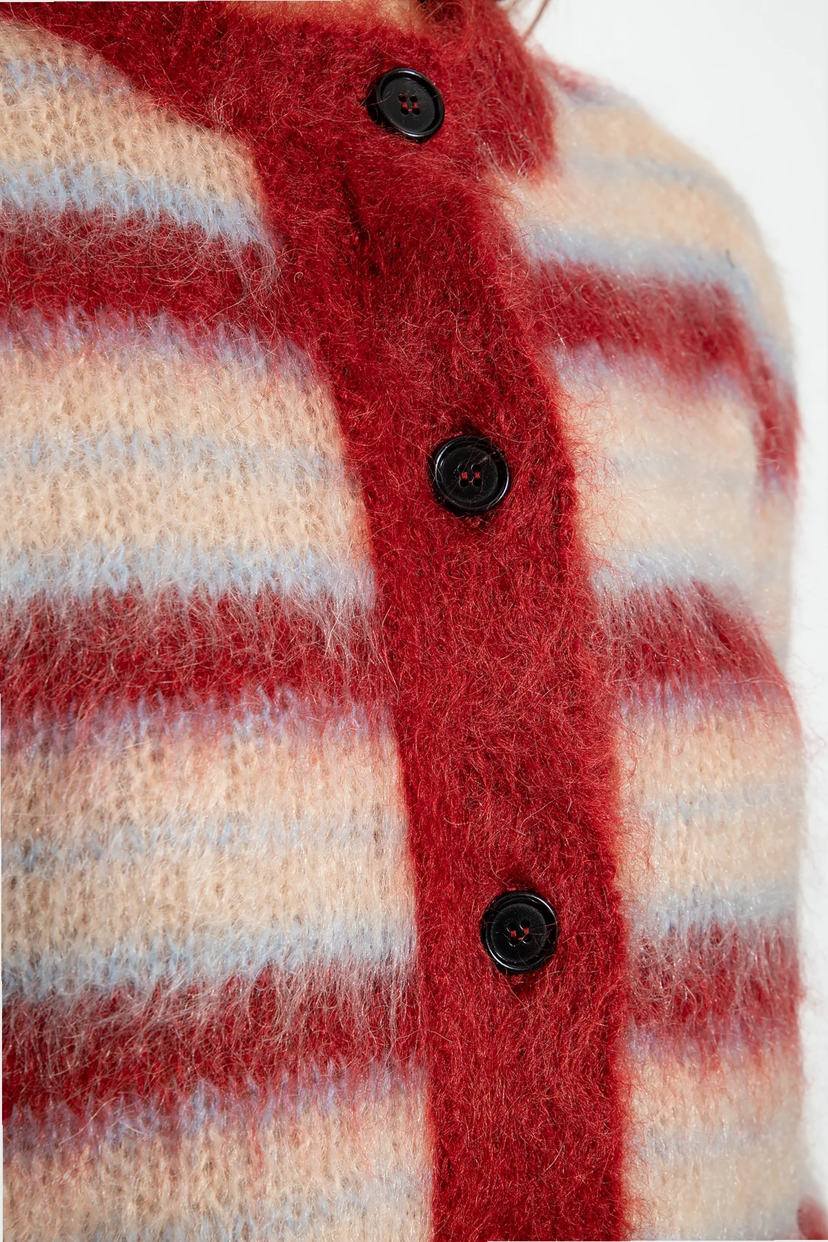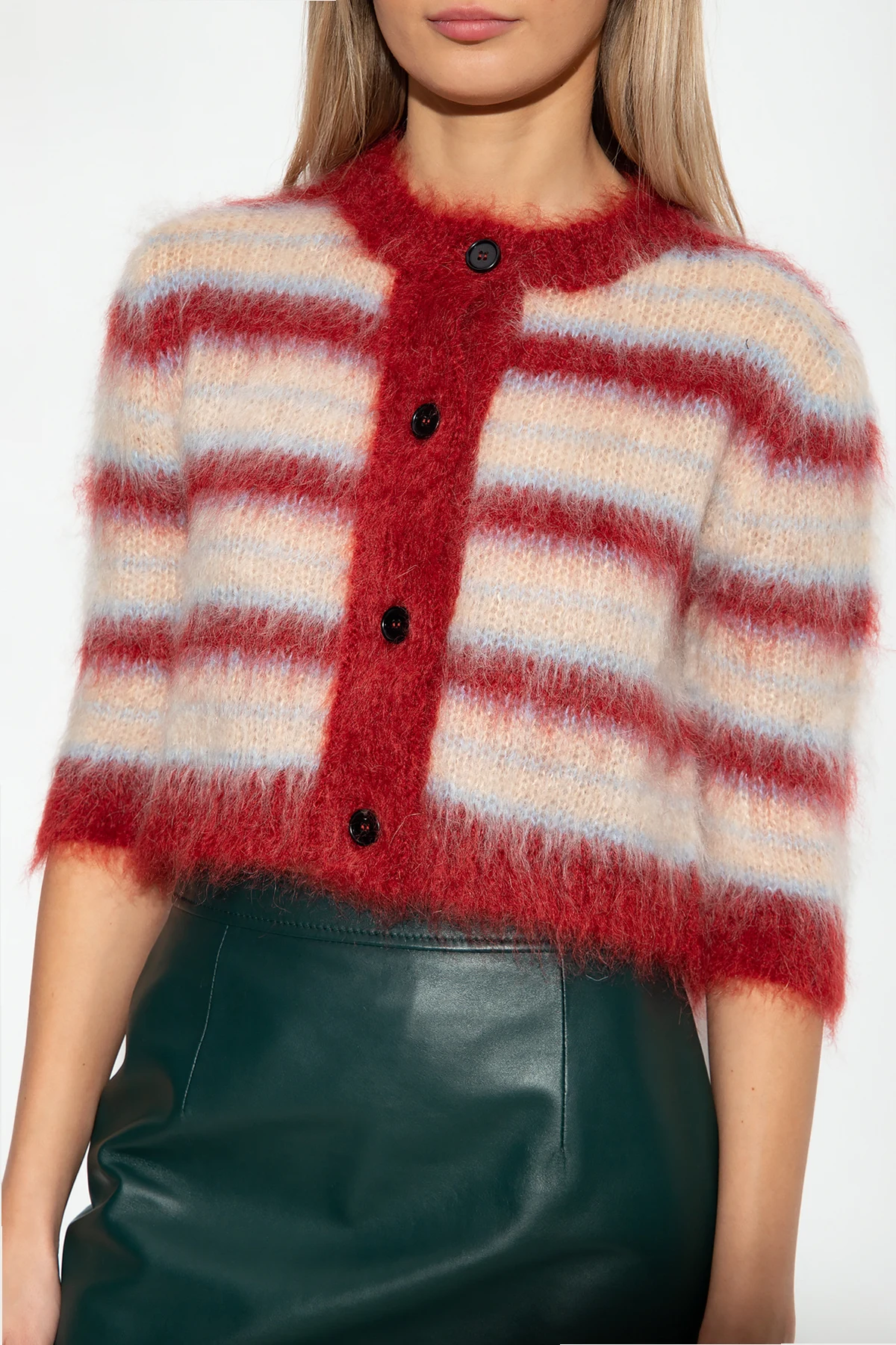 Czerwono-niebiesko-kremowy, krótki kardigan Marni. Wykonany z mieszanki moheru. Zapinany na guziki. Ozdobiony wzorem w paski. Okrągły dekolt. Rękawy o długości trzy czwarte.