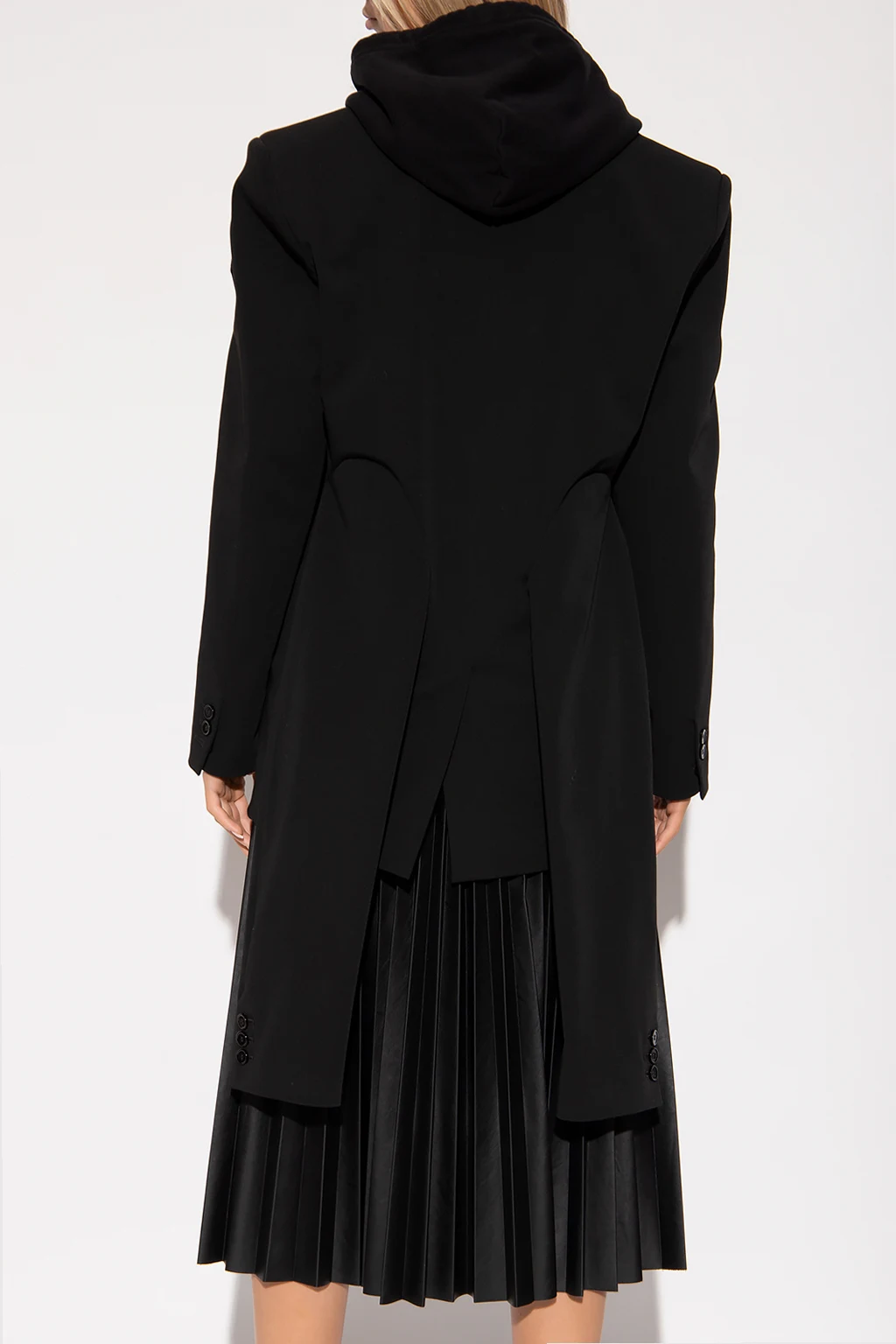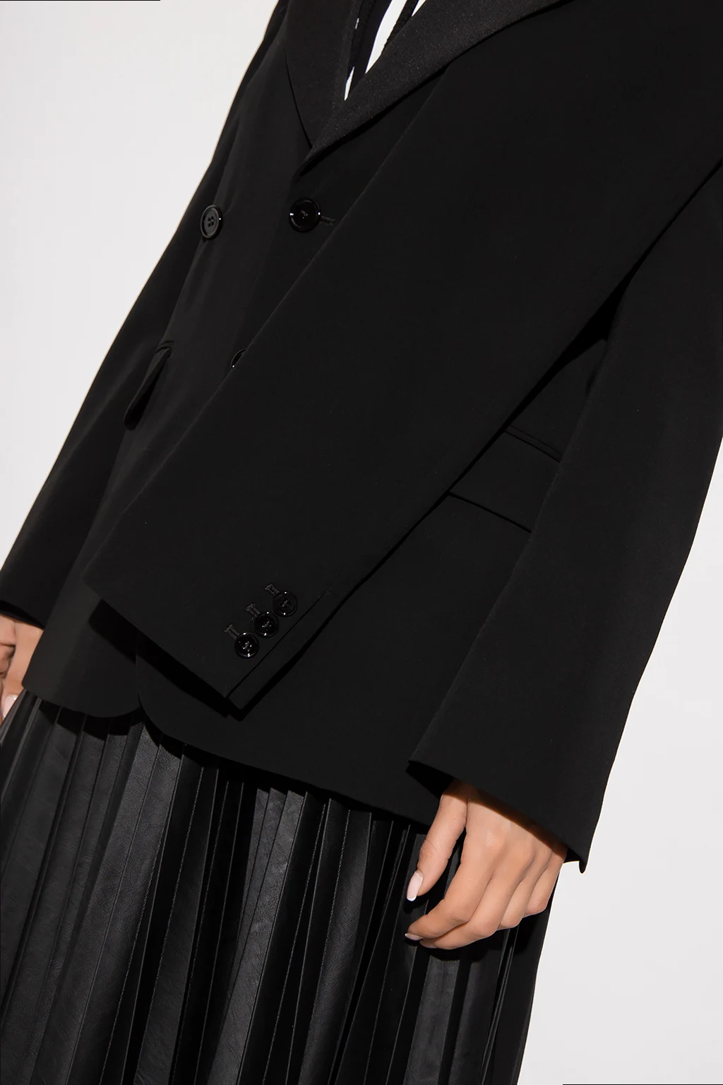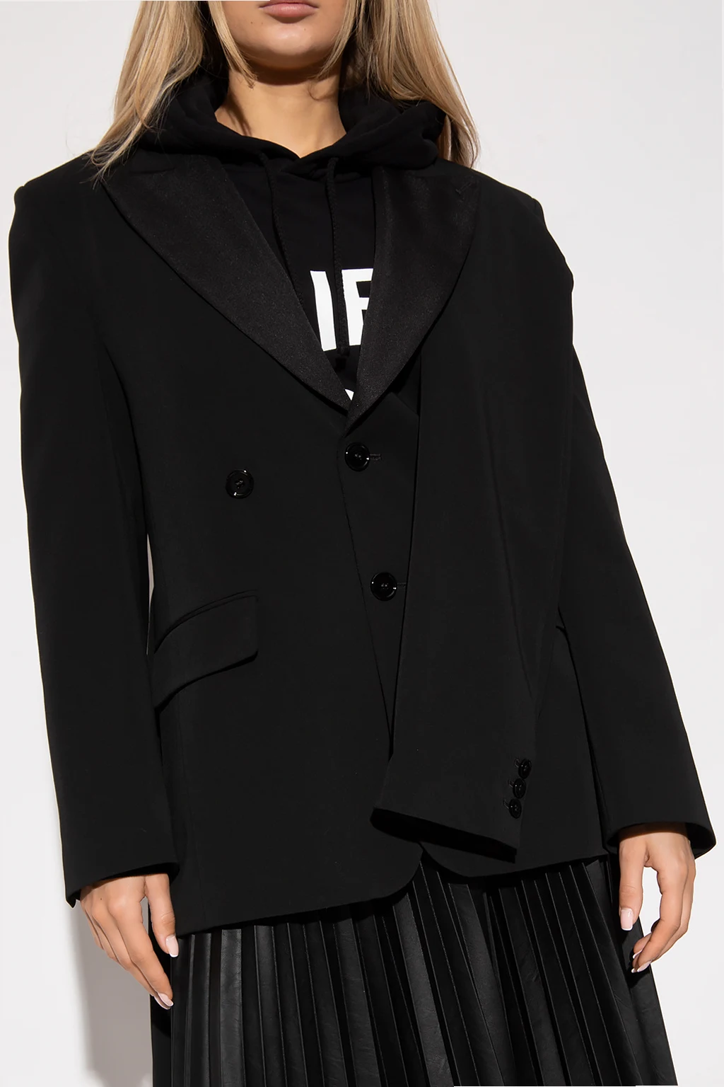 Czarna marynarka z zamkniętymi klapami MM6 Maison Margiela. Wykonana z łączonych materiałów. Zapinana na guziki. Dekoracyjne wykończenie imitujące długie rękawy. Z przodu trzy kieszenie, dwie z patką. Długie rękawy, mankiety zapinane na guzik. Z tyłu pojedyncze rozcięcie.
