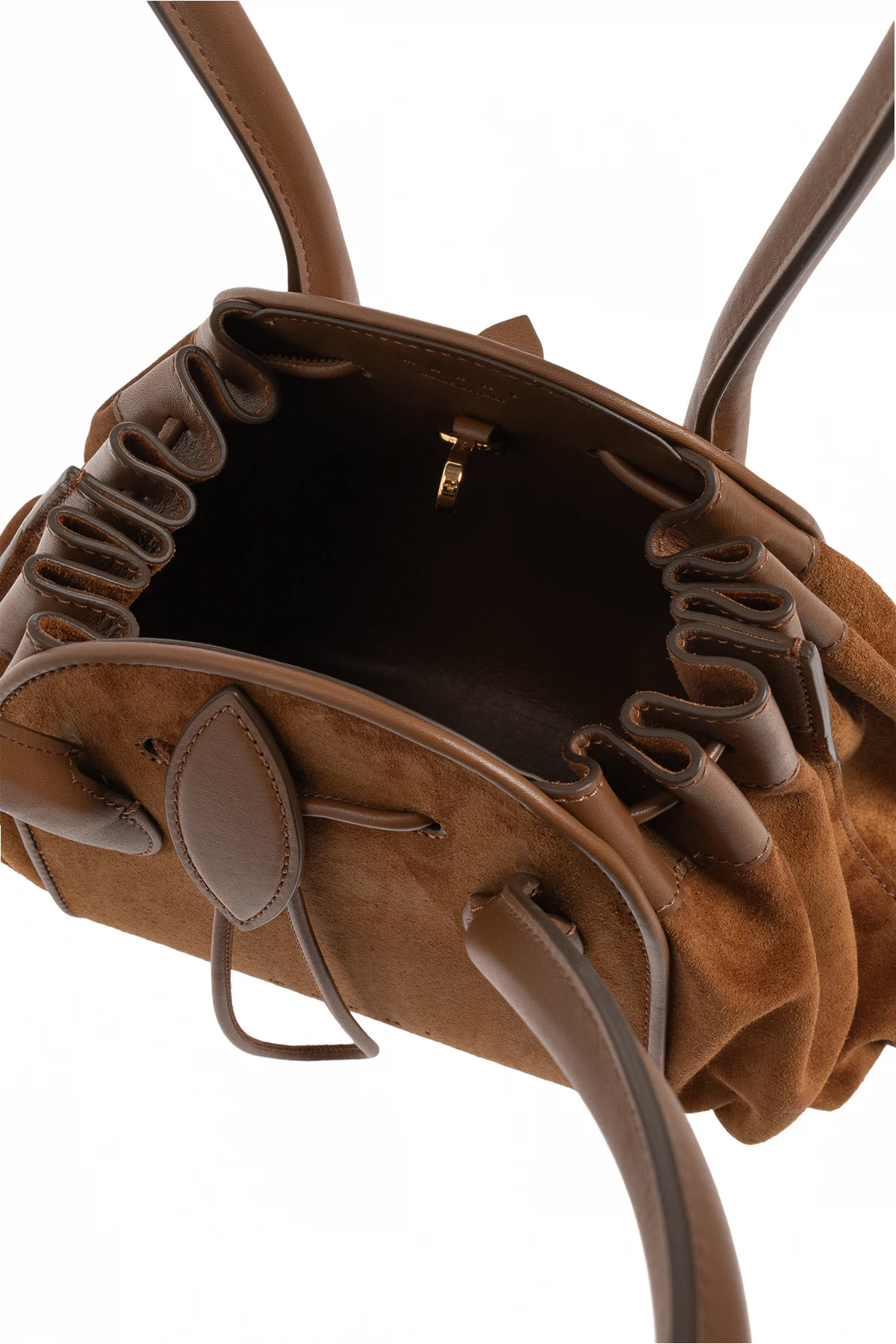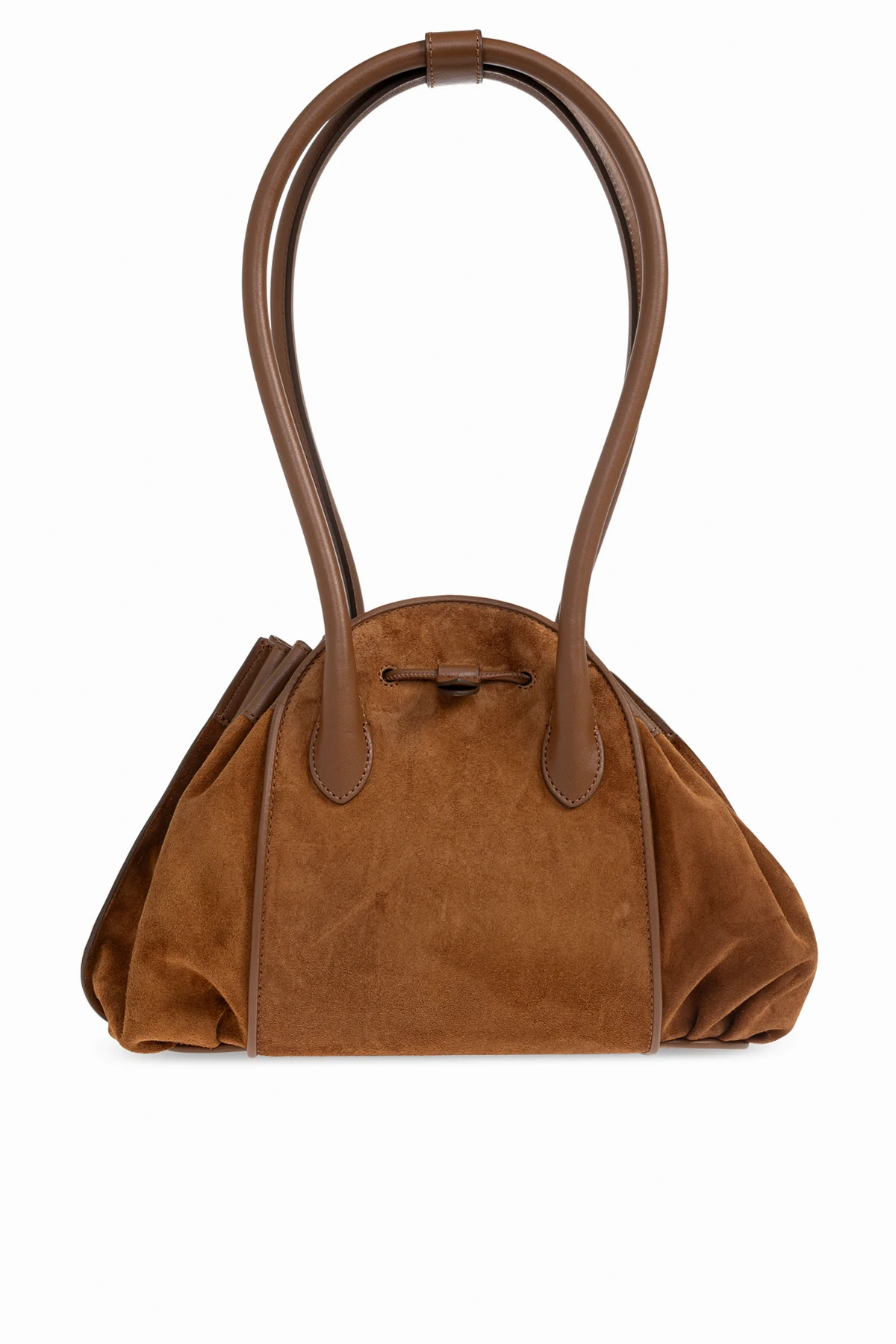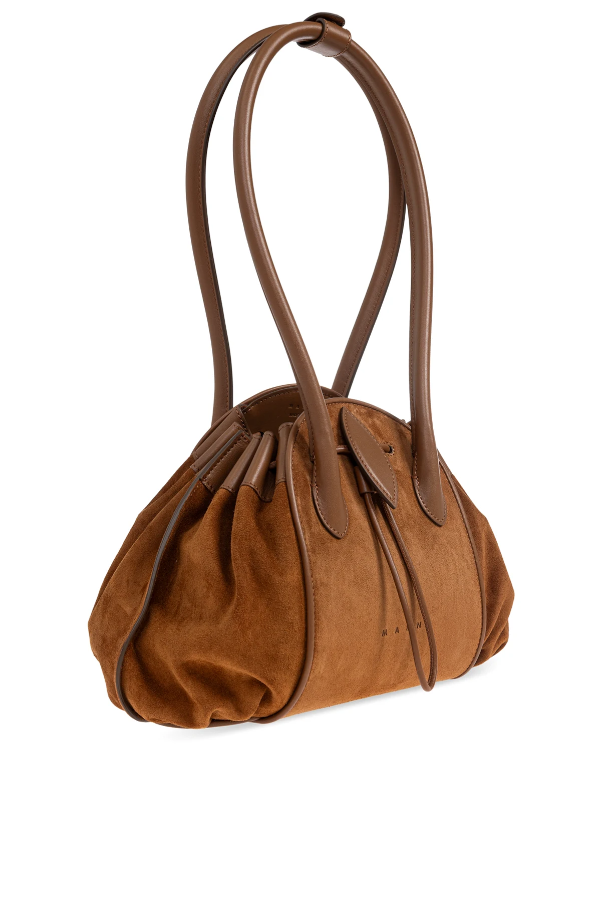 Zamszowa torba na ramię z ekskluzywnej kolekcji marki Marni zachwyca wyrafinowaną formą oraz wyczuciem detalu. Jej elegancki, workowaty kształt, delikatnie zaokrąglony i z miękko układającymi się bokami, stanowi kunsztowną interpretację klasyki. Wysokogatunkowy zamsz w ciepłym, brązowym kolorze subtelnie współgra z licowoskórzanymi wykończeniami, podkreślając luksusowy charakter produktu.