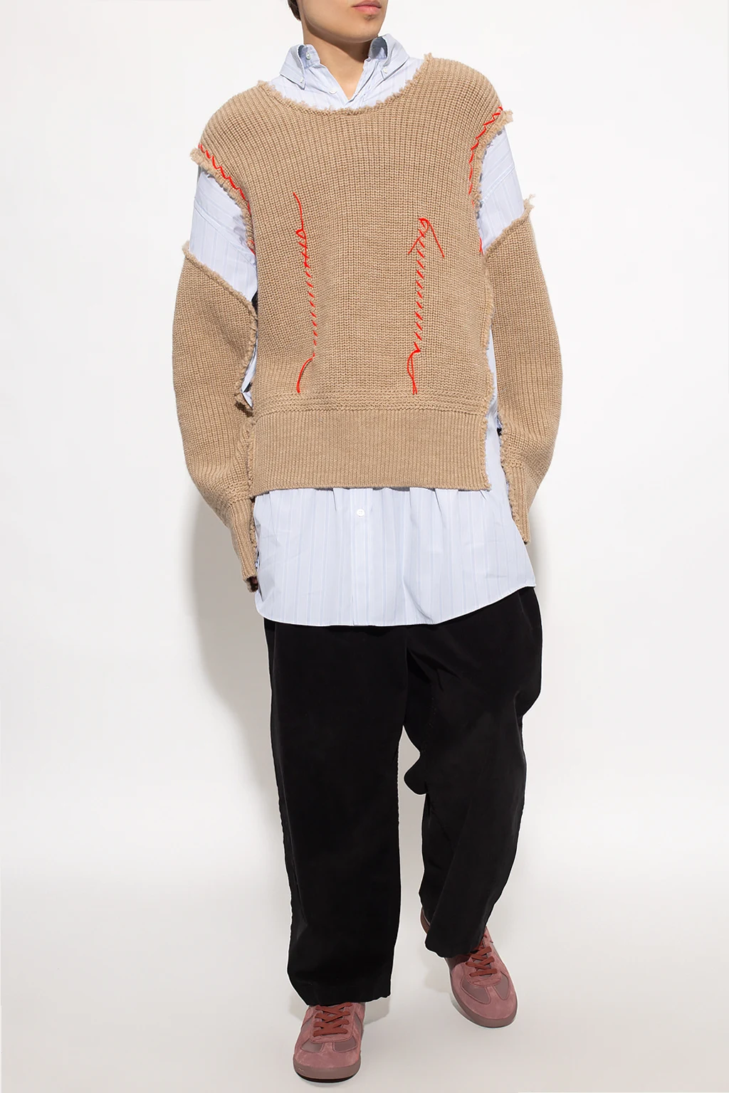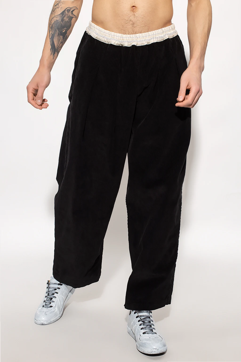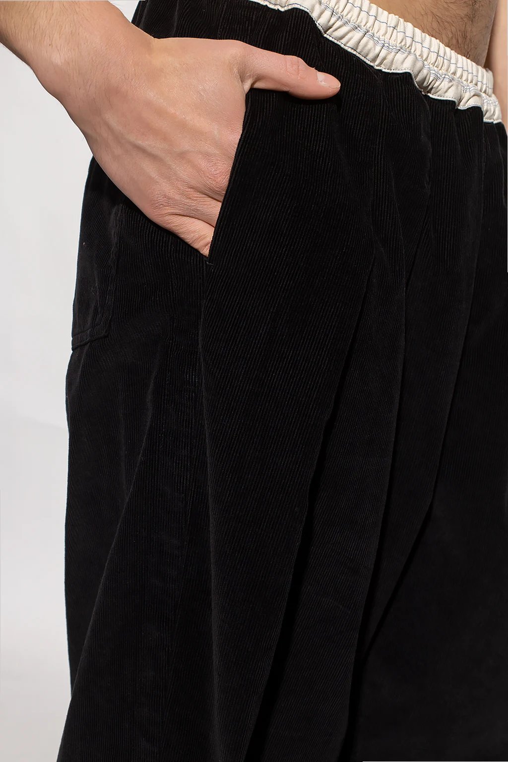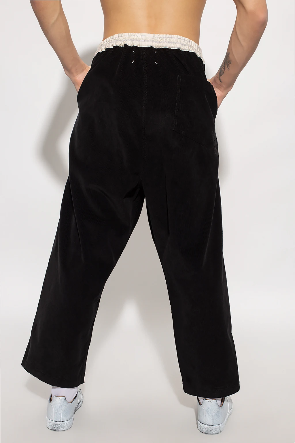 Czarne, sztruksowe spodnie Maison Margiela. Wykonane z bawełny. W pasie wszyta kremowa guma ozdobiona niebieskim wzorem w pasy i ściągana trokami. Trzy wsuwane kieszenie: dwie z przodu oraz z tyłu. Długie nogawki o luźnym kroju ozdobione pojedynczymi zakładkami.