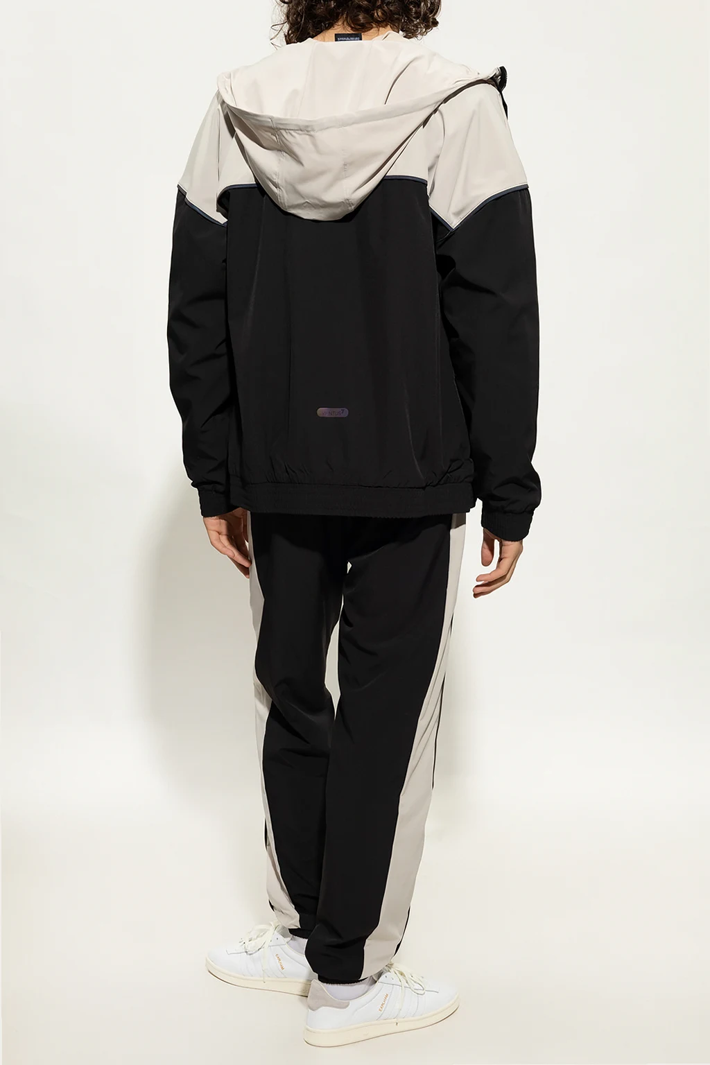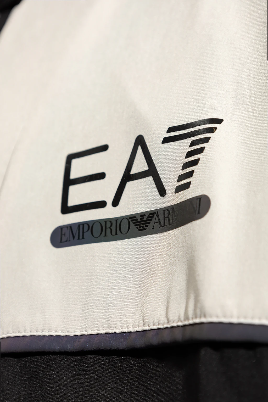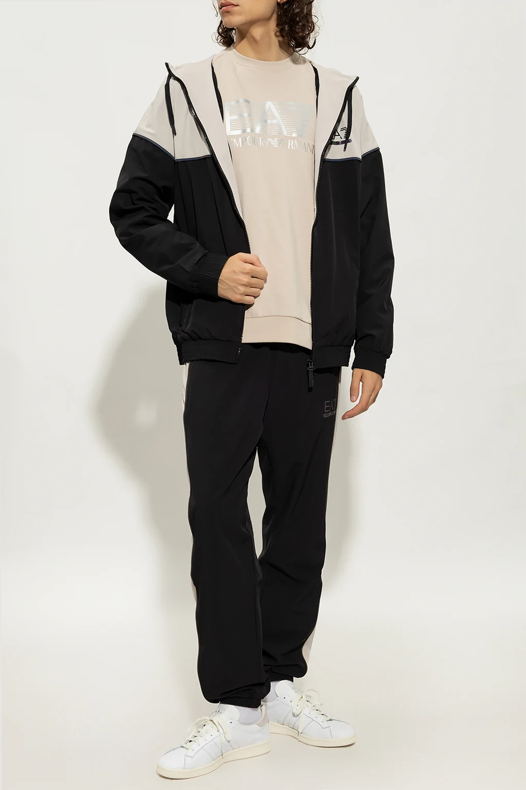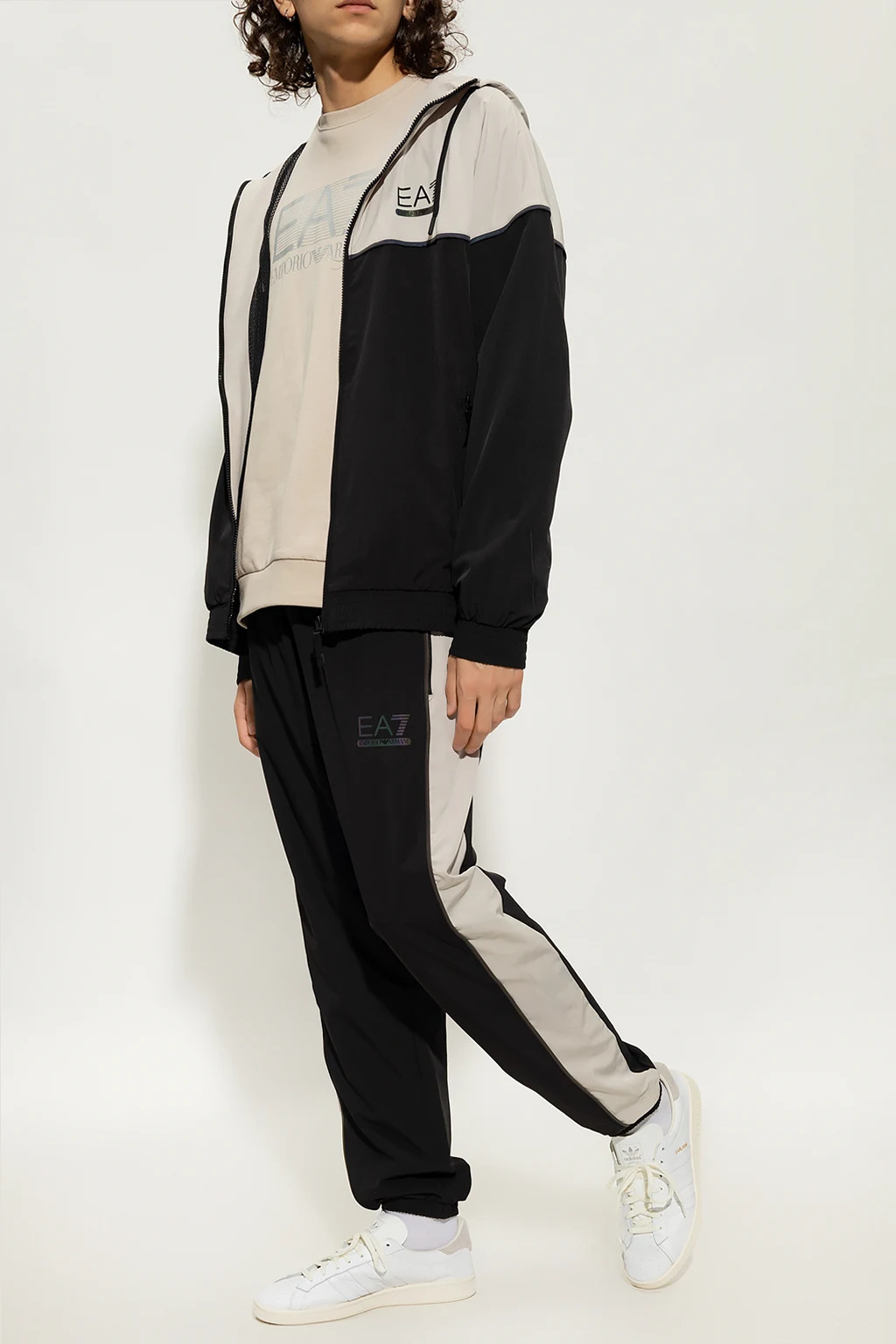 Czarno-jasnobeżowy komplet: kurtka z kapturem i spodnie dresowe EA7 Emporio Armani. Wykonany z technicznego, elastycznego materiału VENTUS7 zapewniającego komfort podczas aktywności fizycznej. Ozdobiony kolorowymi, odblaskowymi elementami oraz logo. Kurtka zapinana na zamek. Z przodu dwie kieszenie zamykane na zamek. Dół i długie rękawy zakończone ściągaczami. Kaptur ściągany trokami. Długie spodnie z jasnobeżowymi lampasami. W pasie wszyta guma ściągana trokami. Z przodu dwie kieszenie zamykane na zamek. Nogawki zakończone ściągaczami.
