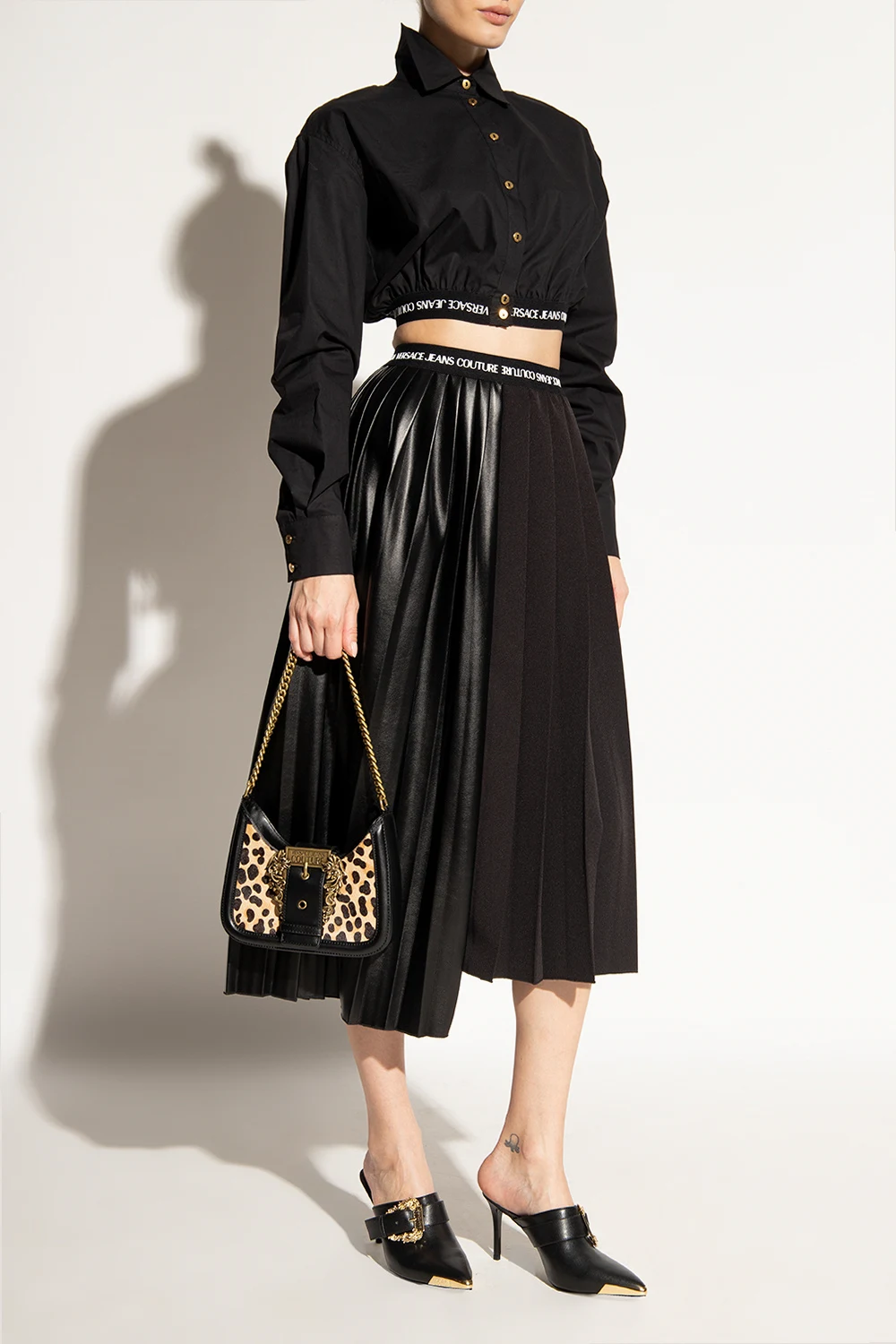 Czarne, skórzane klapki na obcasie Versace Jeans Couture. Ozdobione paskiem z dekoracyjną klamrą barokową w kolorze złotym oraz metalowym wykończeniem noska w wygrawerowanym logo. Czarna, gumowa podeszwa.