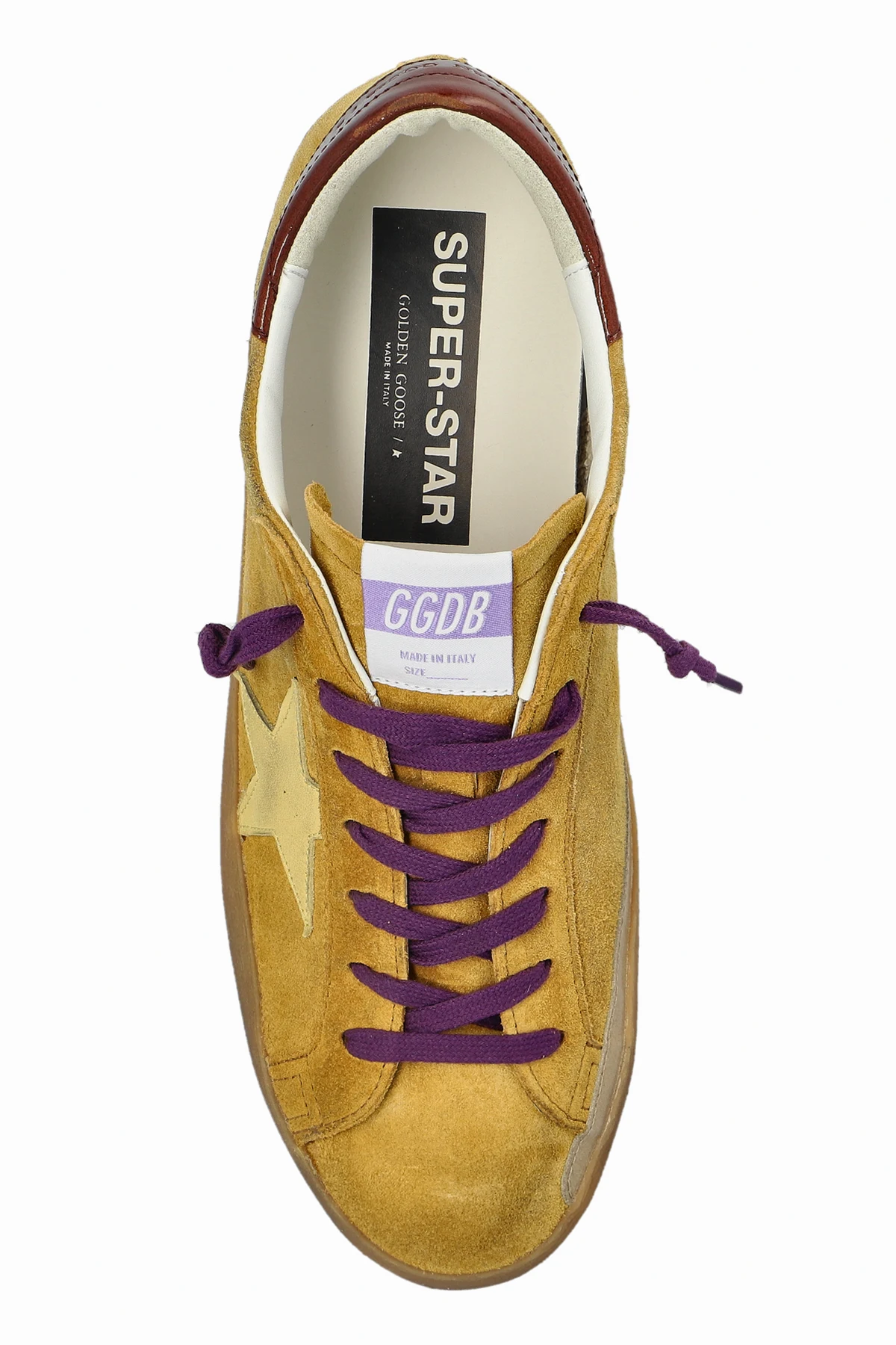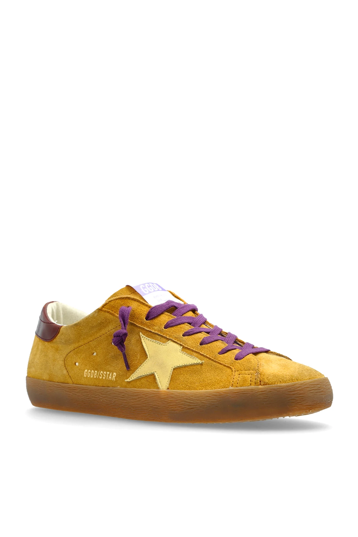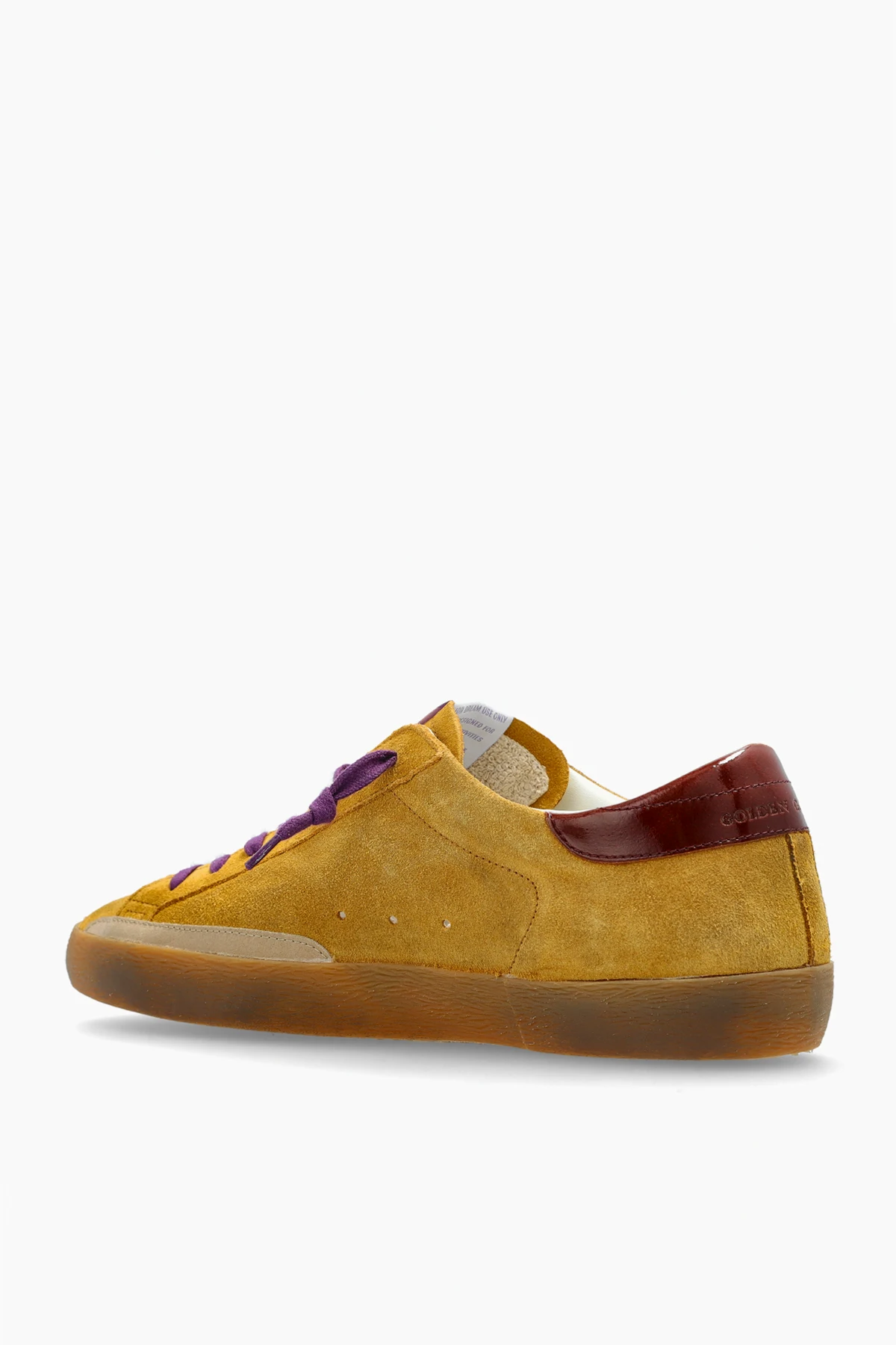 Uwagę przykuwają oryginalne detale: kontrastowe fioletowe sznurowadła, kremowa gwiazda po boku, bordowy zapiętek z gładkiej skóry licowej oraz gustowne brązowe akcenty na podeszwie. Boczne tłoczenie "GOLDENSTAR" podkreśla autentyczność projektu. Wnętrze ze skóry i materiału zapewnia nieporównywalny komfort, a gumowa podeszwa – doskonałą przyczepność.