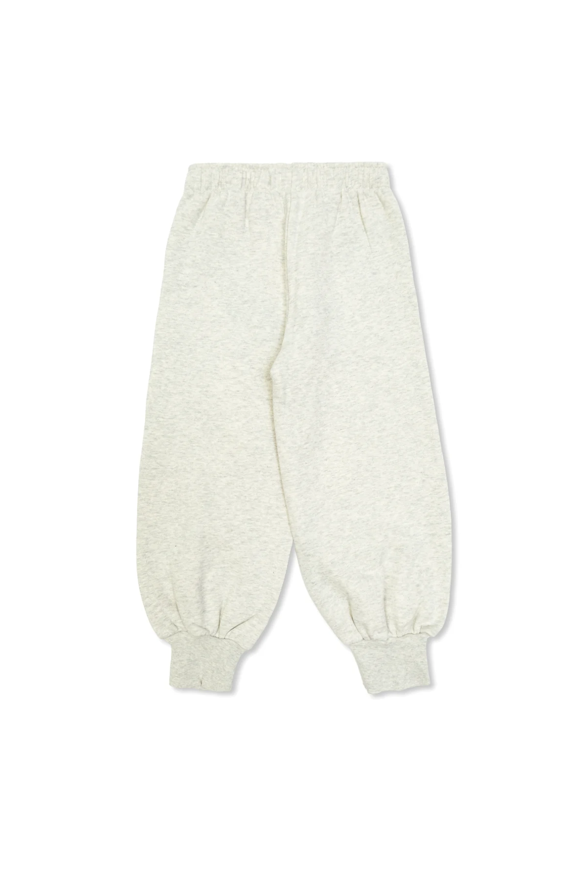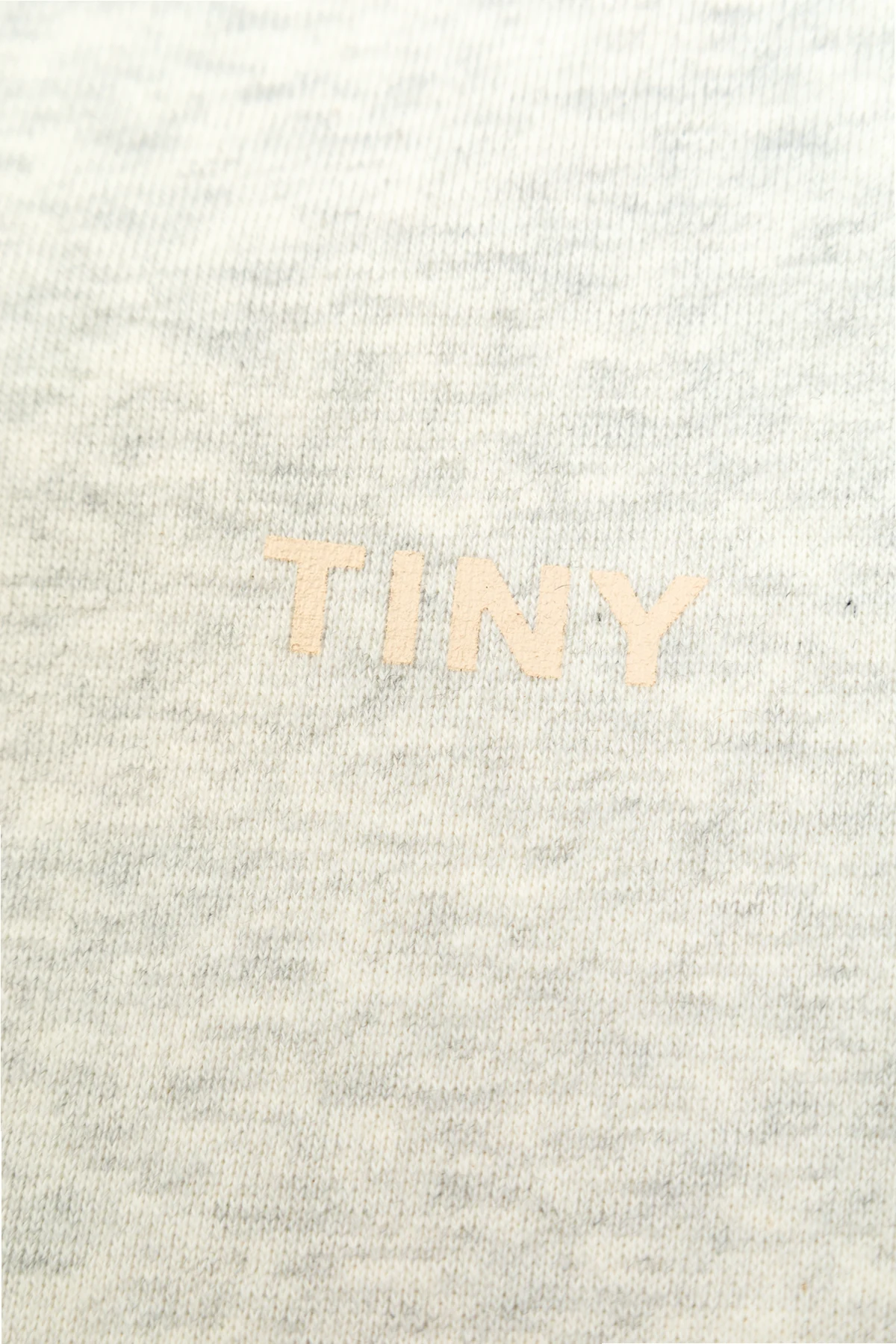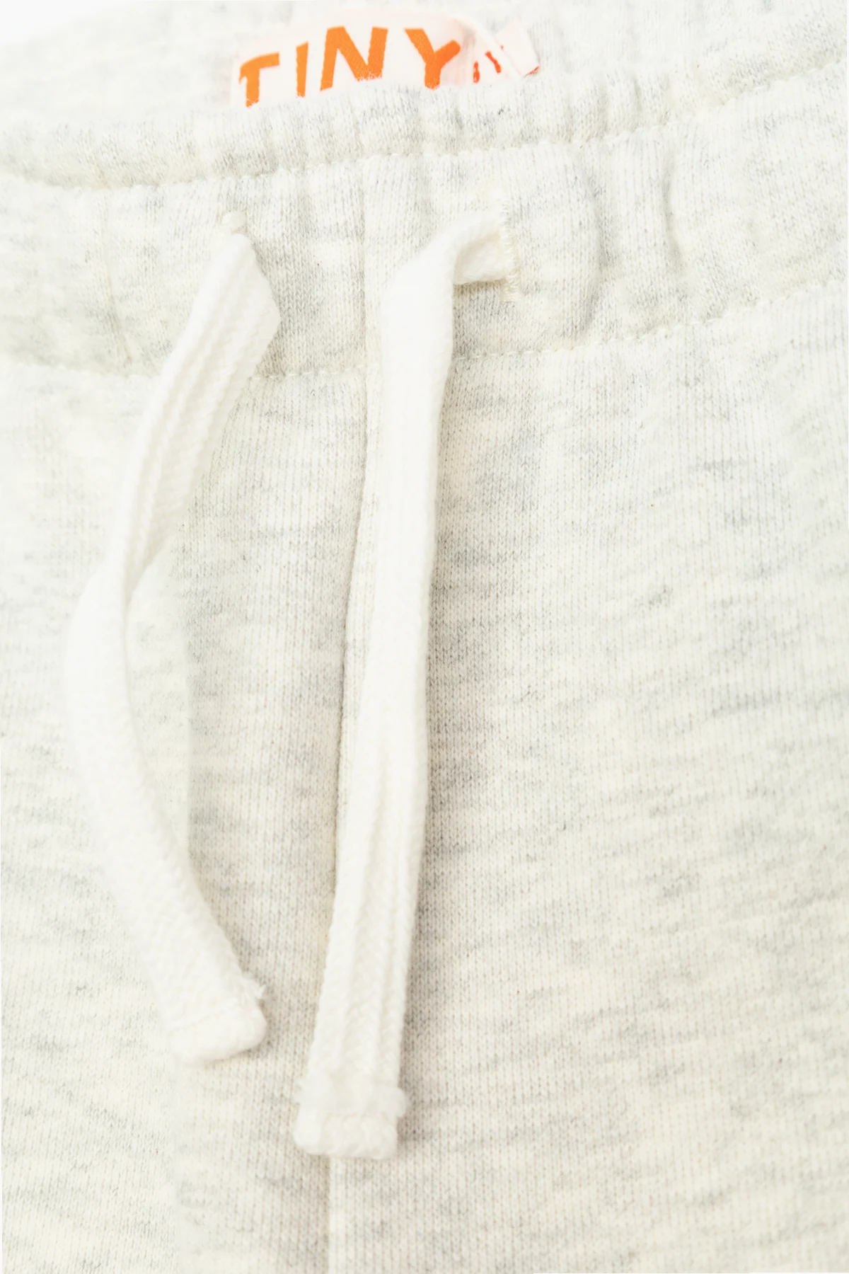 Wyróżnia je jednolity, gładki wzór w eleganckim szarym melanżu. Na przodzie spodni znajduje się subtelny napis "TINY" w jasnym kolorze, który dodaje im unikatowego charakteru. Wewnętrzna metka z napisem "TINY" w kolorze pomarańczowym podkreśla dbałość o detale.