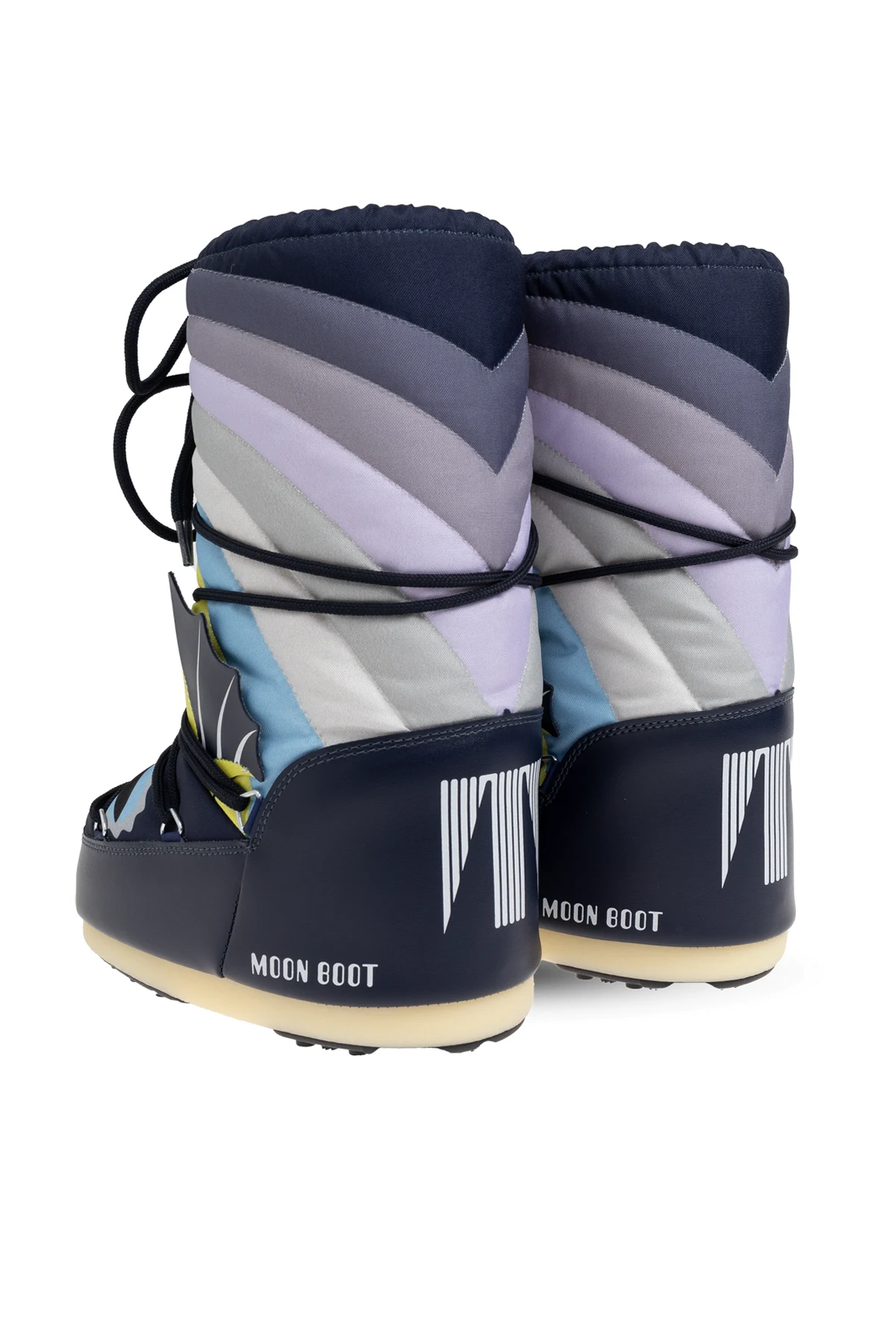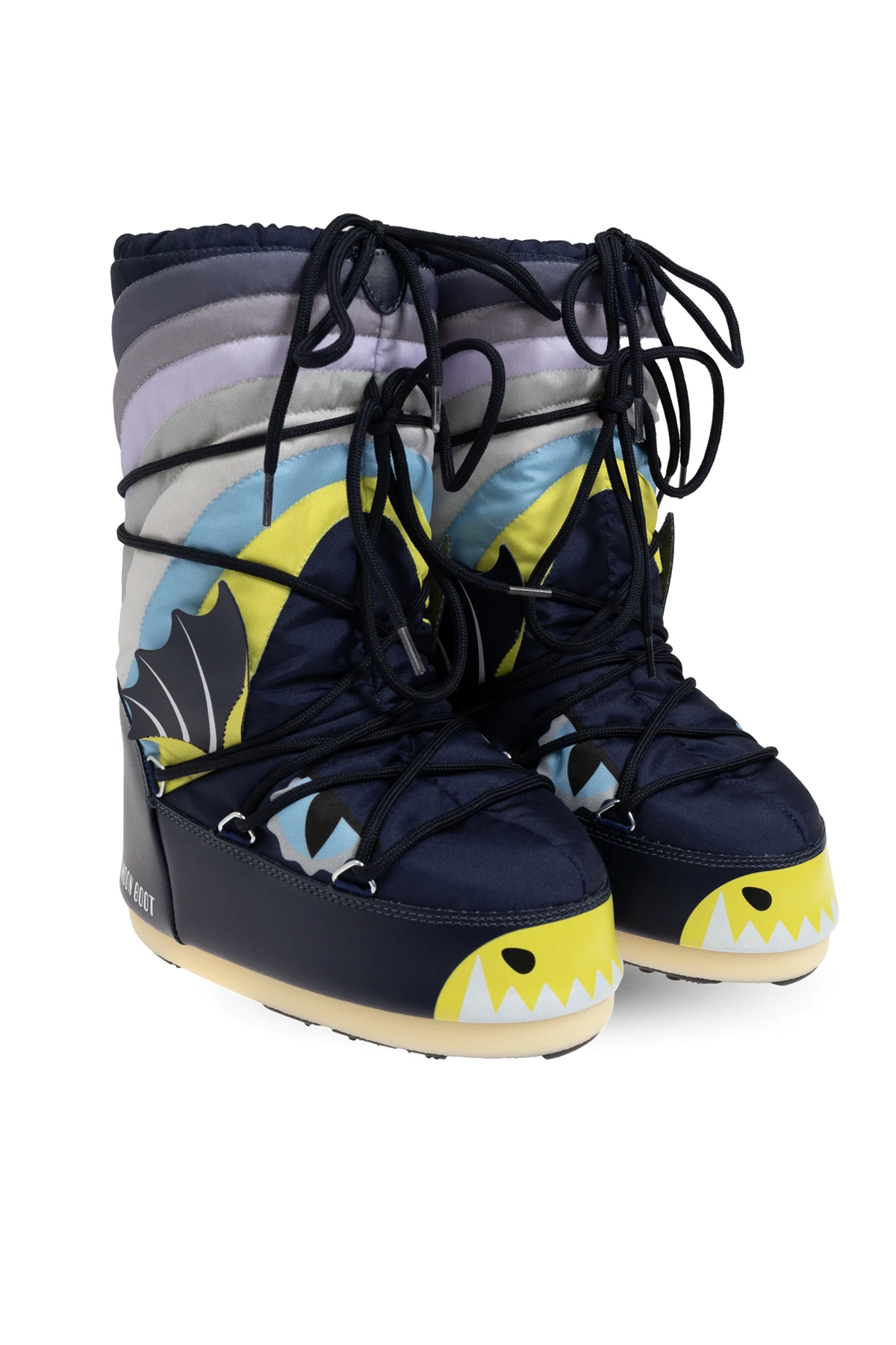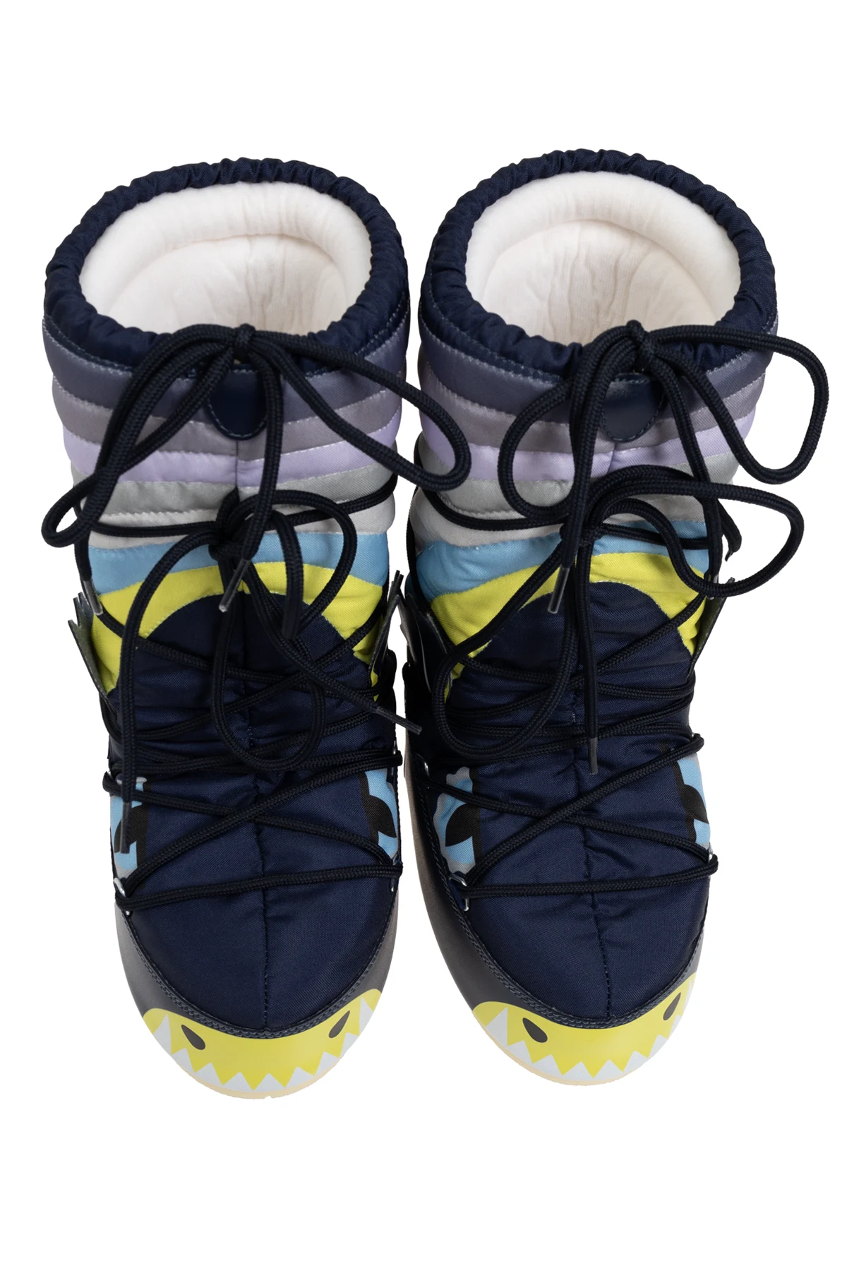 Buty zdobi dynamiczny, wielokolorowy wzór, składający się z falujących linii w kolorach żółtym, niebieskim, szarym, białym i fioletowym, co nadaje im unikalny, przyciągający wzrok wygląd. Na bocznej części oraz na pięcie widnieje napis "MOON BOOT" w białym kolorze, podkreślający ekskluzywny charakter marki. Przód buta ozdobiony jest żółtym motywem przypominającym smocze zęby, co dodaje im charakteru i unikalności. Sznurowanie pozwala na dostosowanie obuwia do stopy dziecka, zapewniając lepsze dopasowanie i komfort noszenia.