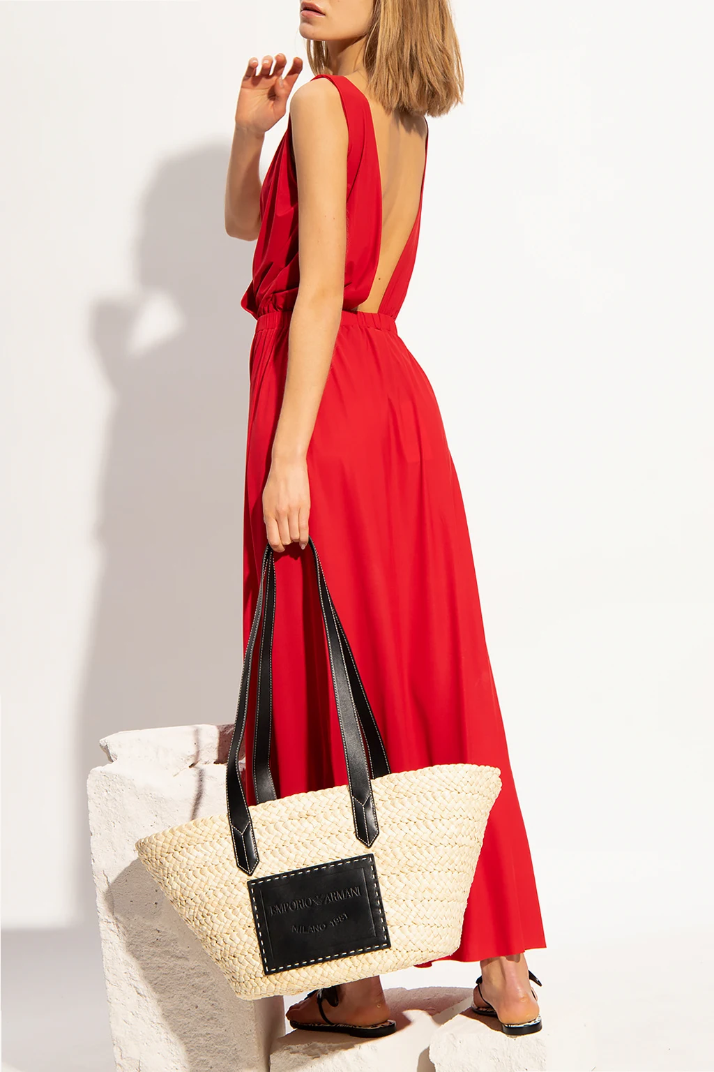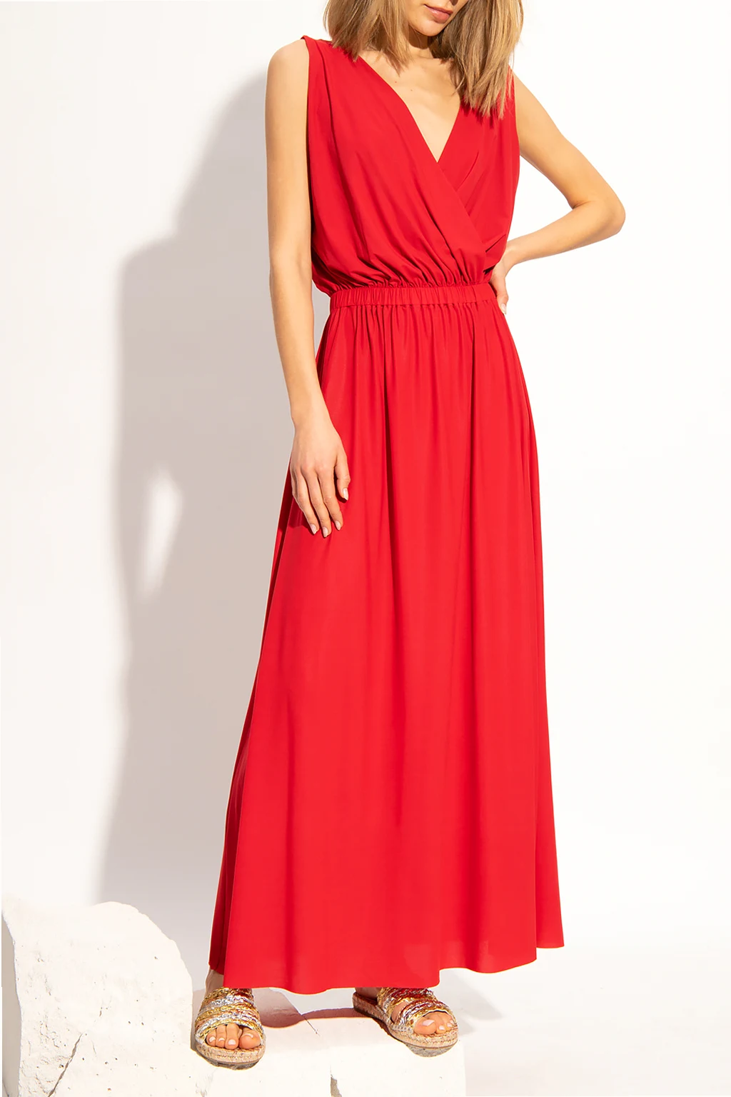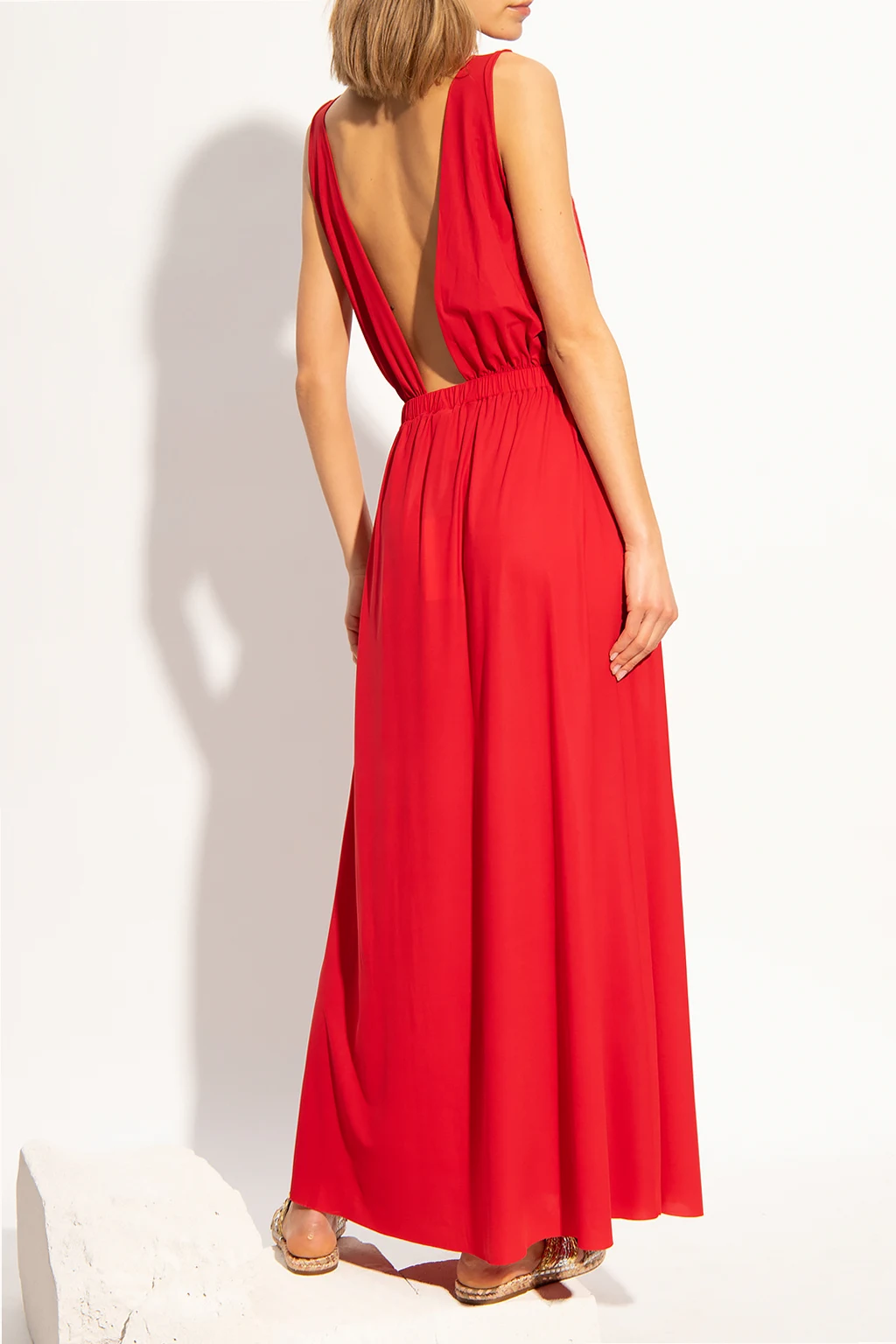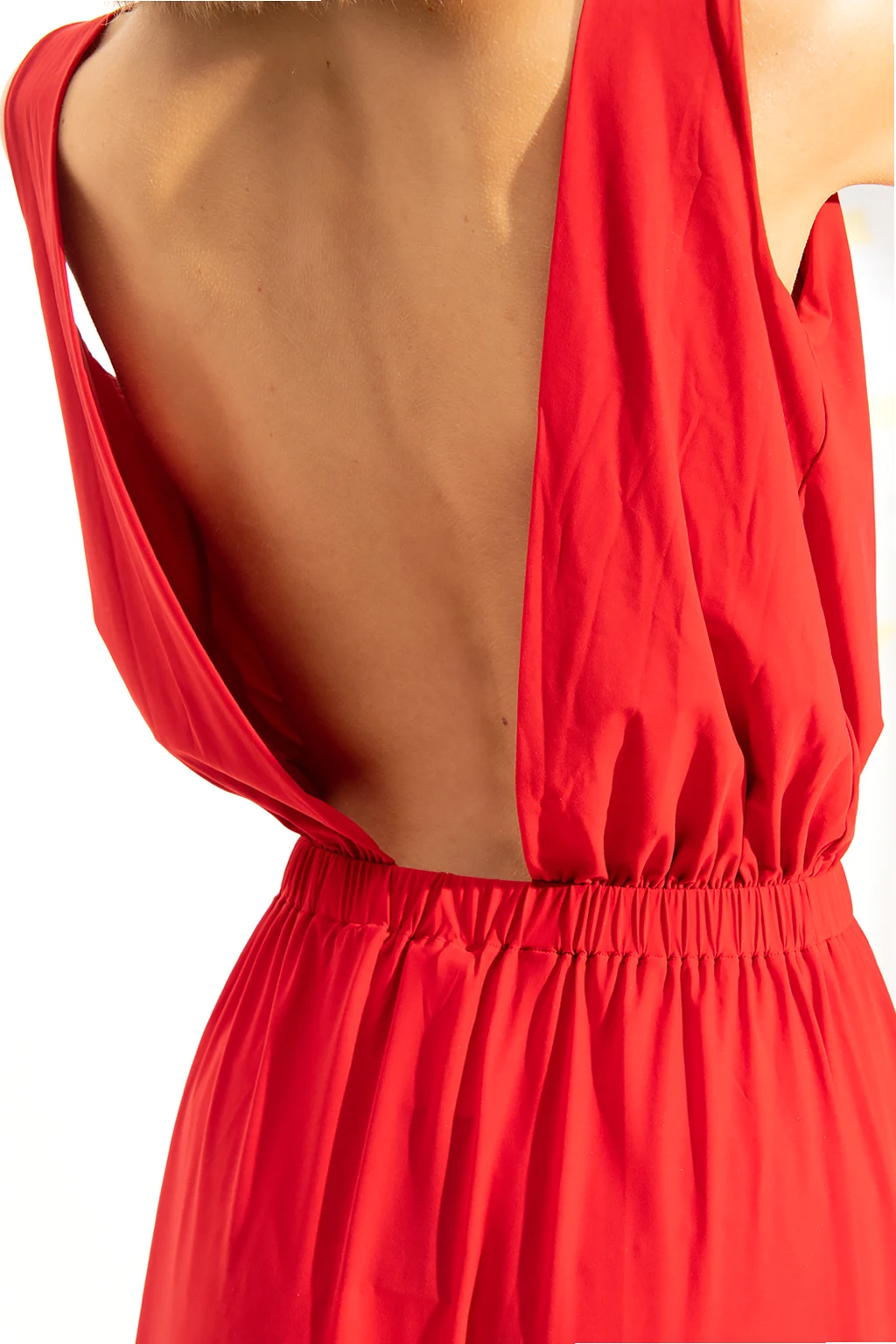 Czerwona, długa sukienka na ramiączka Pain de Sucre. W talii wszyta guma. Głębokie wycięcie na plecach.