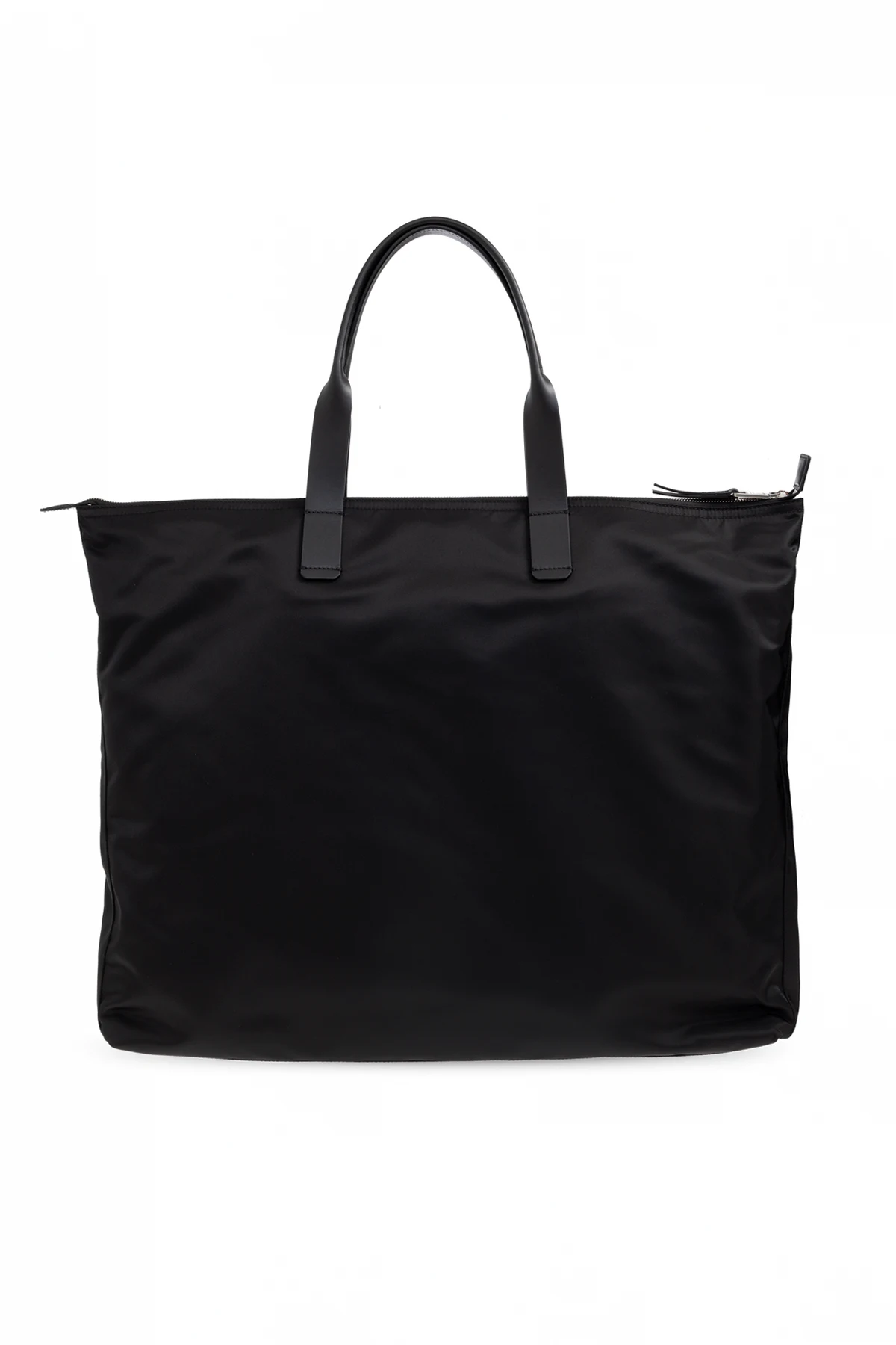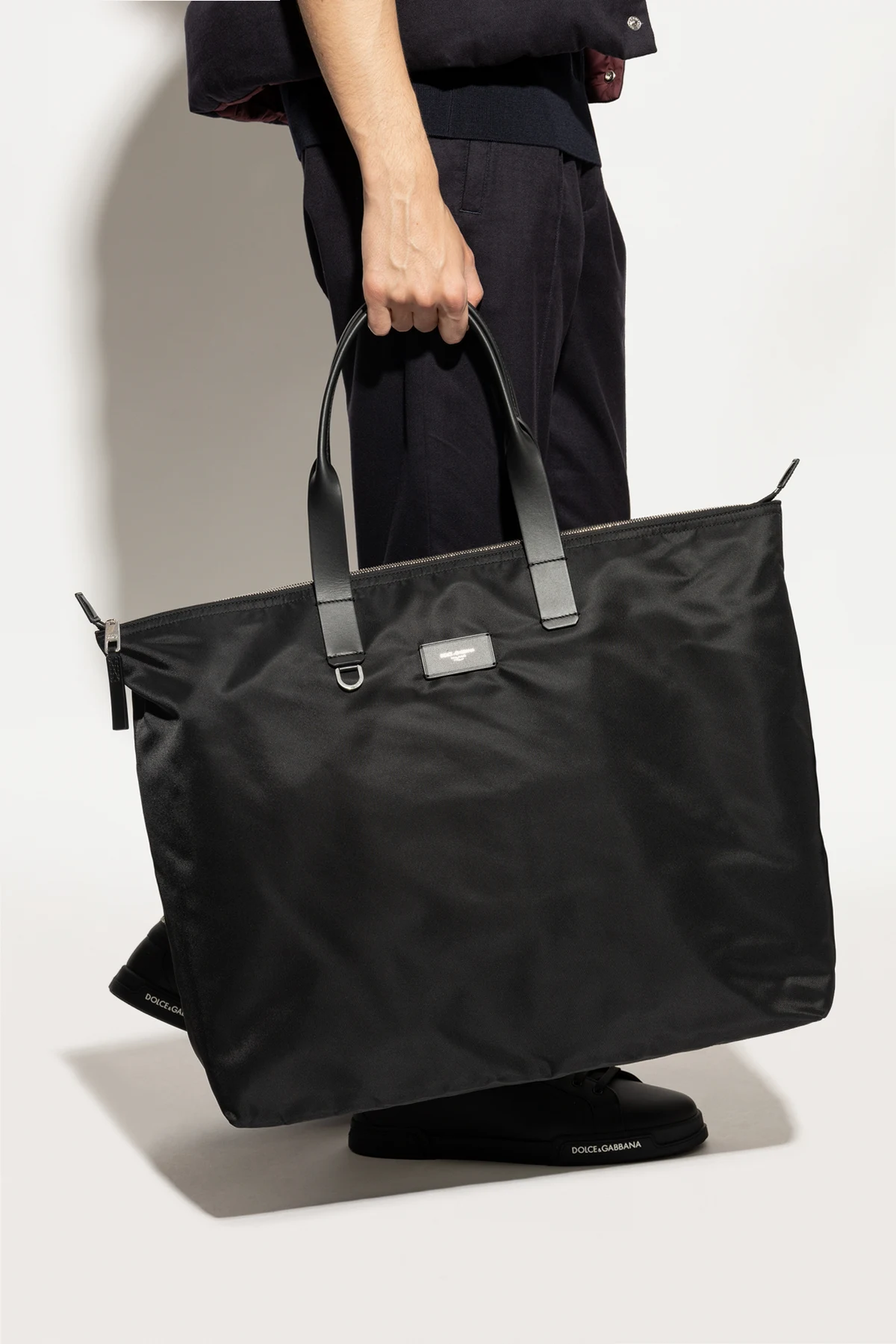 Torba typu „shopper” marki Dolce & Gabbana to synonim wyrafinowanej elegancji oraz współczesnego luksusu. Prostokątny, przestronny fason o płaskim dnie pozwala z łatwością pomieścić codzienne niezbędniki, zachowując przy tym nienaganną prezencję. Szlachetna, gładka tkanina techniczna w głębokiej czerni subtelnie połyskuje, podkreślając ekskluzywność produktu. Skórzane, czarne uchwyty gwarantują komfort noszenia zarówno w dłoni, jak i na ramieniu.