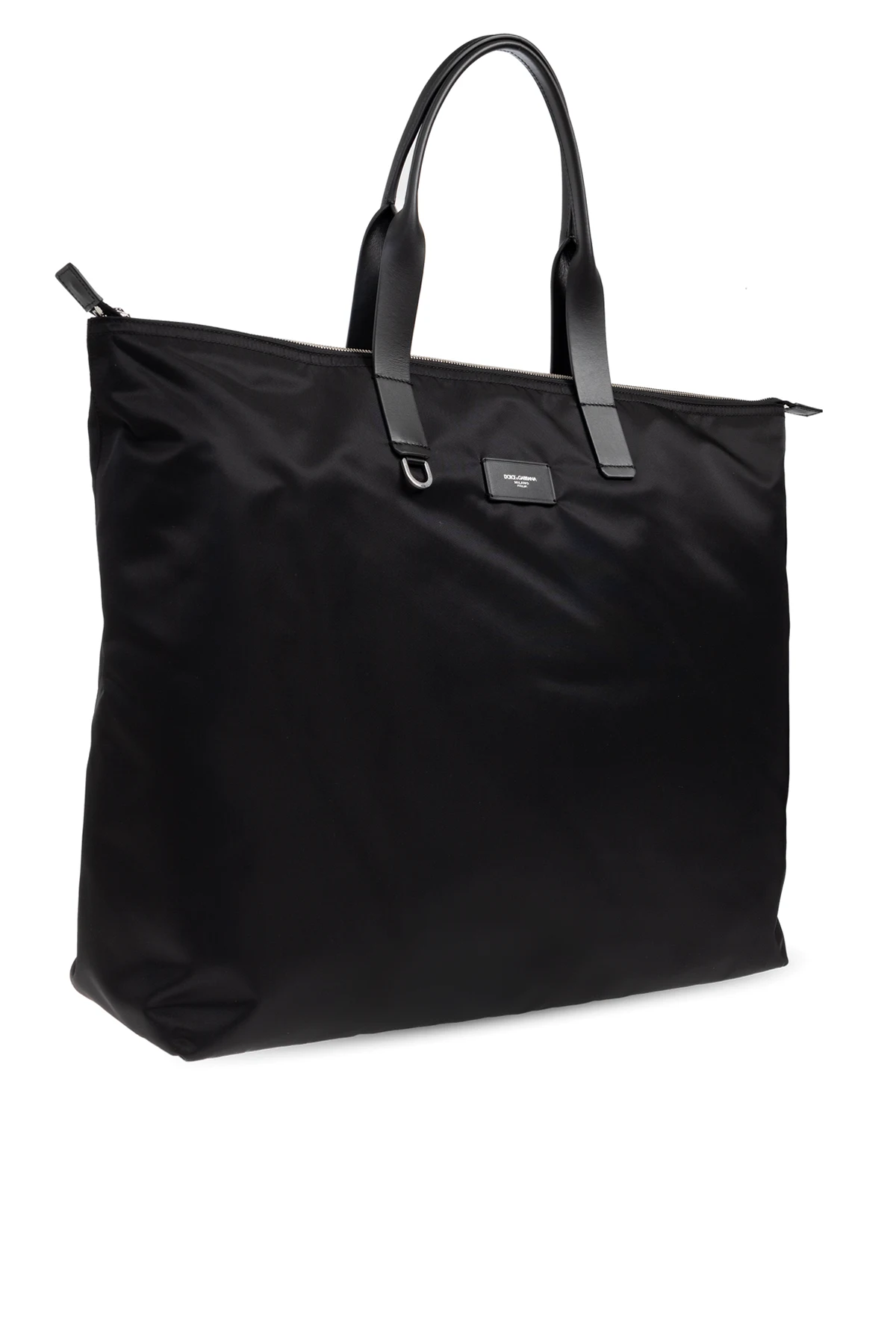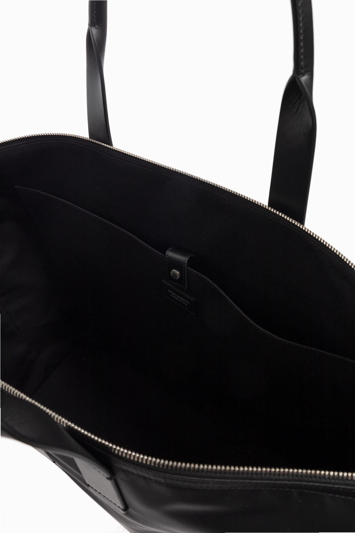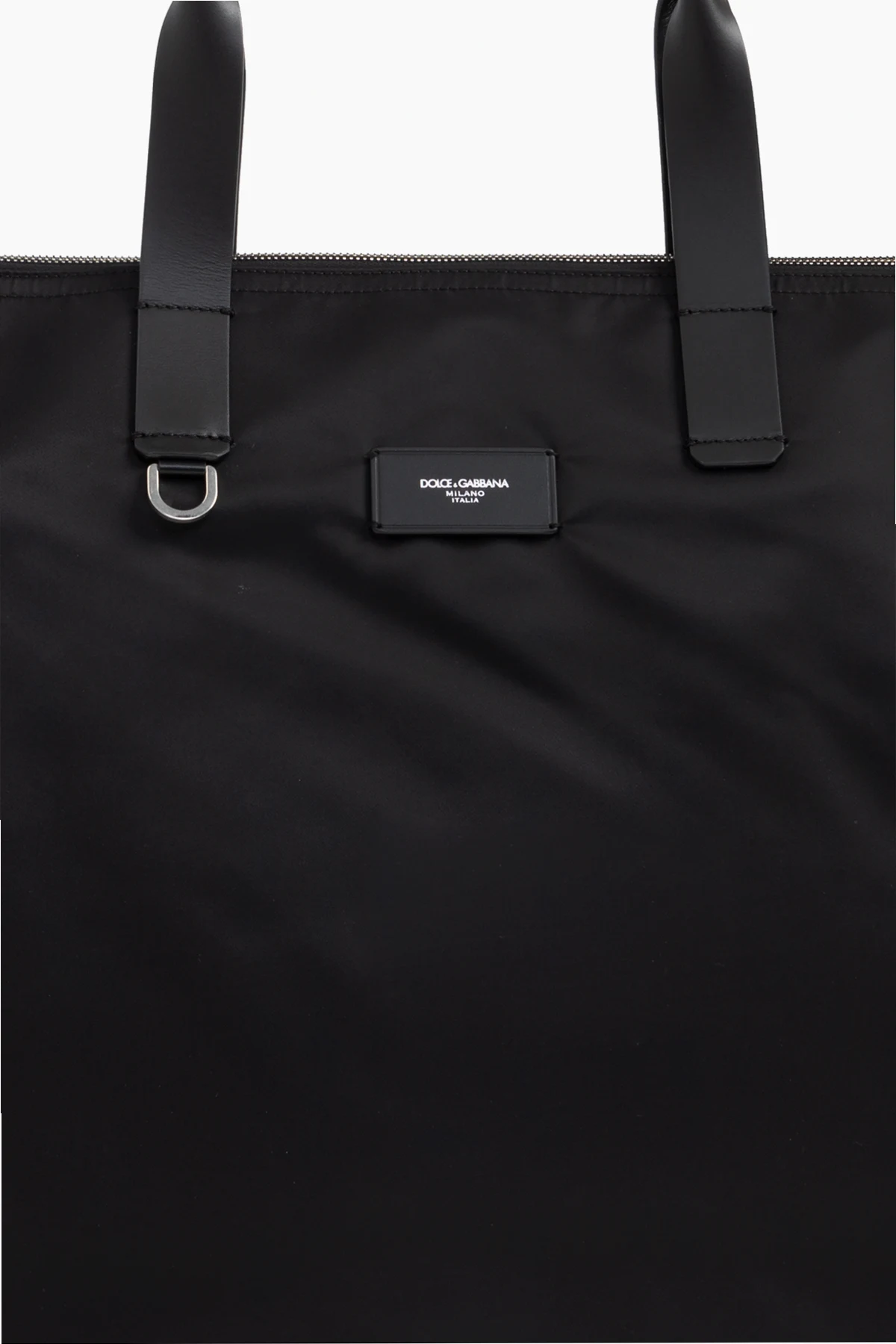 Minimalistyczny front ozdobiony jest elegancką czarną naszywką z kontrastowym napisem „DOLCE & GABBANA – Milano Italia”, co świadczy o autentyczności oraz światowym prestiżu marki. Konstrukcję dopełnia srebrny, metalowy detal w formie kółka, umożliwiający indywidualne ozdobienie torby według własnego gustu.