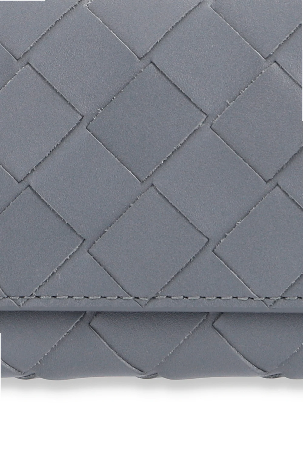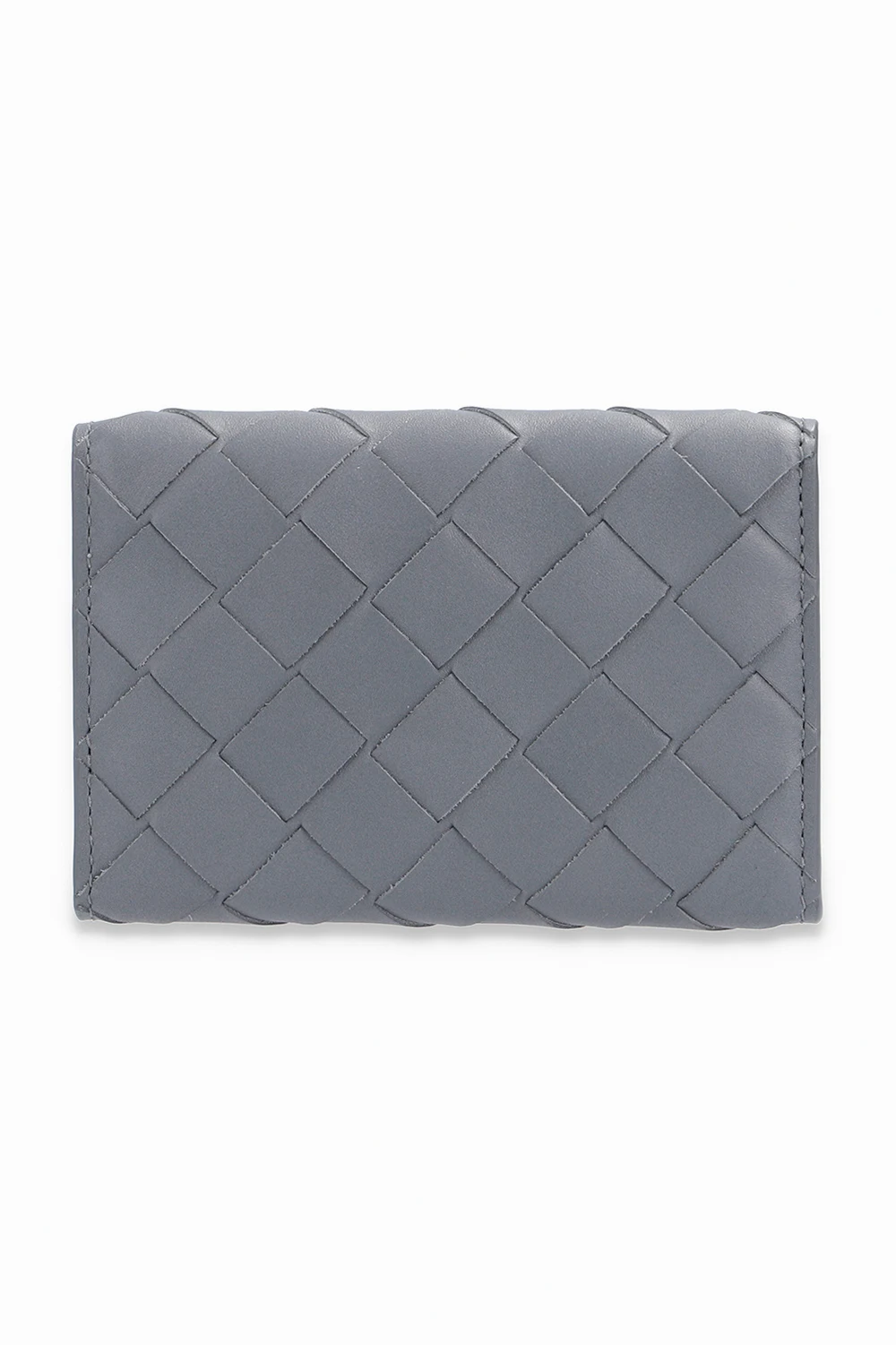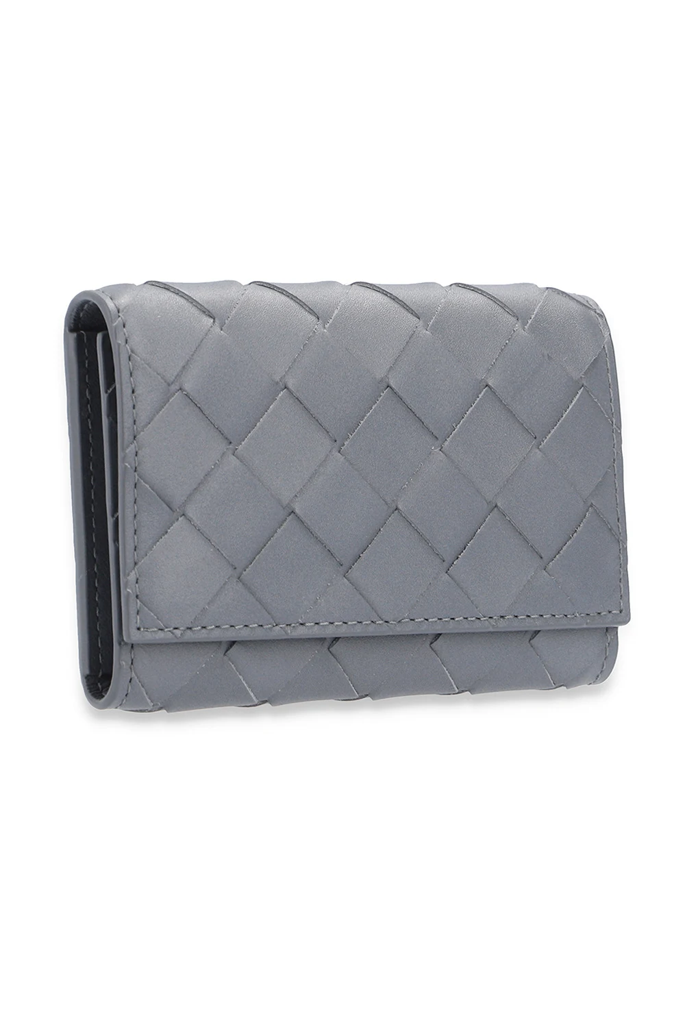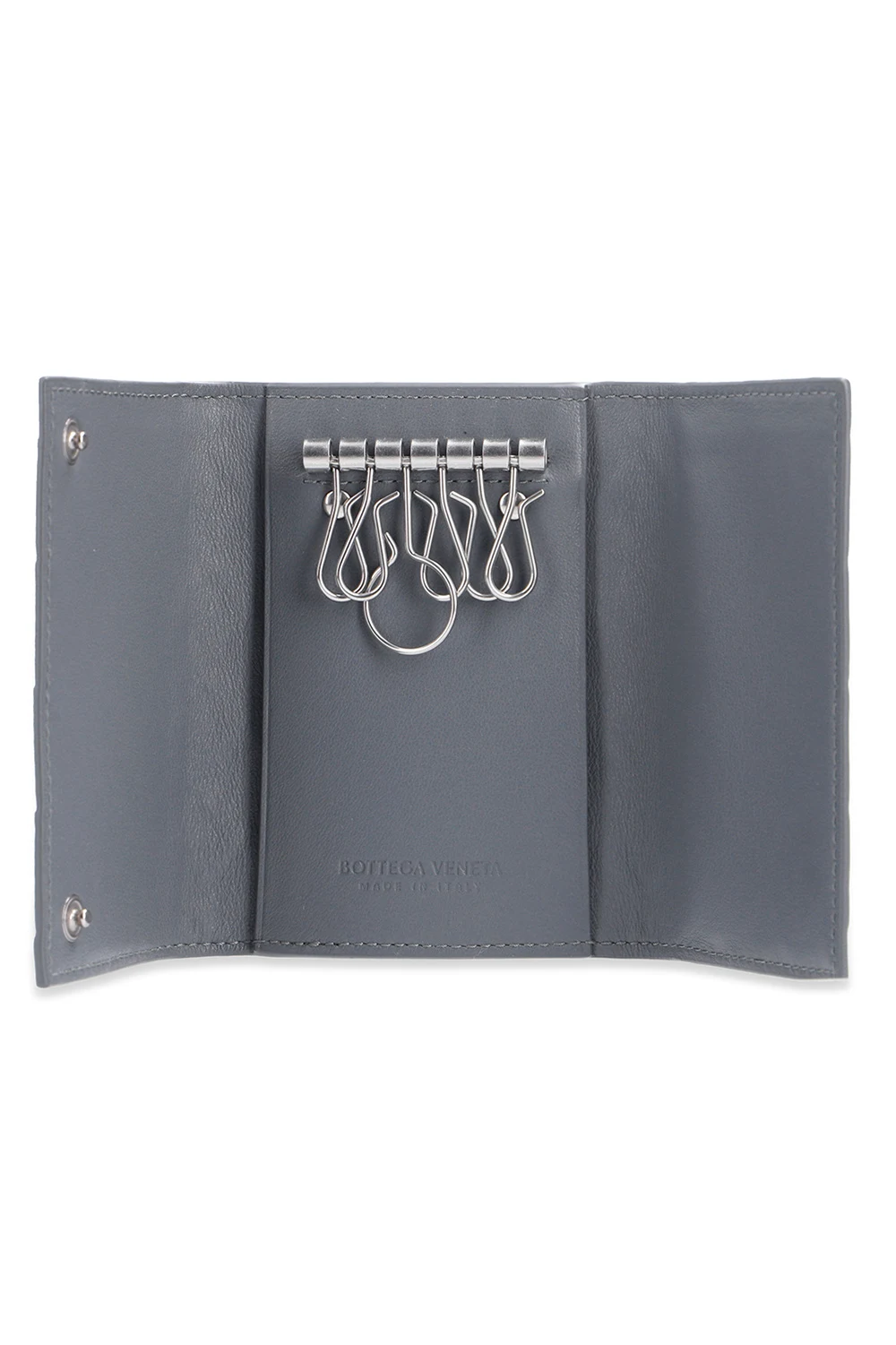 Szare etui na klucze Bottega Veneta. Wykonane z cielęcej skóry. Zamykane na zatrzaski. Wewnątrz sześć haczyków.