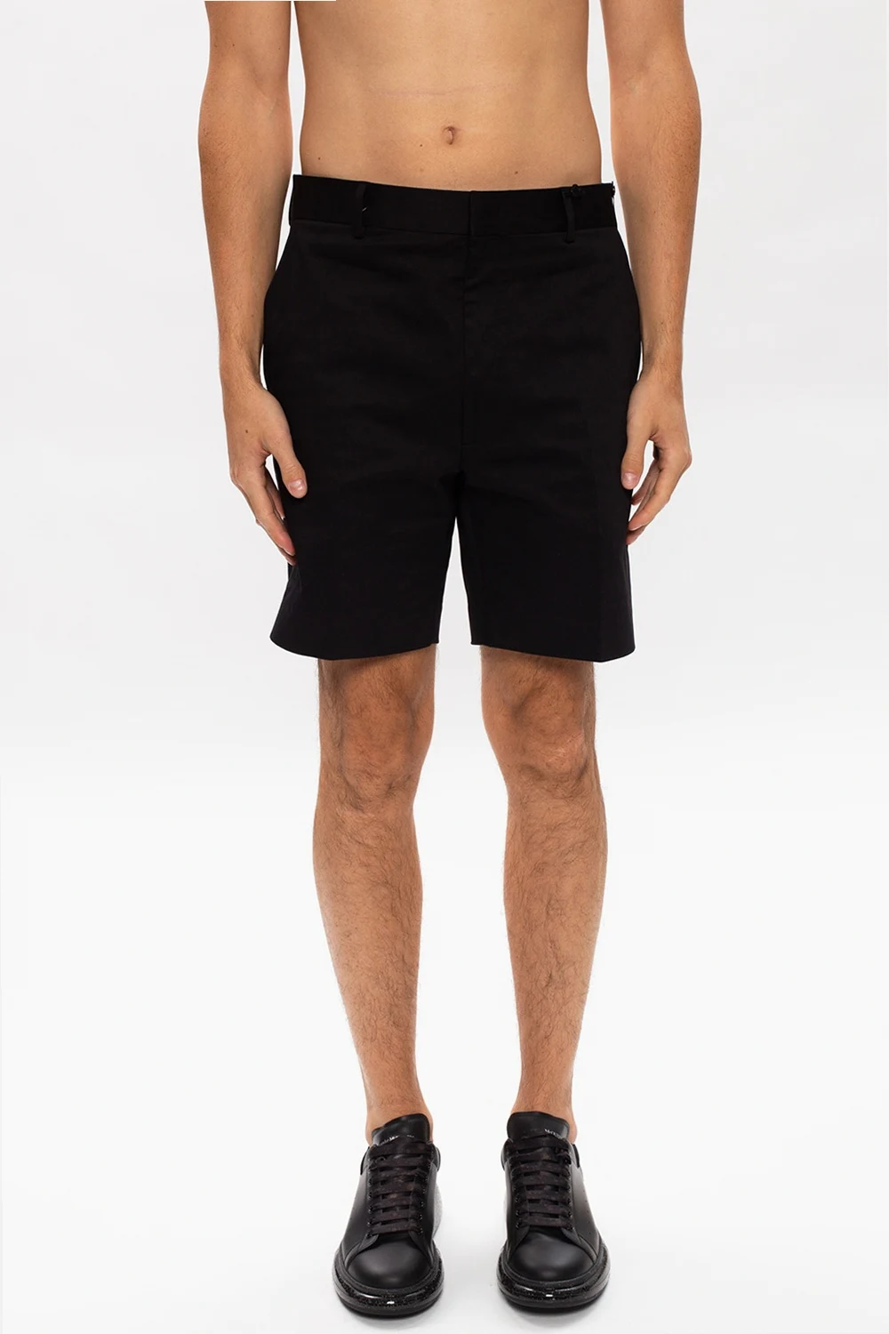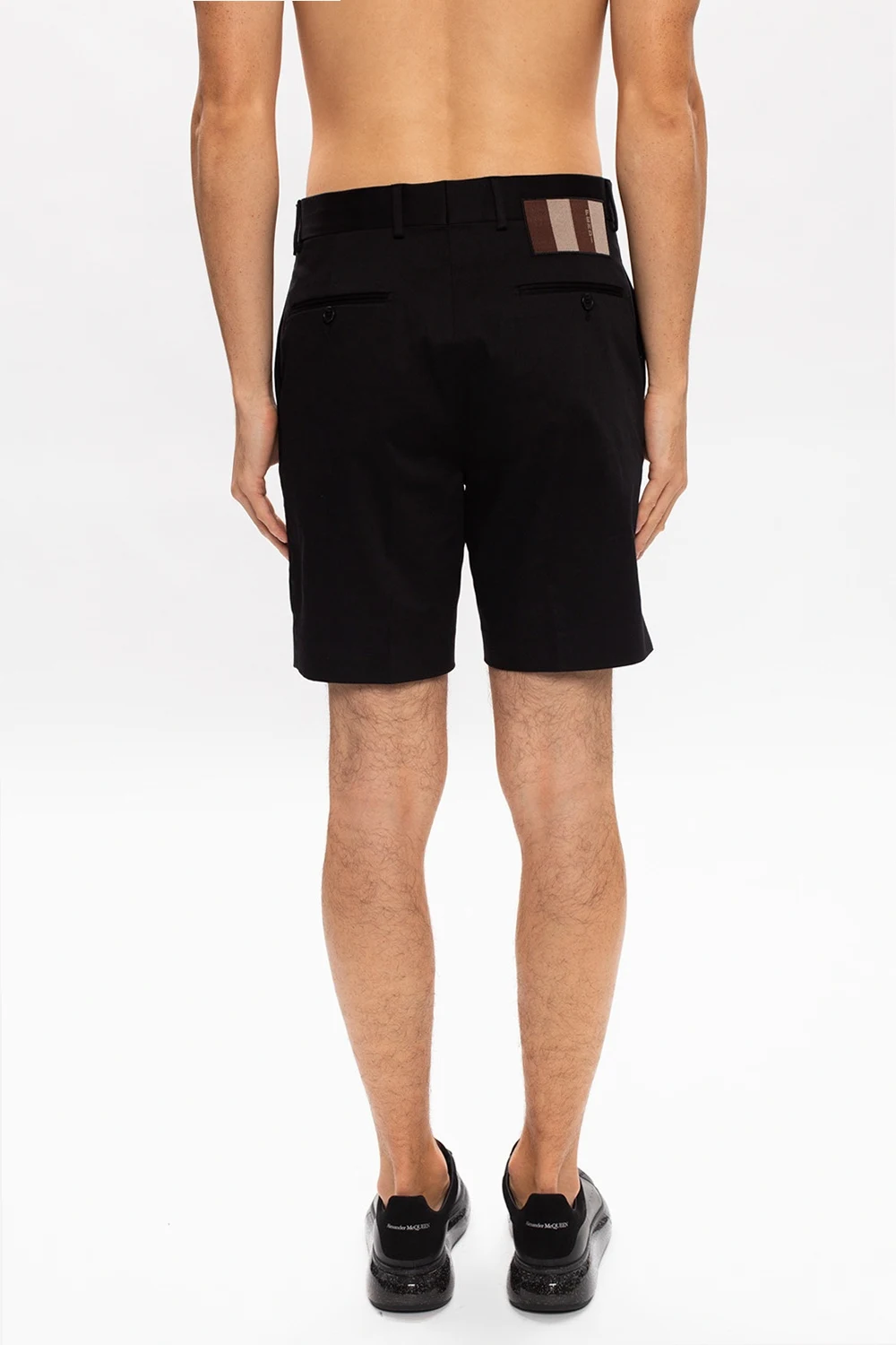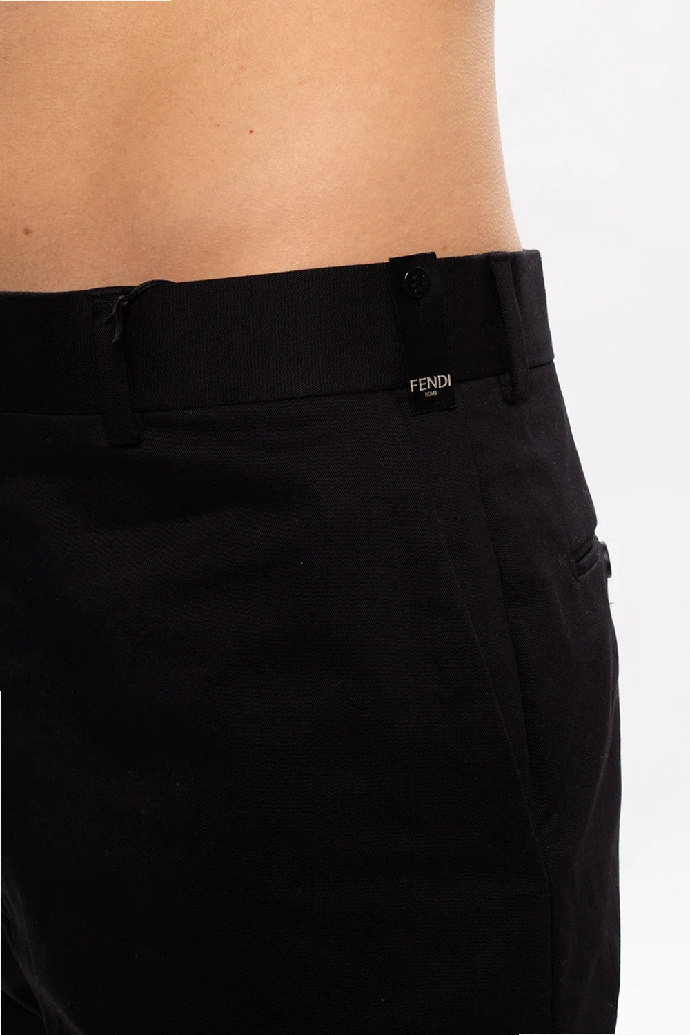 Czarne, bawełniane szorty Fendi. Zapinane na zamek, zaczep i guzik. Z przodu dwie kieszenie. Z tyłu dwie kieszenie zapinane na guzik.