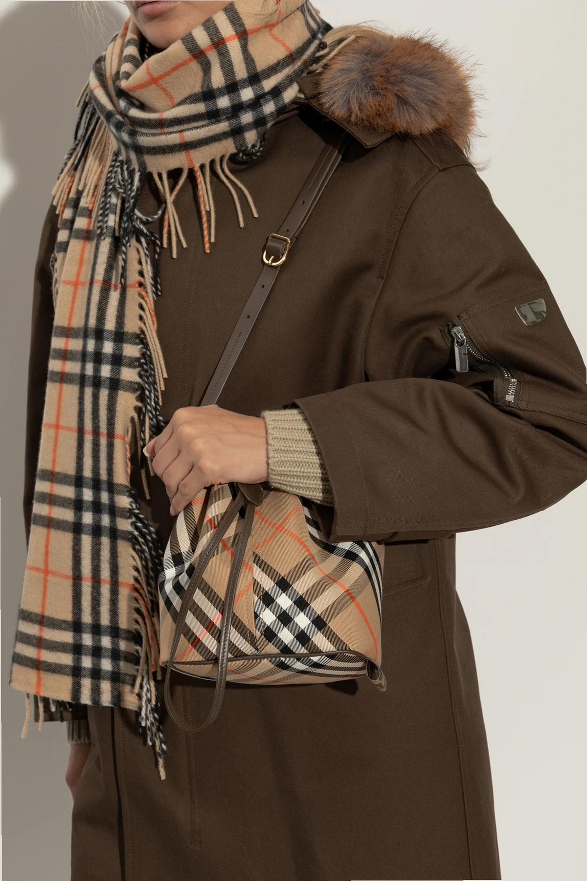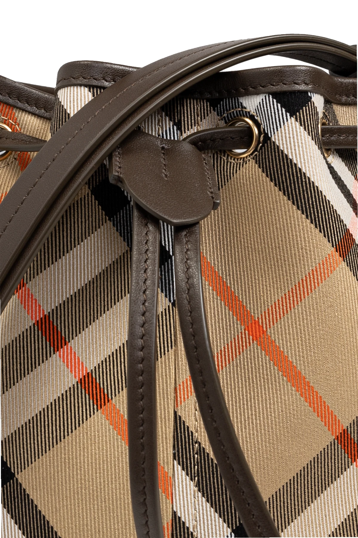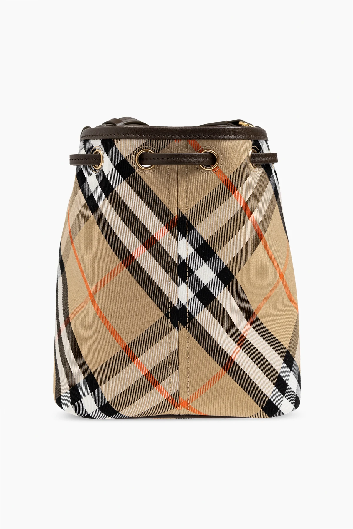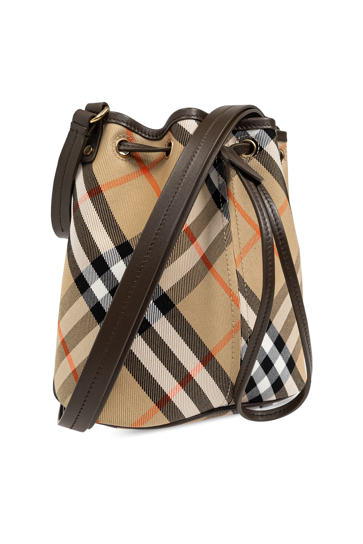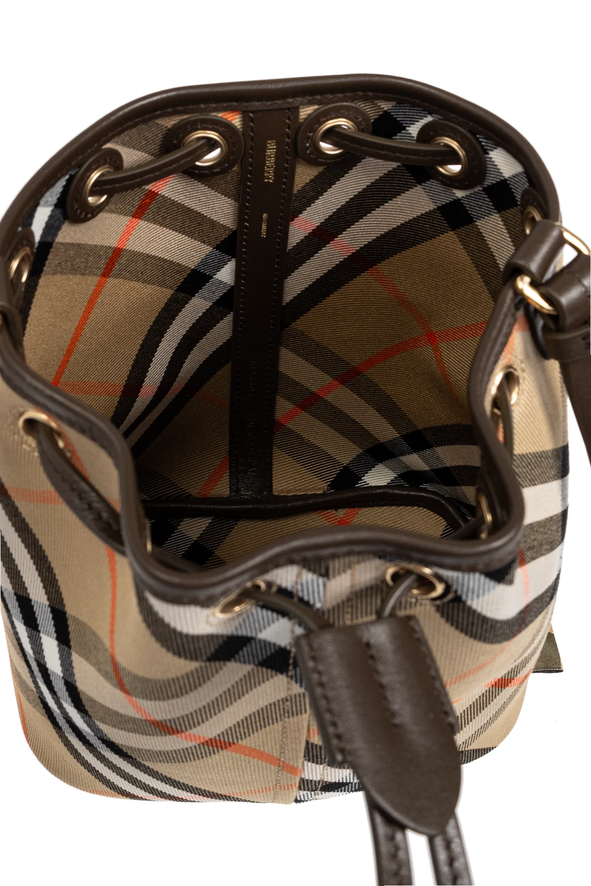 Prezentujemy Państwu torbę na ramię typu "bucket" z ekskluzywnej kolekcji renomowanej marki Burberry. Ten wyjątkowy produkt odznacza się klasycznym cylindrycznym kształtem, który wyróżnia się elegancją i funkcjonalnością. Torba posiada otwartą górę, ściąganą za pomocą stylowych troków, co nadaje jej wyrafinowany charakter.