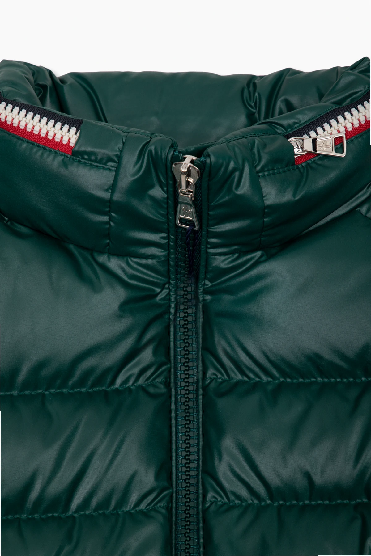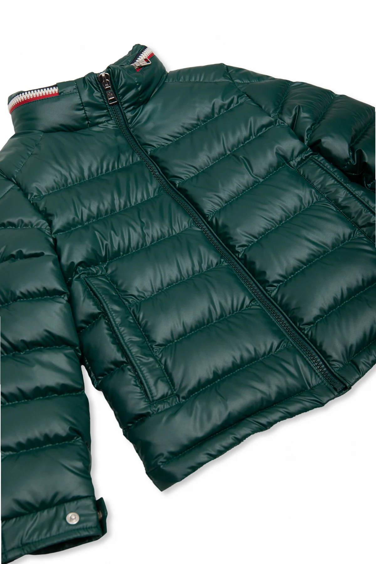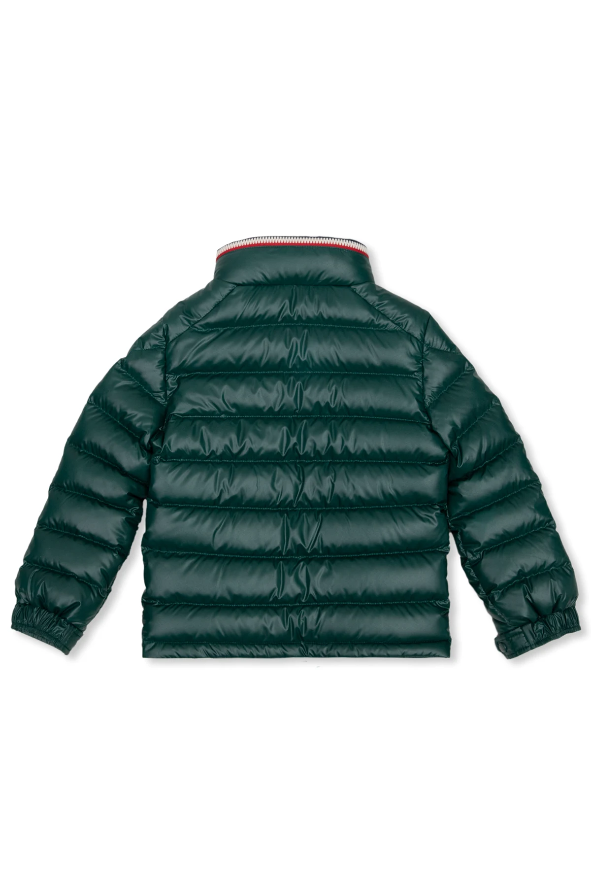 Zielona, pikowana kurtka puchowa z kapturem, model ‘Bourne’ Moncler Enfant. Zapinana na zamek. Kaptur chowany w stójce. Na rękawie naszywka z logo. Dwie kieszenie zapinane na zatrzask. Długie rękawy zakończone ściągaczem i zapięciem na zatrzask.